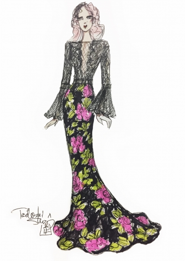 花柄のブロケードは、豪華なコートを引き立てる。ジェンダーレスなストライプは、ギターの弦のように歯切れよく、センターステージに踊りだす。手触りの良い、鮮やかなロイヤルブルー、フォレストグリーン、そして真紅のベルベットのガウンが、大胆に自己を主張する。輝くスパンコールの流麗なドレープがボディラインを美しく飾って。