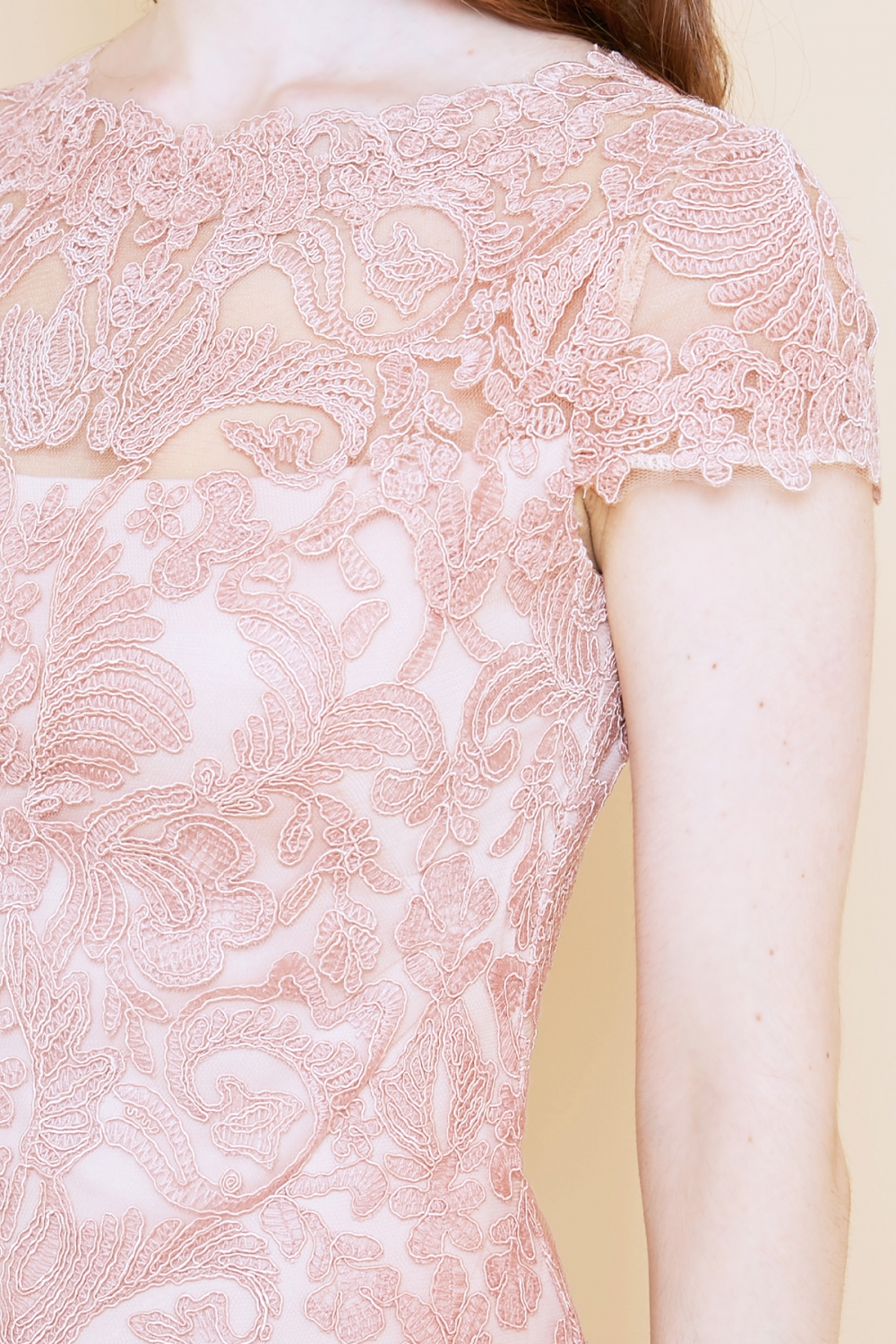 立体感のある繊細なコードレースをチュールの上に重ねたこのドレスは、エレガントな印象を与えてくれます。 キャップスリーブやタイトなラインなど上品なデザインに、清楚なピンクで華やかさを加え、様々なシーンで着用いただける一着になっています。 裏地はTADASHI SHOJIの代表的なジャージー生地を使用し、着心地の良さもおススメできるドレスです。 モデルサイズ 身長175cm B:84cm W:60cm H:89cm /サイズ2着用 ■新作商品一覧はこちら■ □ミディアムドレス一覧はこちら□ ■デイリードレス一覧はこちら■ □コードレースの商品一覧はこちら□ ■ピンクの商品一覧はこちら■