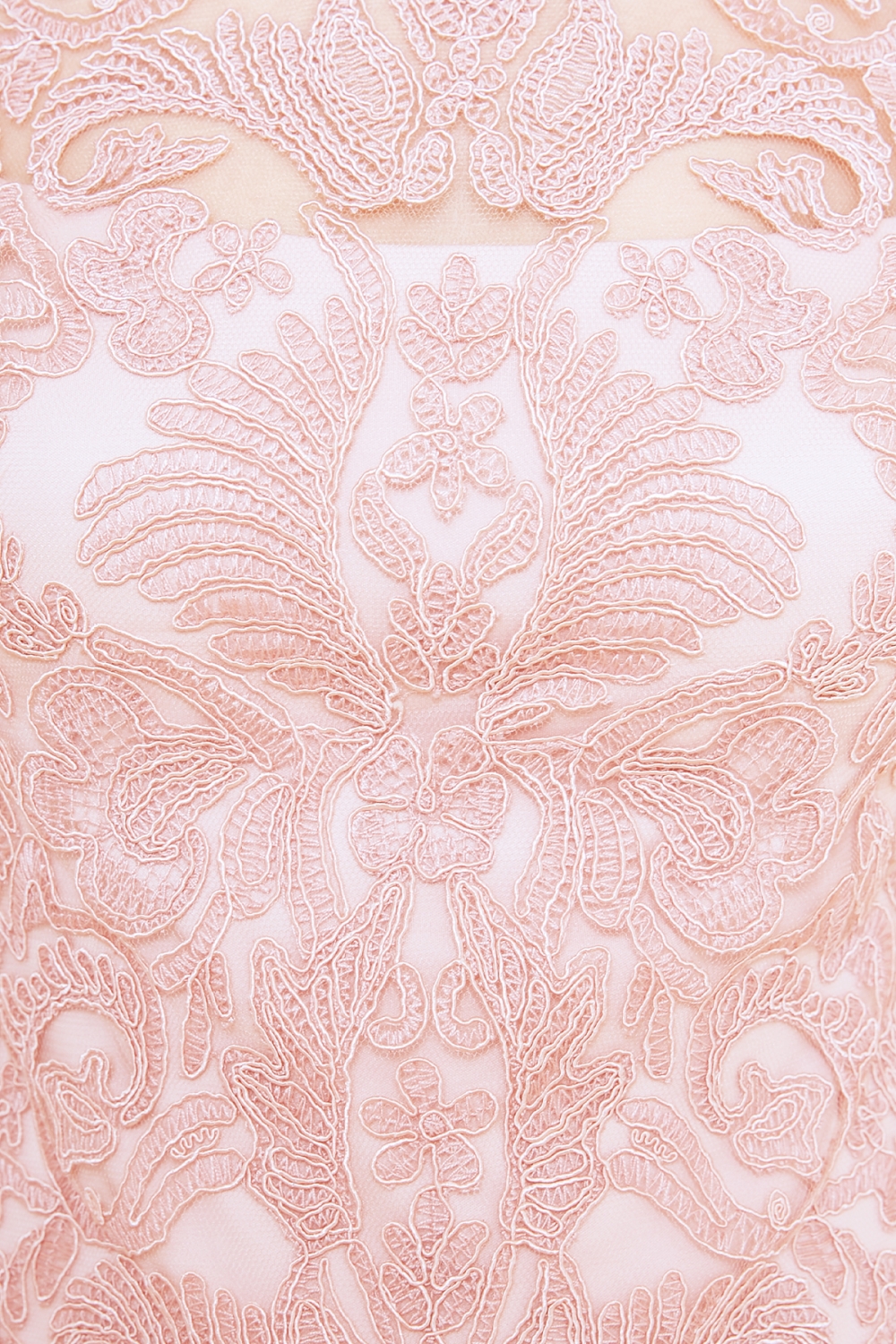 立体感のある繊細なコードレースをチュールの上に重ねたこのドレスは、エレガントな印象を与えてくれます。
