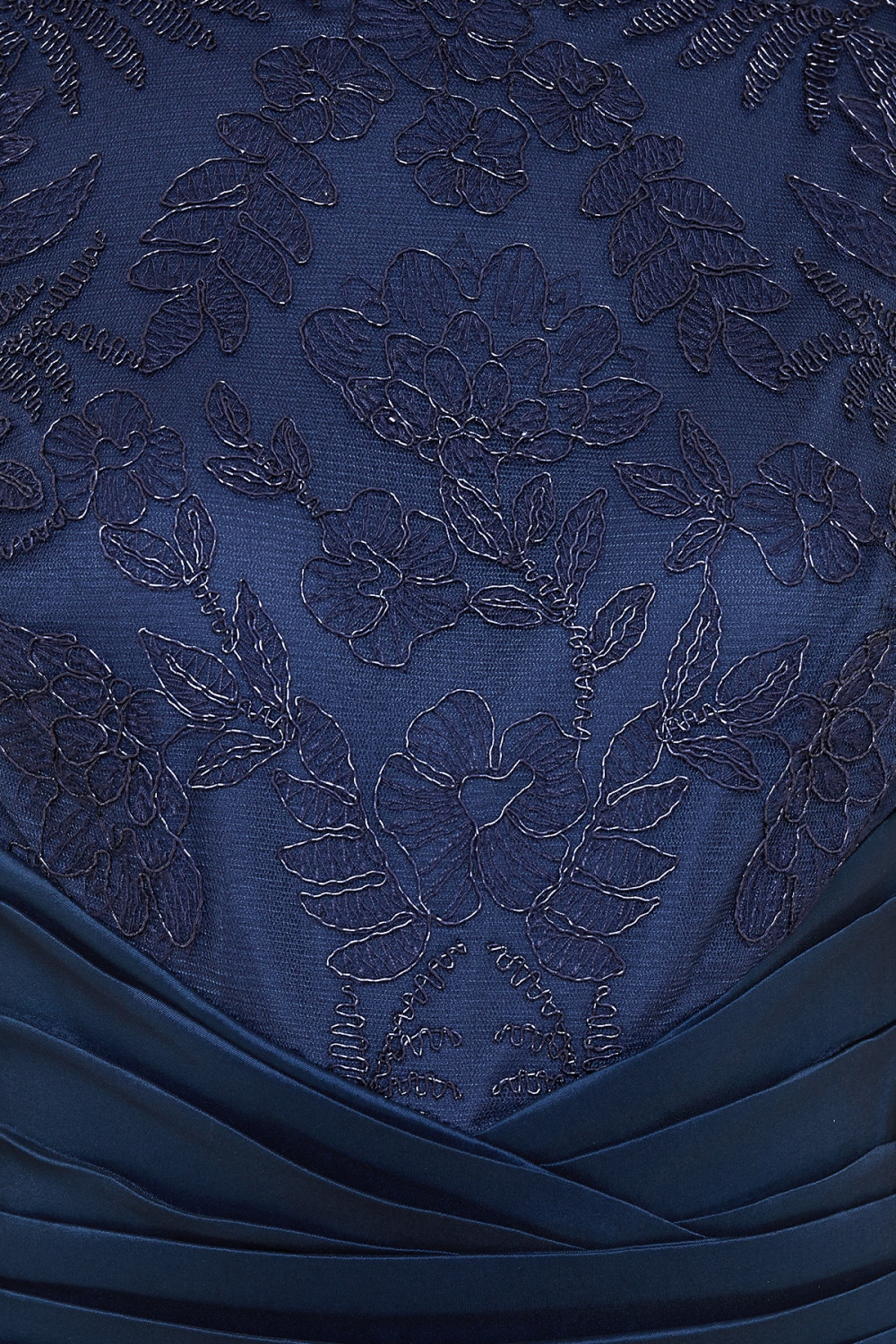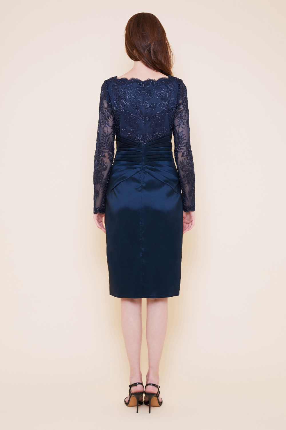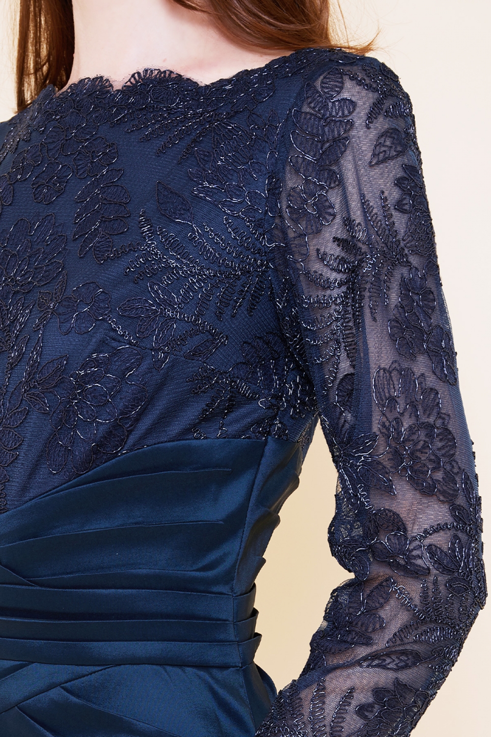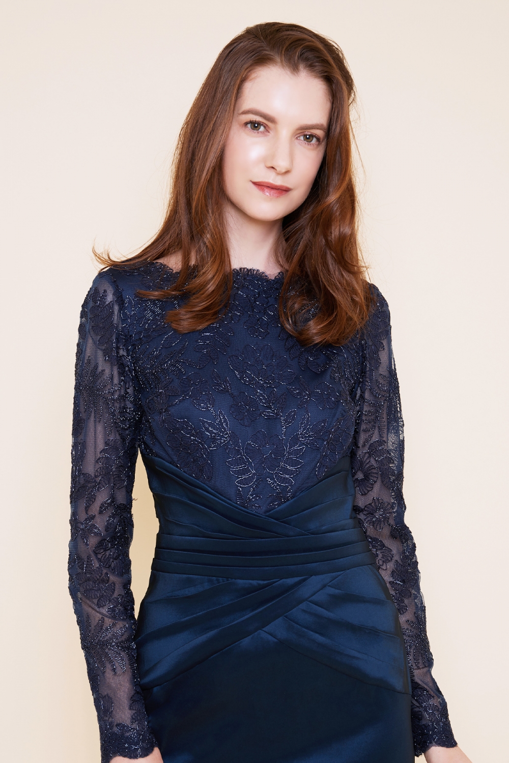 繊細なコードレースに適度な光沢のタフタ生地を合わせたドレスは、フォーマルな場やビジネスディナーなど、きちんとした服装が求められる場でも使えるドレスです。