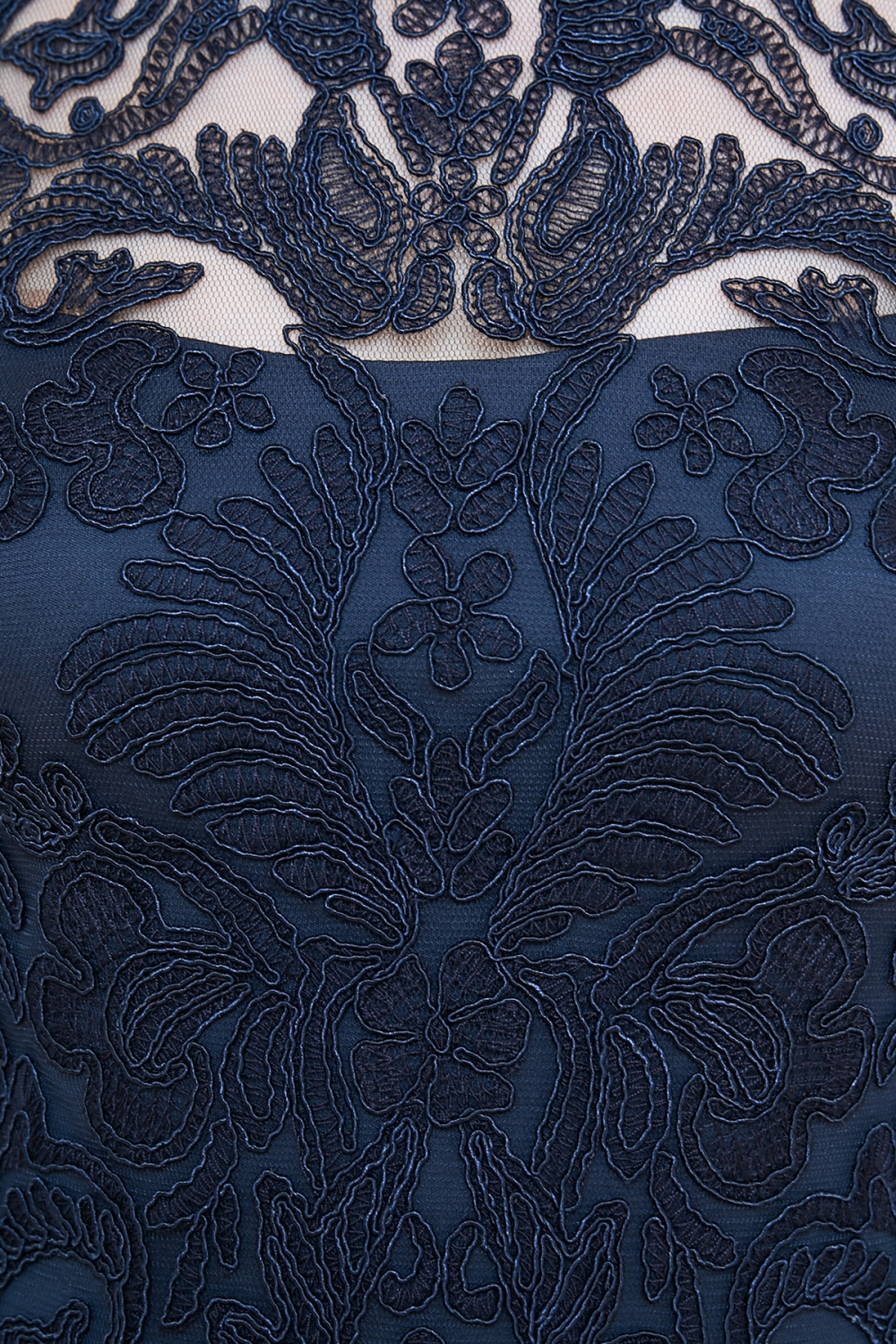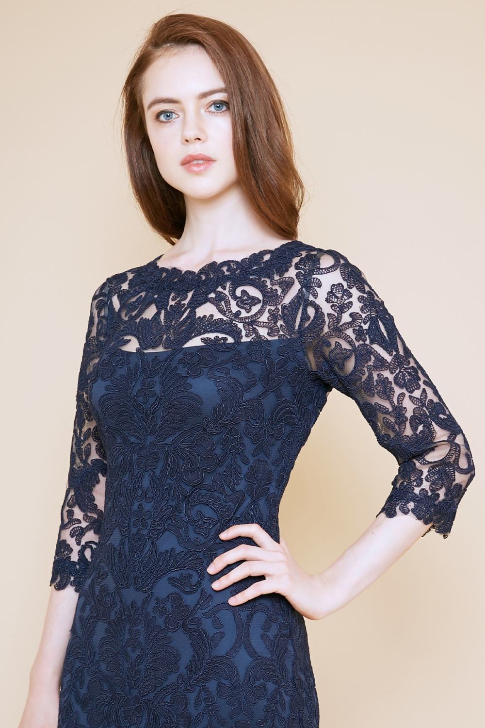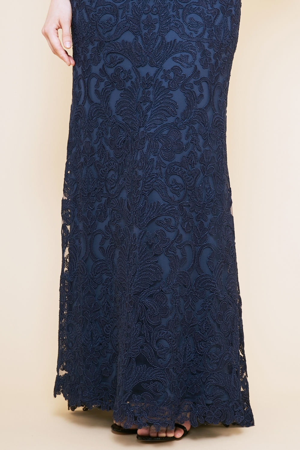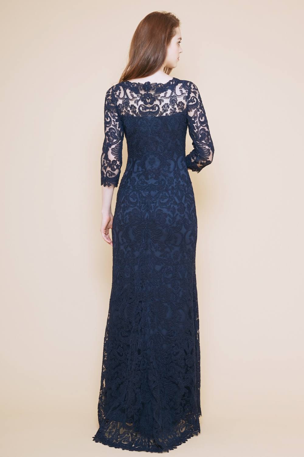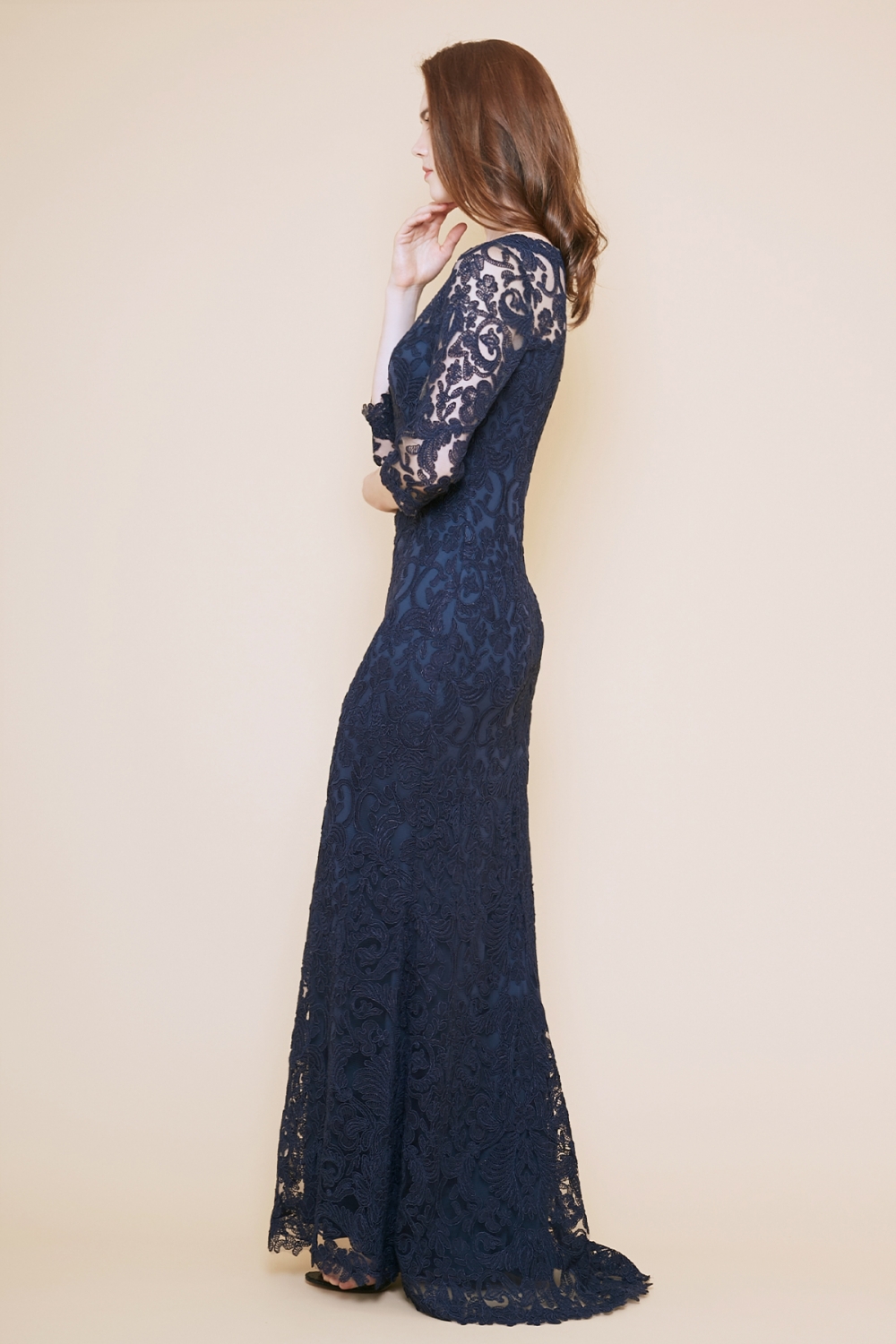 TADASHI SHOJIの代表的なコードレースを使用したドレスの袖付きロングドレス。