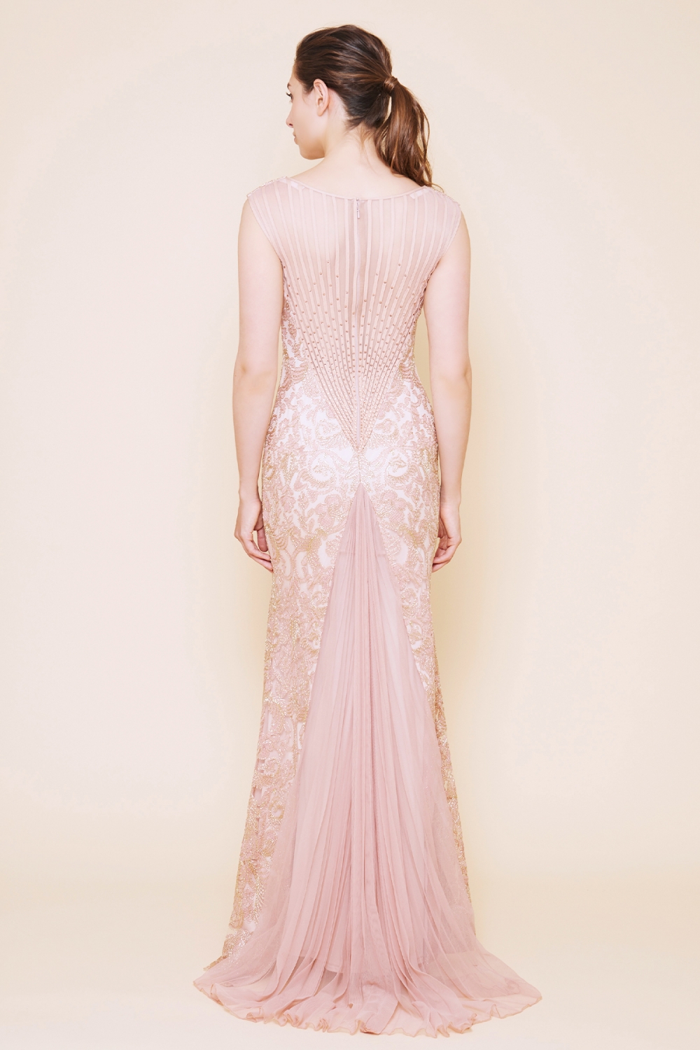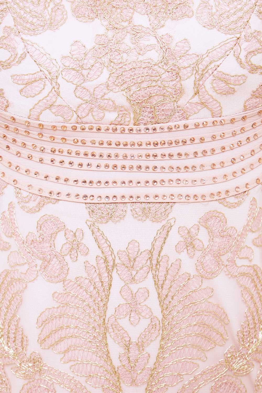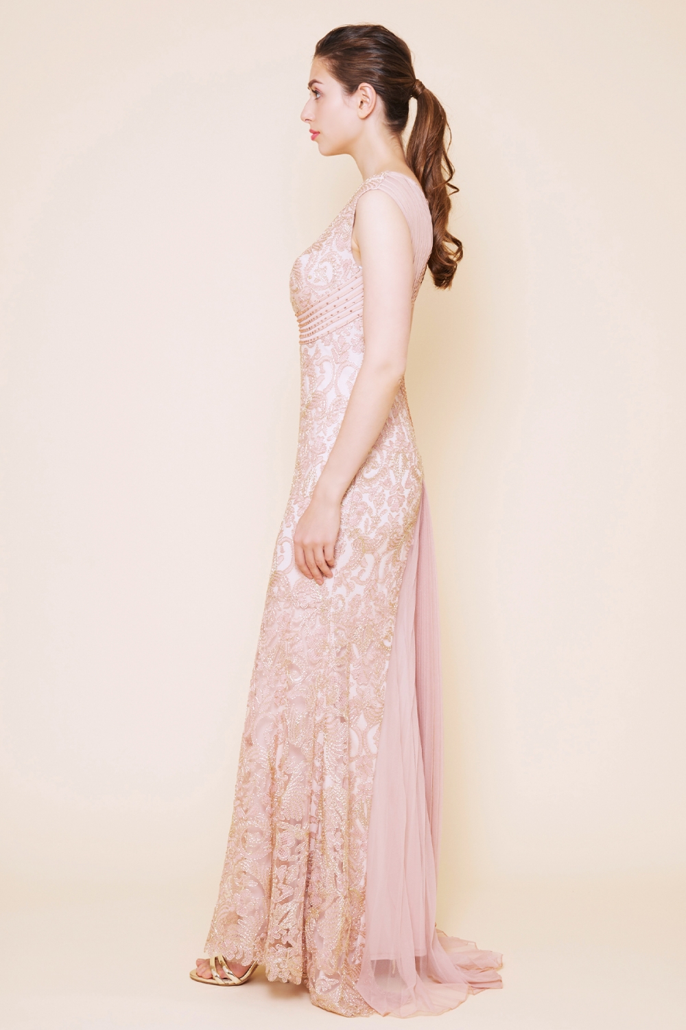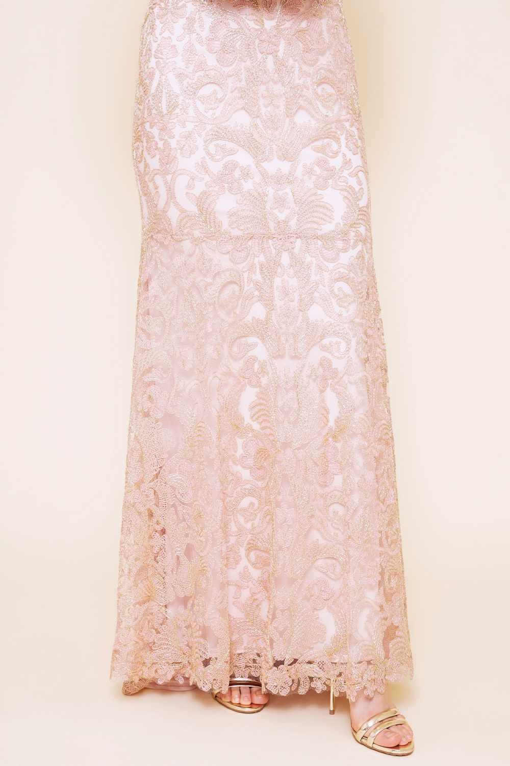 ピンクにゴールドの金糸が上品なコードレースや、散りばめられたラインストーンがキラキラと輝き、華やかな印象のロングドレス。