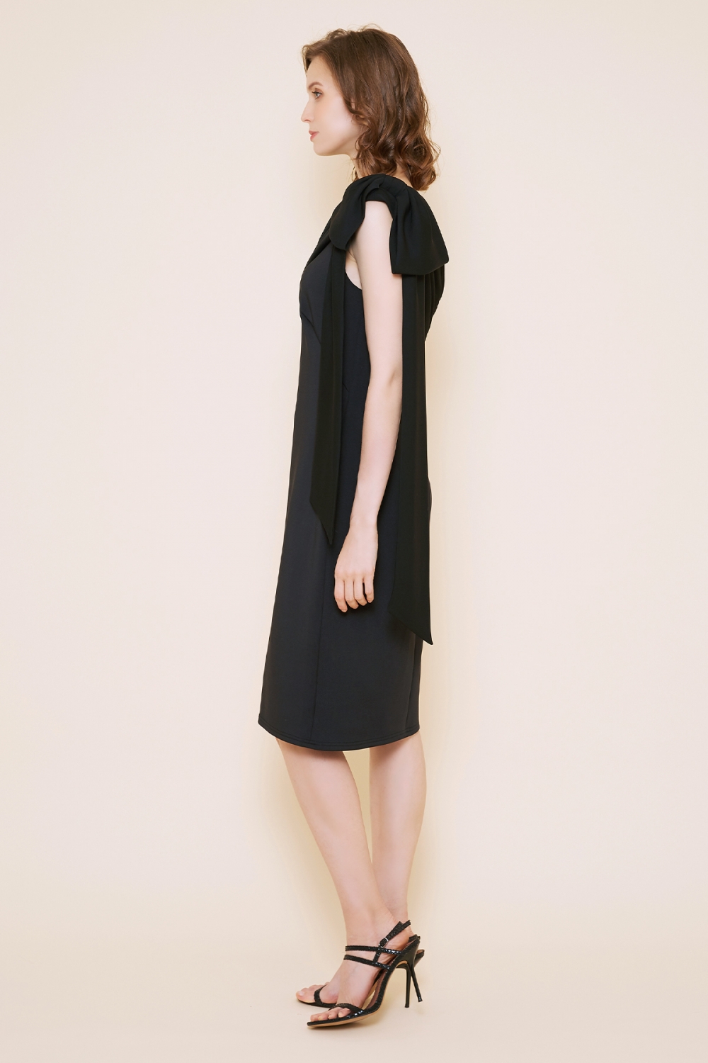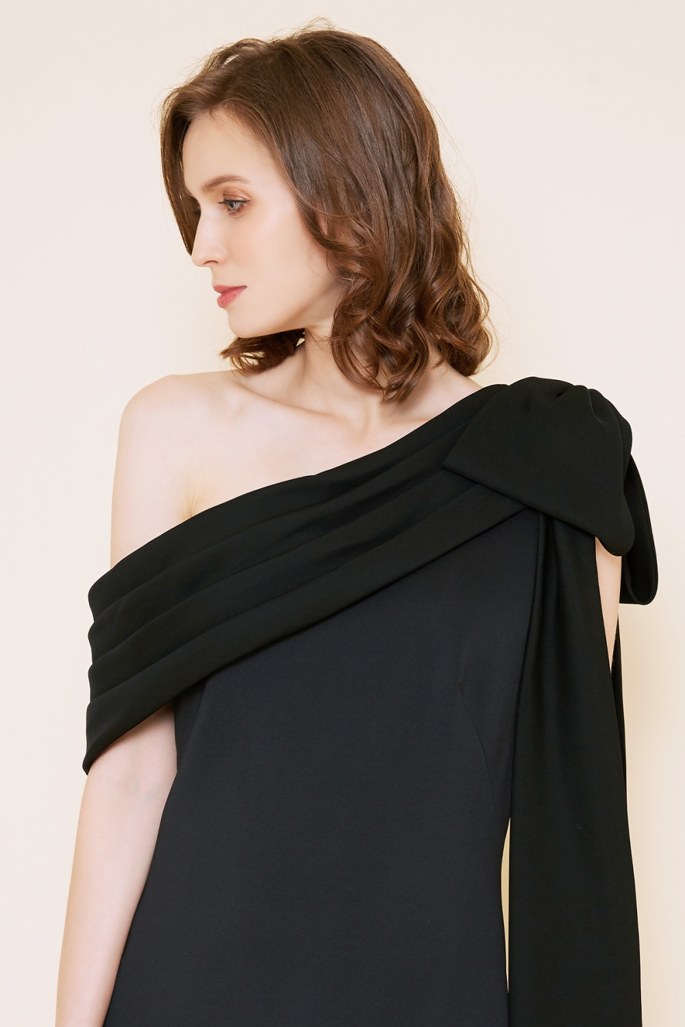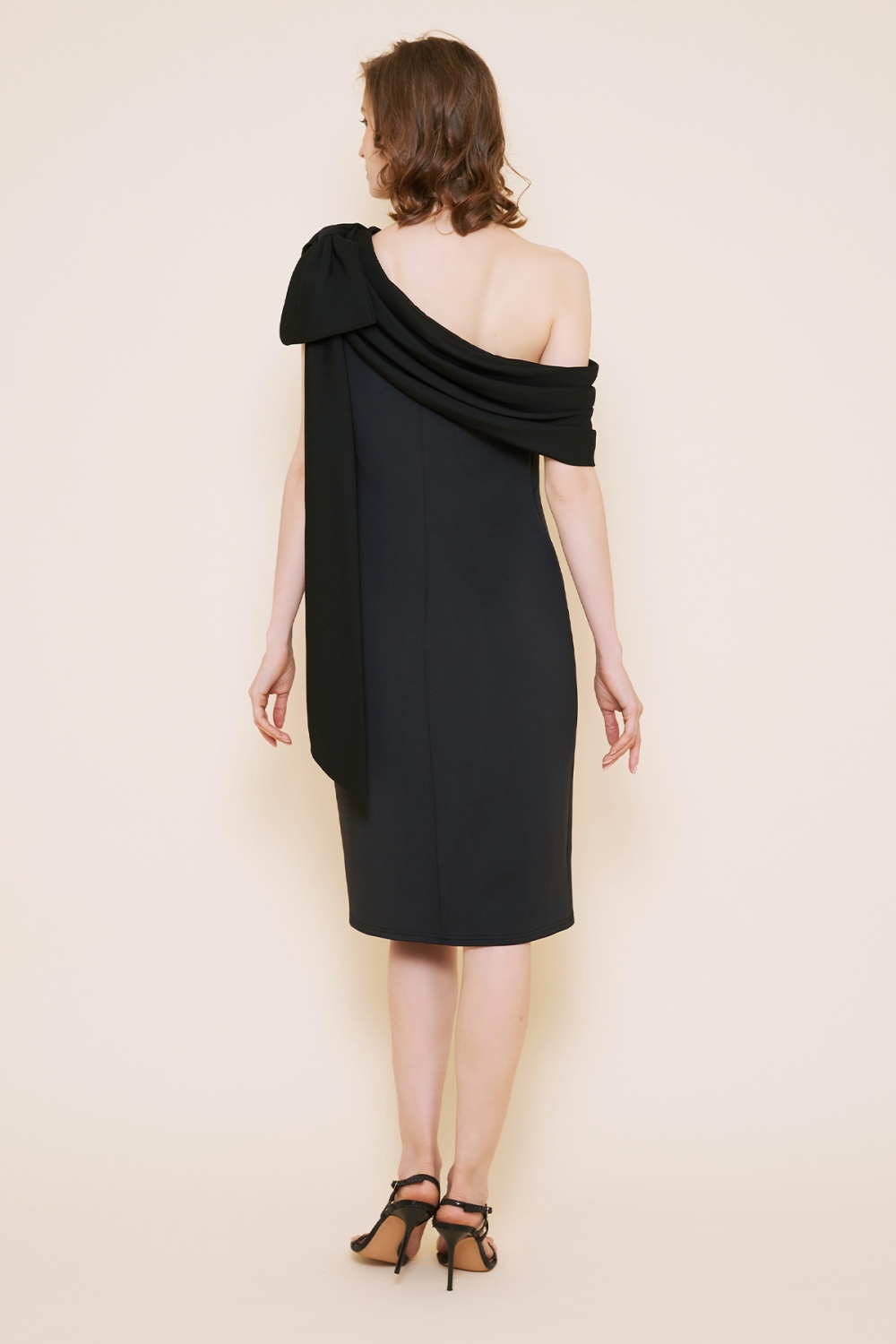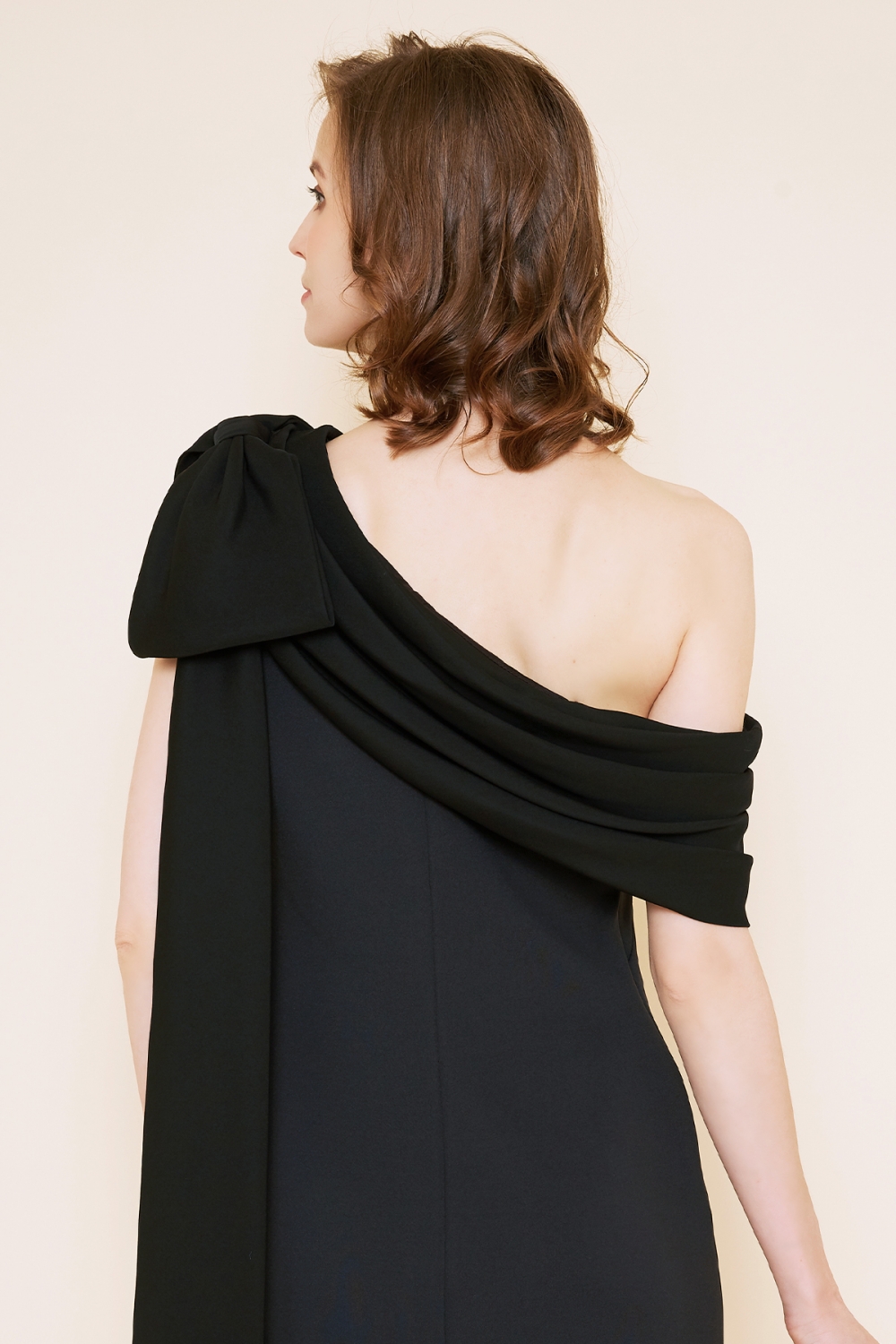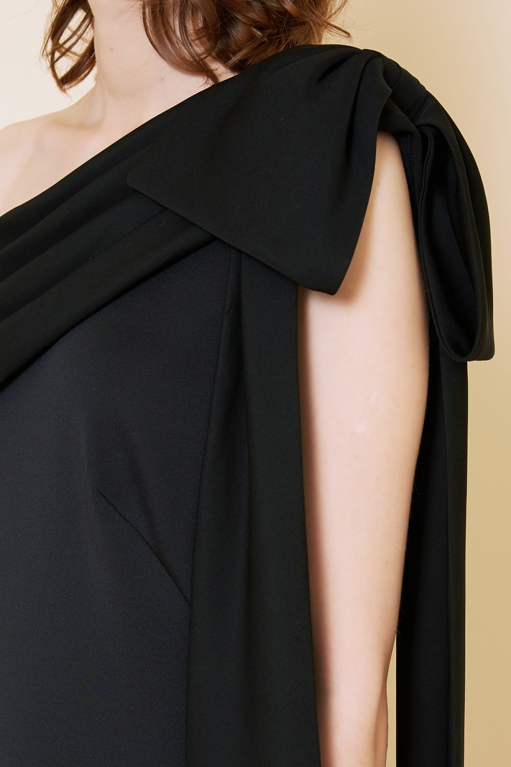 リボンのワンショルダーから流れ落ちるドレープが美しく、タイトなデザインにブラックカラーが甘くなり過ぎるのを抑えてくれ、大人の遊び心ある一着になっています。