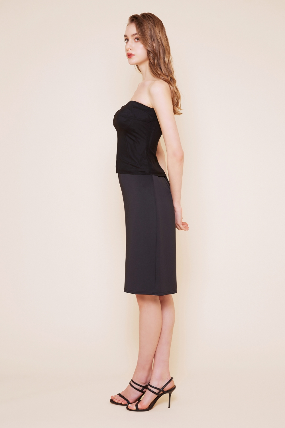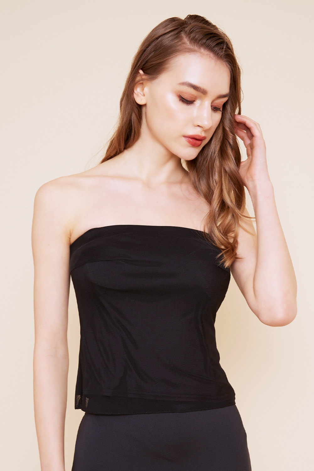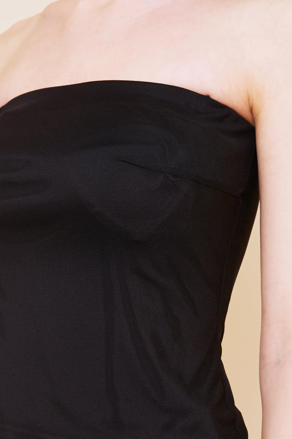ストレッチの効いたTADASHI SHOJIの代表的なジャージー生地の上に、柔らかなチュール生地を重ねた着心地の良いベアトップです。