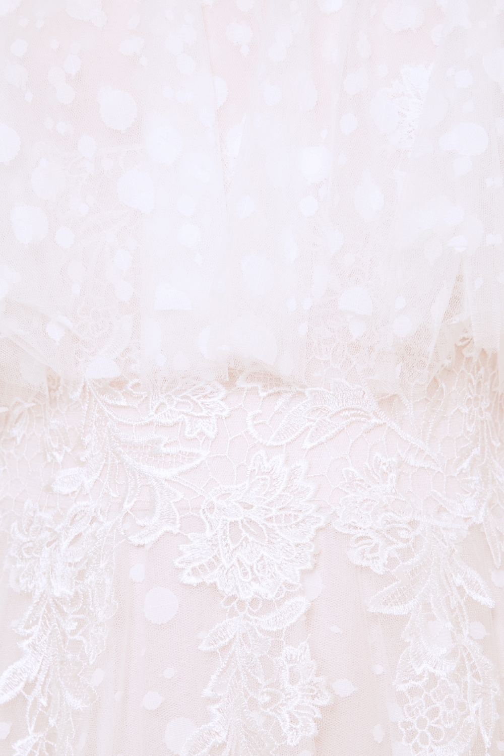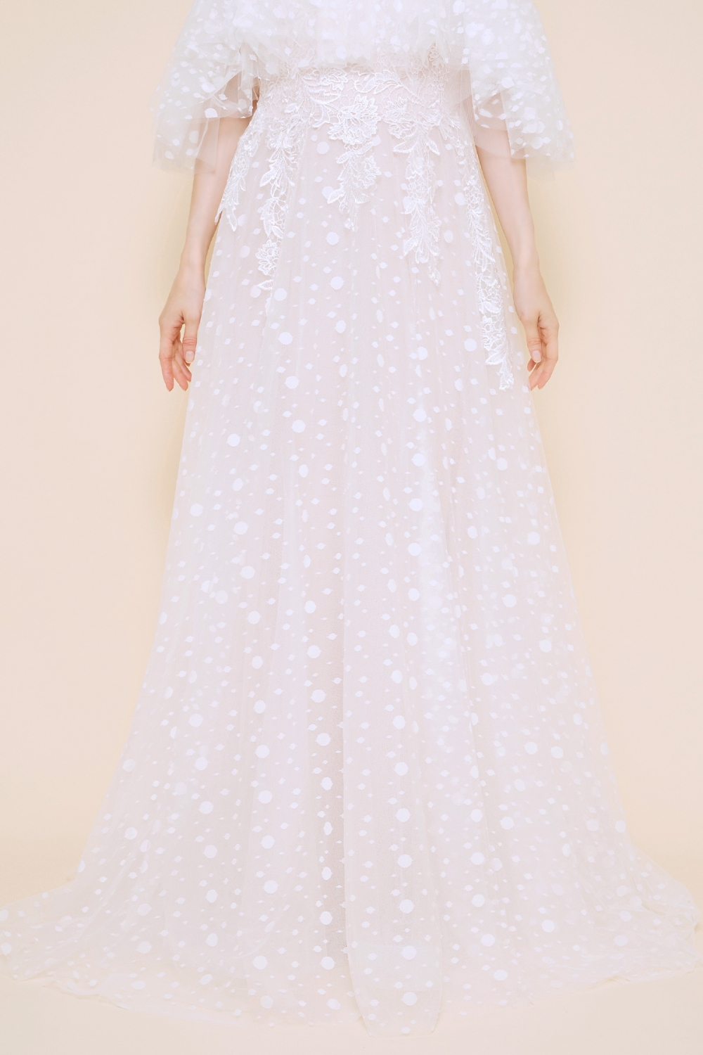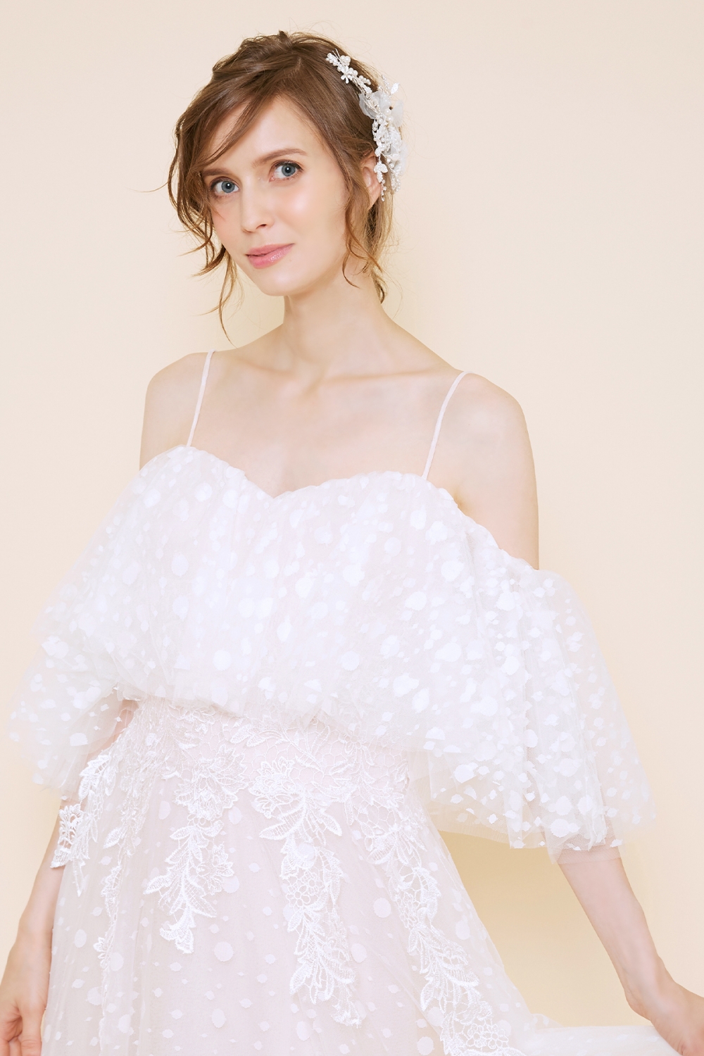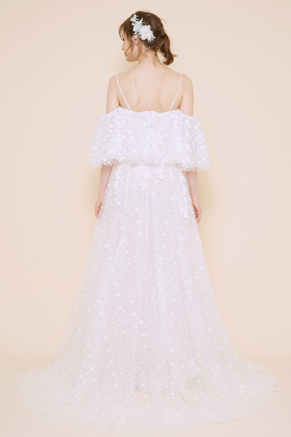 幻想的なドットのチュールをたっぷり使用した、ボリューミーなシルエットが魅力のドレスです。