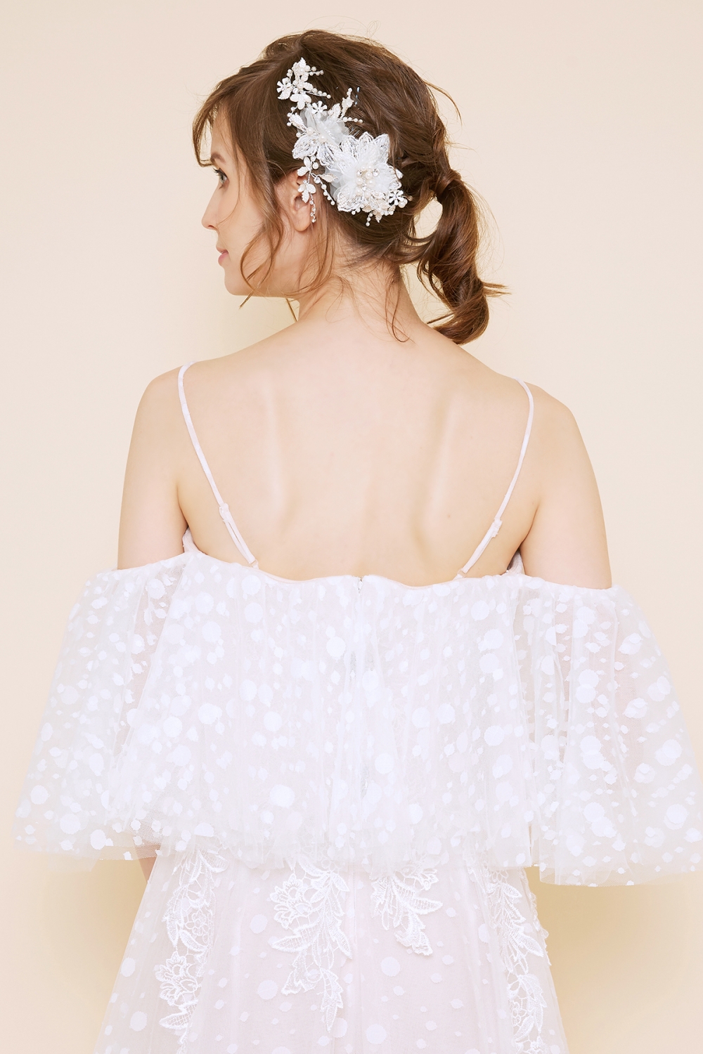 フワッとしたラッフルスリーブのオフショルダーに、胸元が美しく見えるハートネックを合わせ、ウエストには光沢のあるレースをあしらいました。