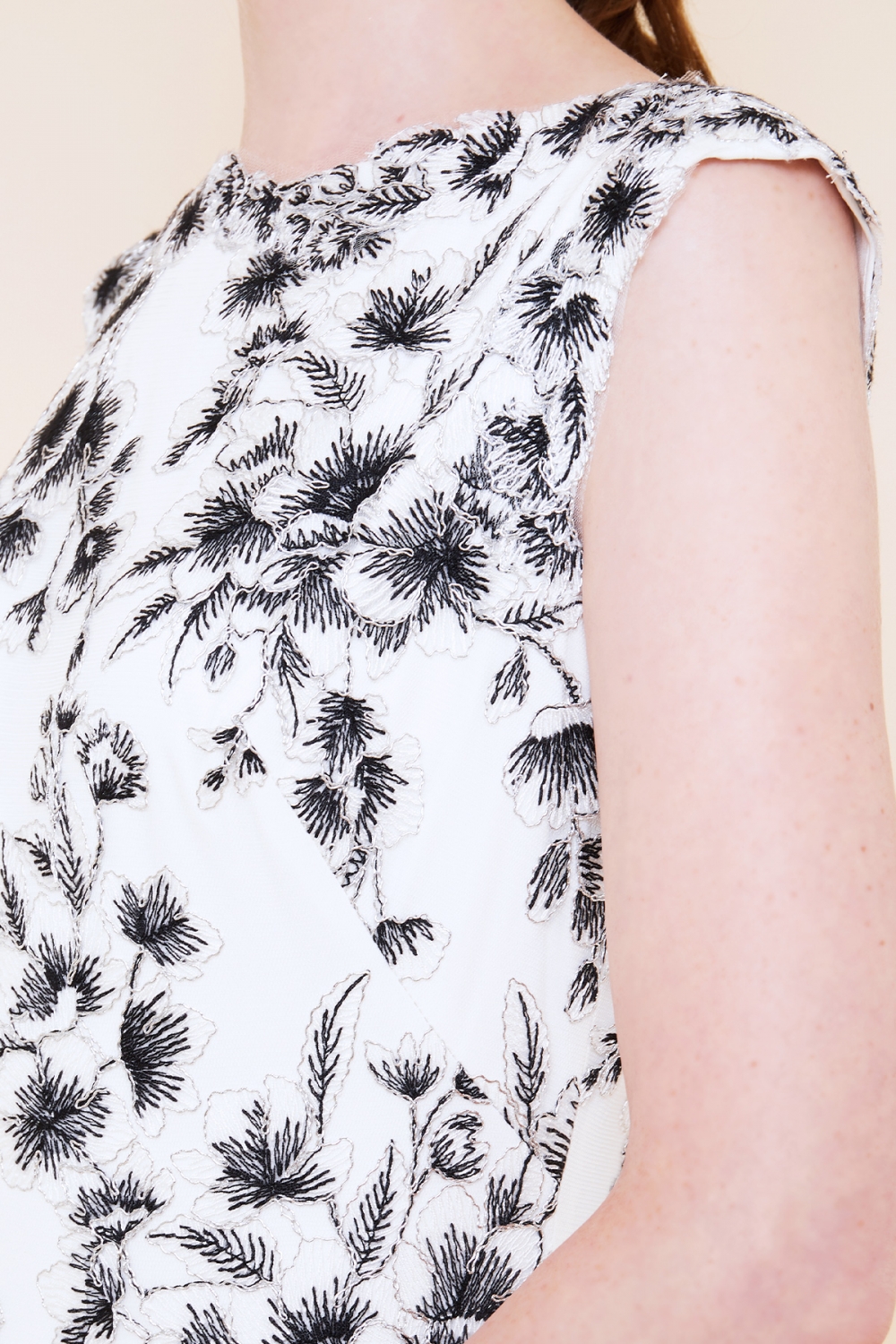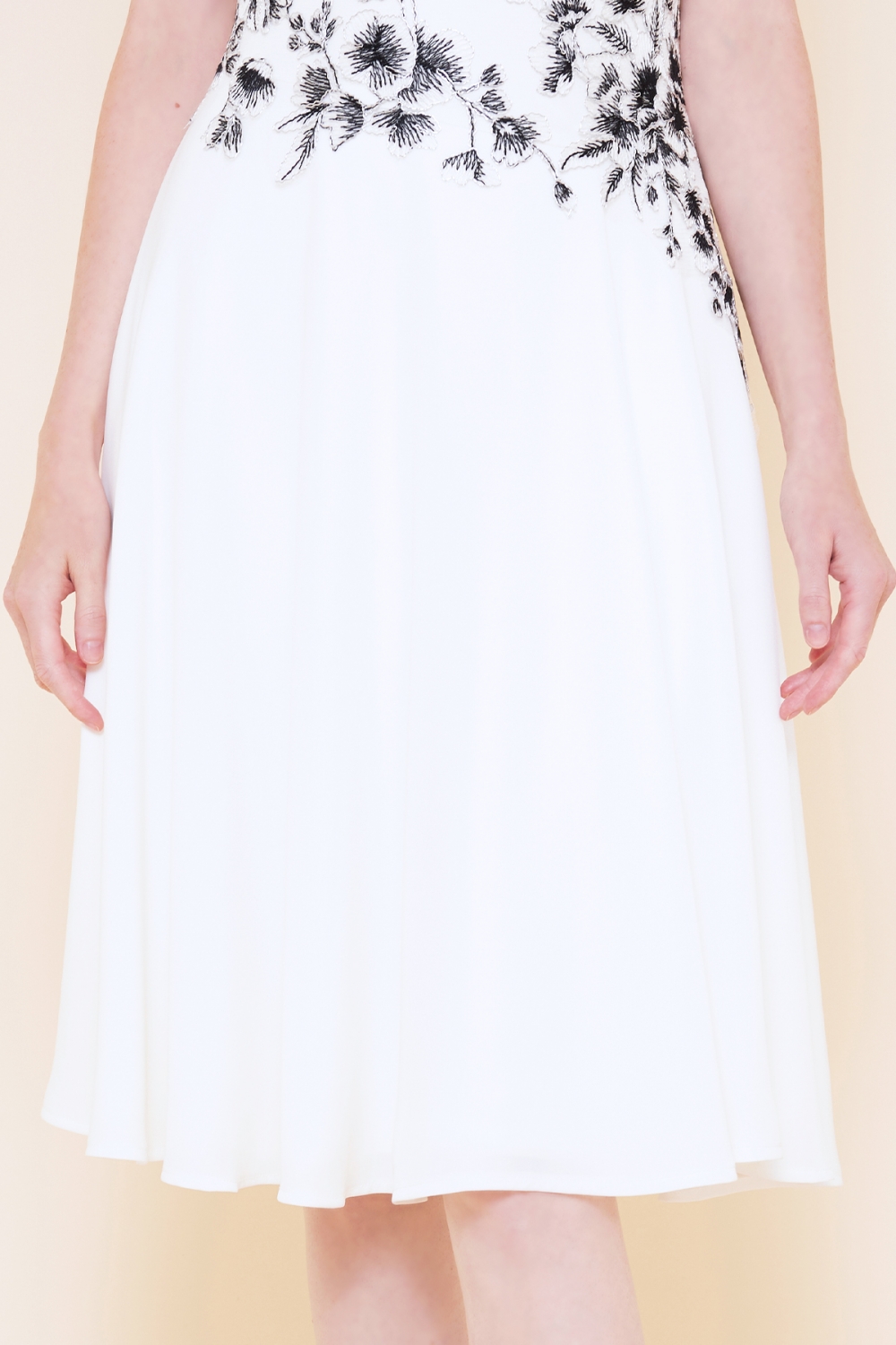 キュートなフィット&フレアのドレスに、繊細なフラワーレースを重ねたデザイン。 フラワーレースの縁取りにシルバーの糸を使い、その中を白と黒の糸で刺繍を施すことで、花の中心に向かって色に濃淡を付け、全体的に引き締めて見せてくれます。 ウエストラインはレースを斜めにカットし、キュートになりすぎない遊び心のあるドレスに仕上がっています。 モデルサイズ 身長173cm B:81cm W:58cm H:87cm /サイズ0着用 ■新作商品一覧はこちら■ □ミディアムドレス一覧はこちら□ ■アイボリーの商品一覧はこちら■