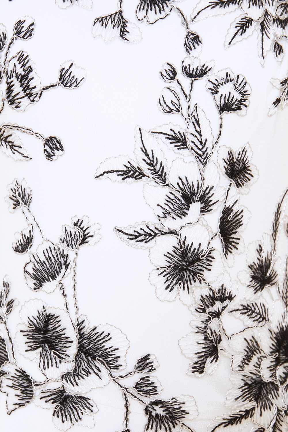 フラワーレースの縁取りにシルバーの糸を使い、その中を白と黒の糸で刺繍を施すことで、花の中心に向かって色に濃淡を付け、全体的に引き締めて見せてくれます。