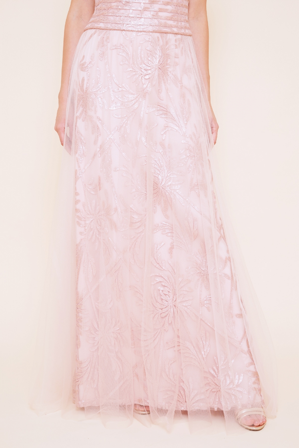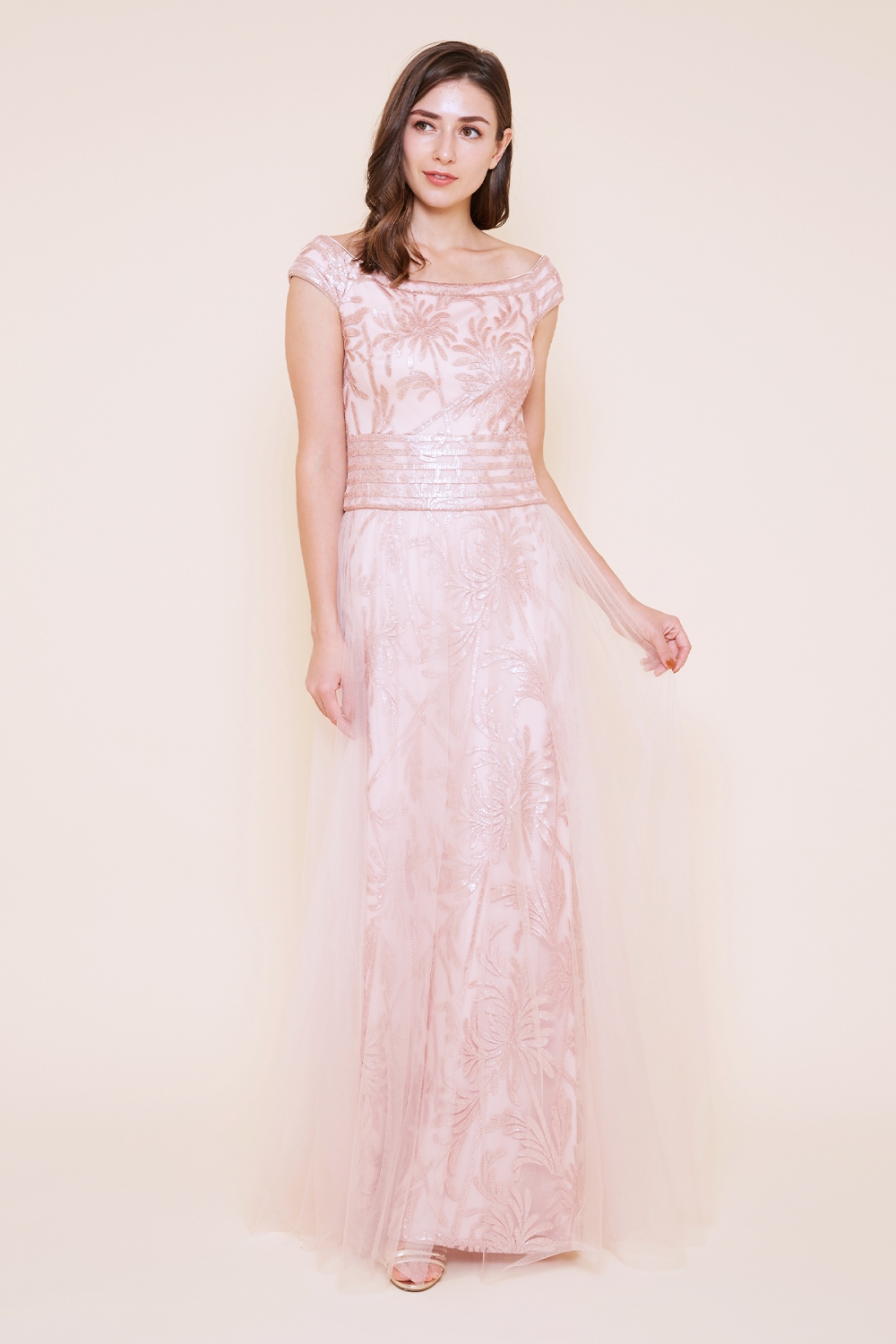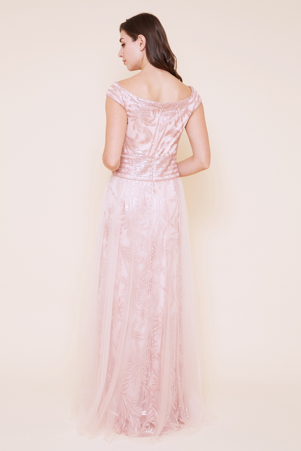日本がテーマのコレクションらしい、菊の花モチーフのスパンコールレースを使用したドレスは、オフショルダーのトップに、チュールを重ねたスカートの組み合わせがフェミニンな印象を与えてくれます。