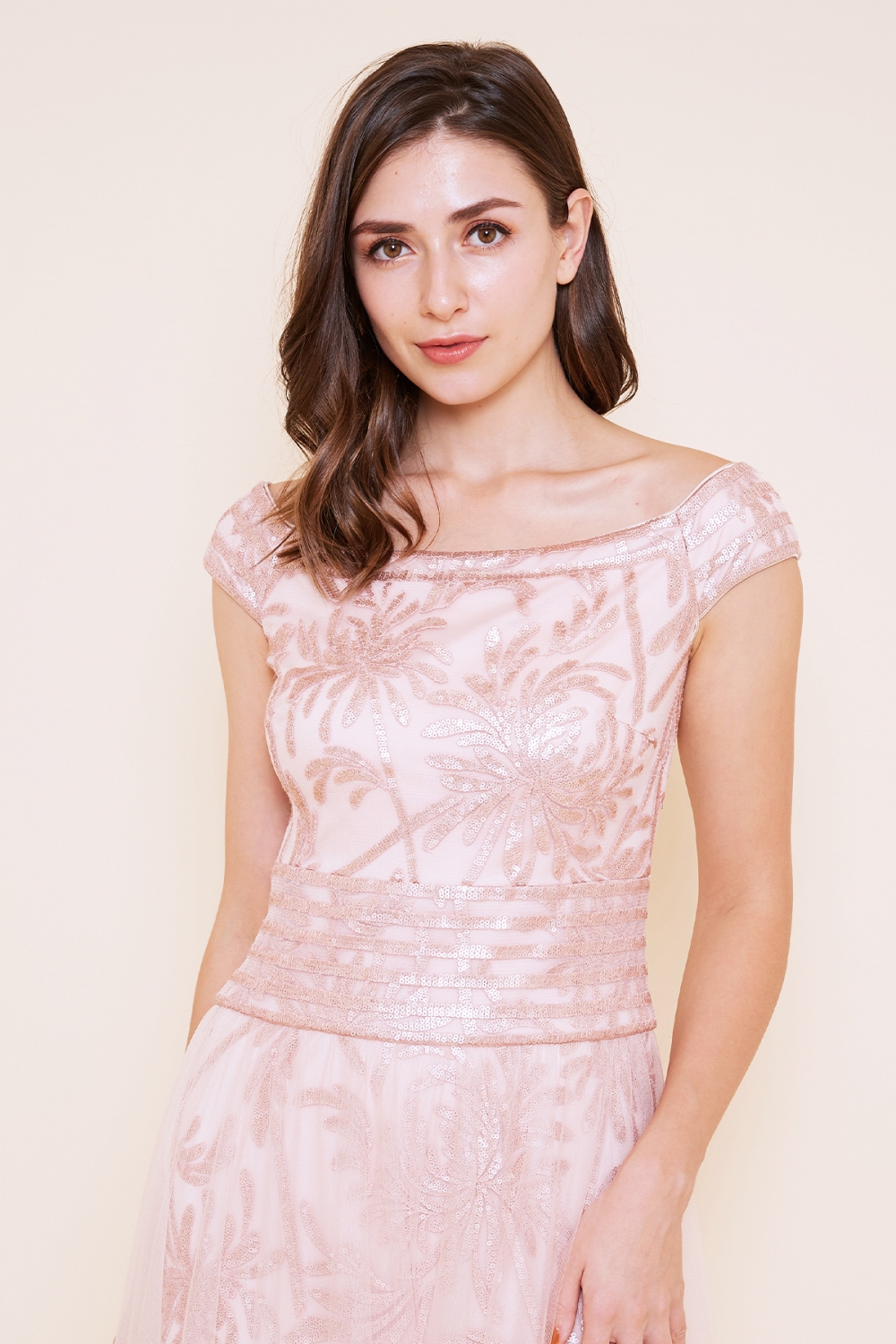 日本がテーマのコレクションらしい、菊の花モチーフのスパンコールレースを使用したドレスは、オフショルダーのトップに、チュールを重ねたスカートの組み合わせがフェミニンな印象を与えてくれます。 スパンコールのマットなピンクがキュートで、程よく華やかです。 モデルサイズ 身長171cm B:82cm W:57cm H:89cm /サイズ2着用 ■新作商品一覧はこちら■ □ロングドレス一覧はこちら□ ■同じレースの商品一覧はこちら■ □ピンクの商品一覧はこちら□