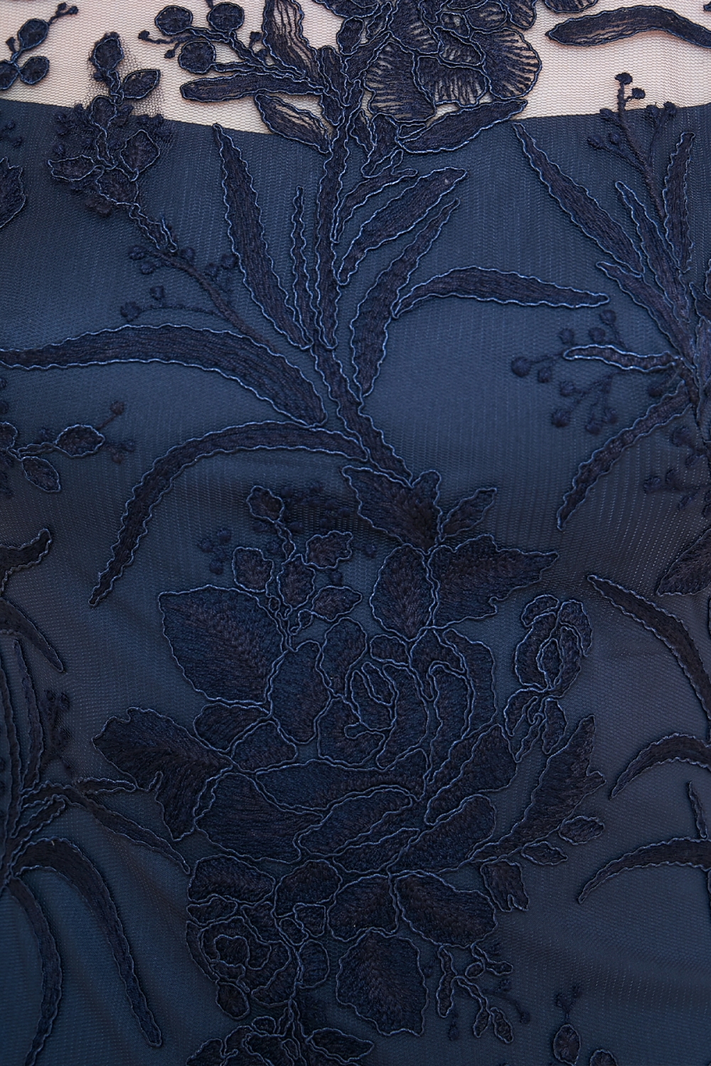動きのある丸い果実や細長い葉などがシンプルなドレスに映え、透け感のあるデコルテにレースが浮かび上がります。