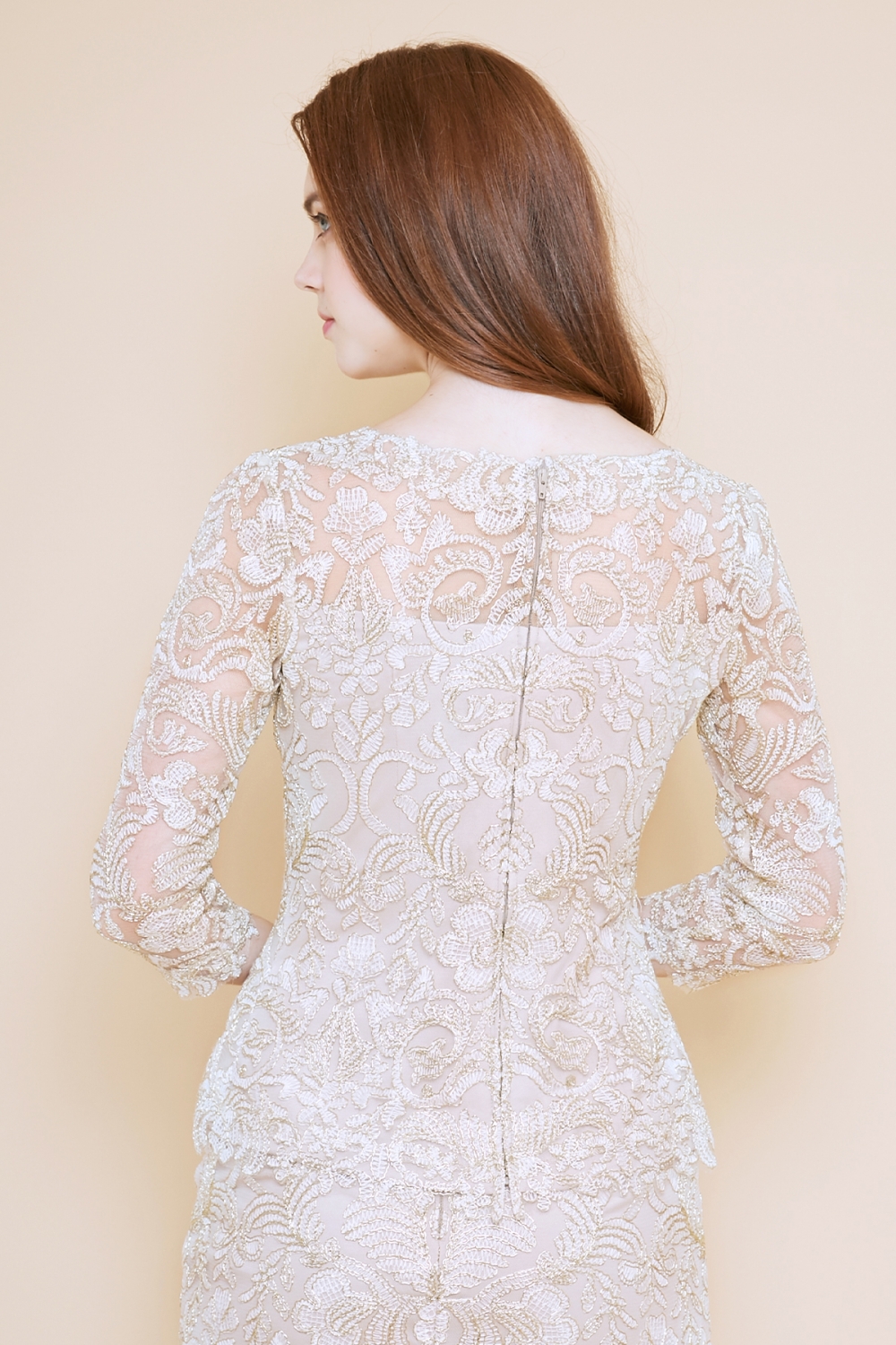 TADASHI SHOJI定番のコードレースを使用した七分袖のトップスは、デコルテや袖が透けているので、季節問わず一枚で着られるデザインです。
