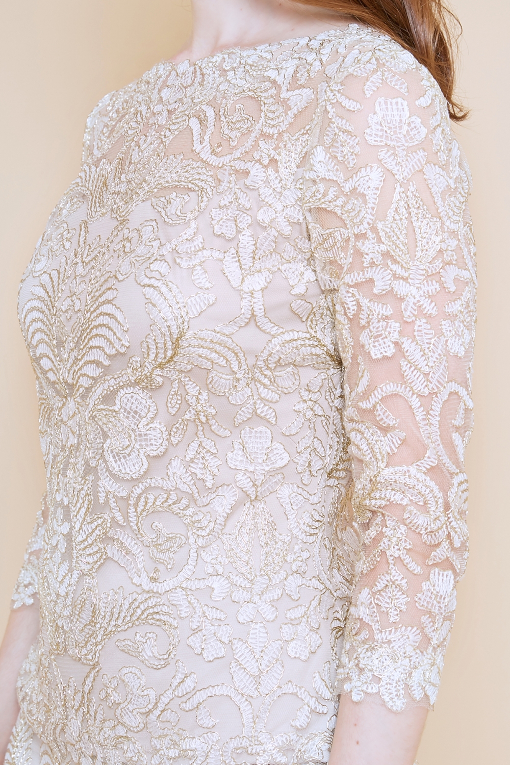 TADASHI SHOJI定番のコードレースを使用した七分袖のトップスは、デコルテや袖が透けているので、季節問わず一枚で着られるデザインです。 ゴールドの糸を使用したレースが華やかなこのカラーは、結婚式やパーティーなどのオケージョンにオススメです。 同素材のスカートと組み合わせるとより華やかな印象に。 モデルサイズ 身長175cm B:84cm W:60cm H:89cm /サイズ2着用 ■新作商品一覧はこちら■ □トップス一覧はこちら□ ■コードレースの商品一覧はこちら■ □色違い商品一覧はこちら□ ■アイボリーの商品一覧はこちら■ □ゴールドのドレス一覧はこちら□ ■ベージュの商品一覧はこちら■