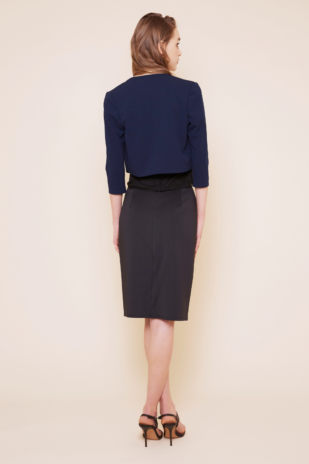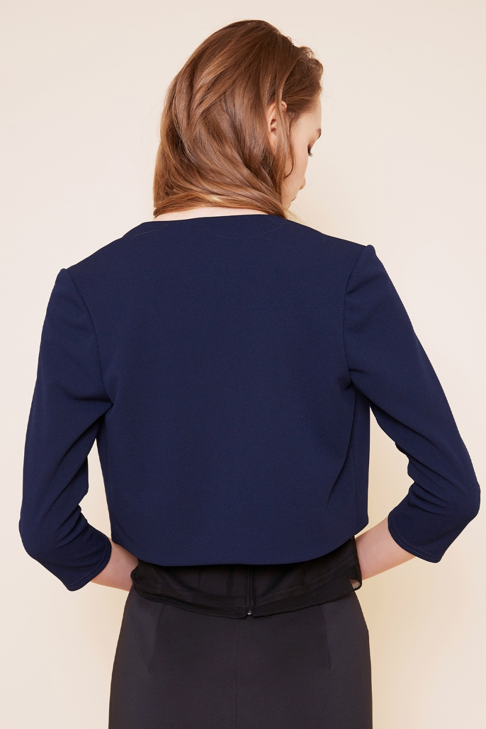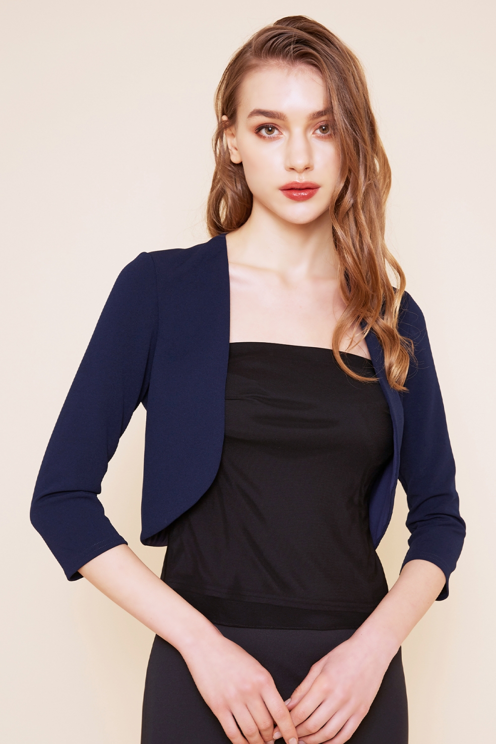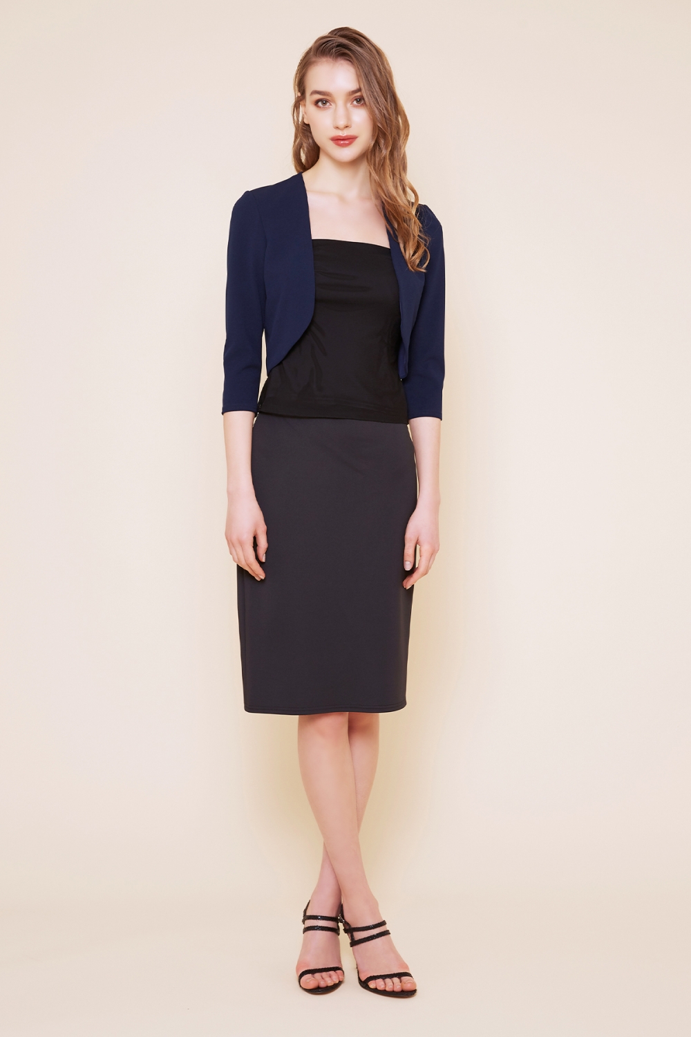 クレープジャージー生地のボレロは、ストレッチが効いているのでカーディガンの様に着まわしやすい一着です。