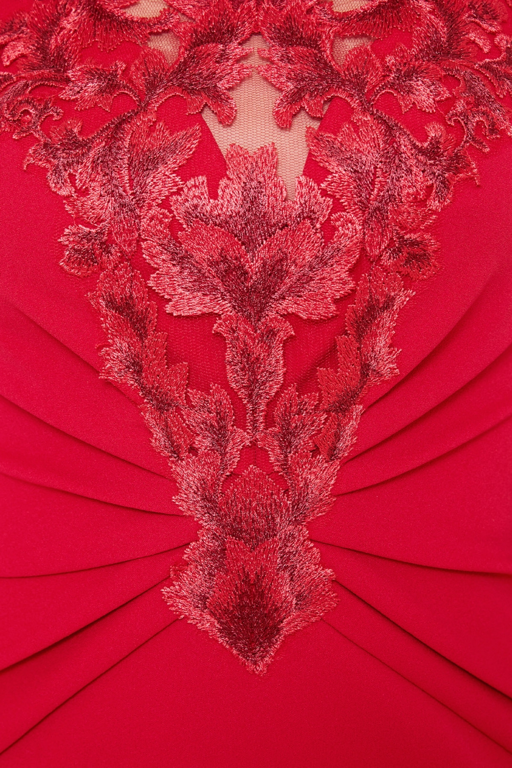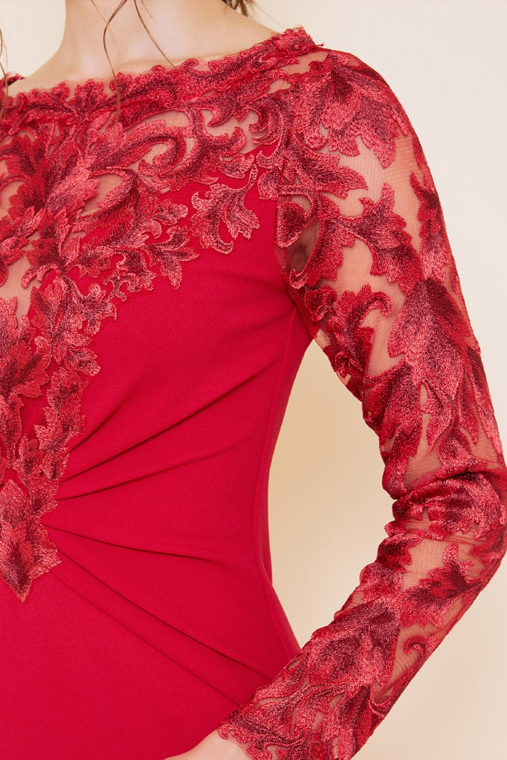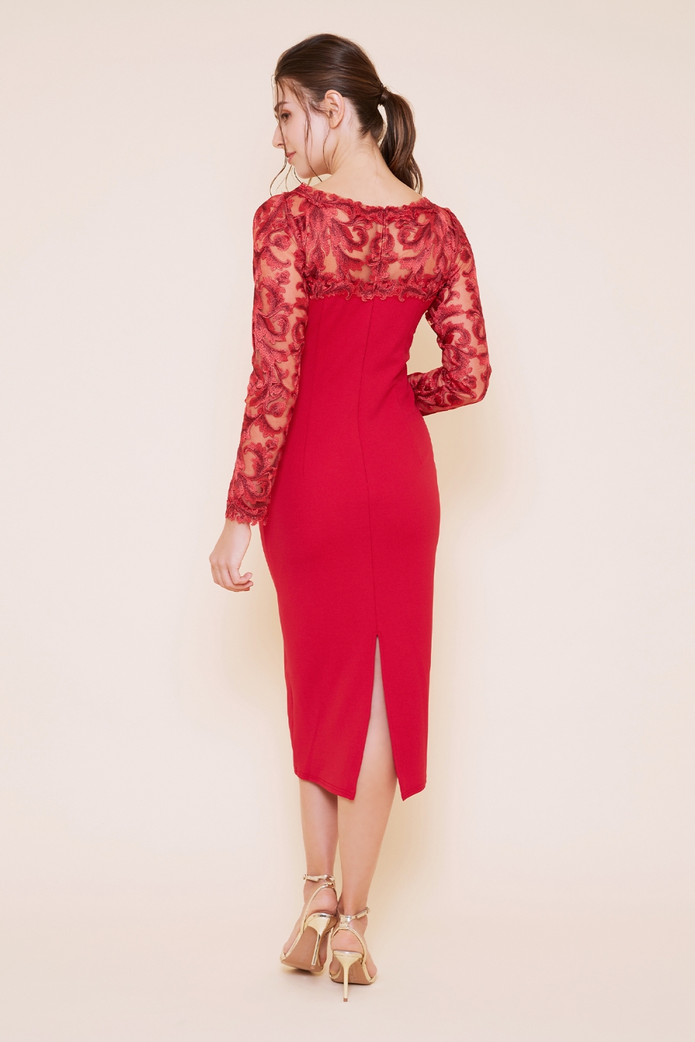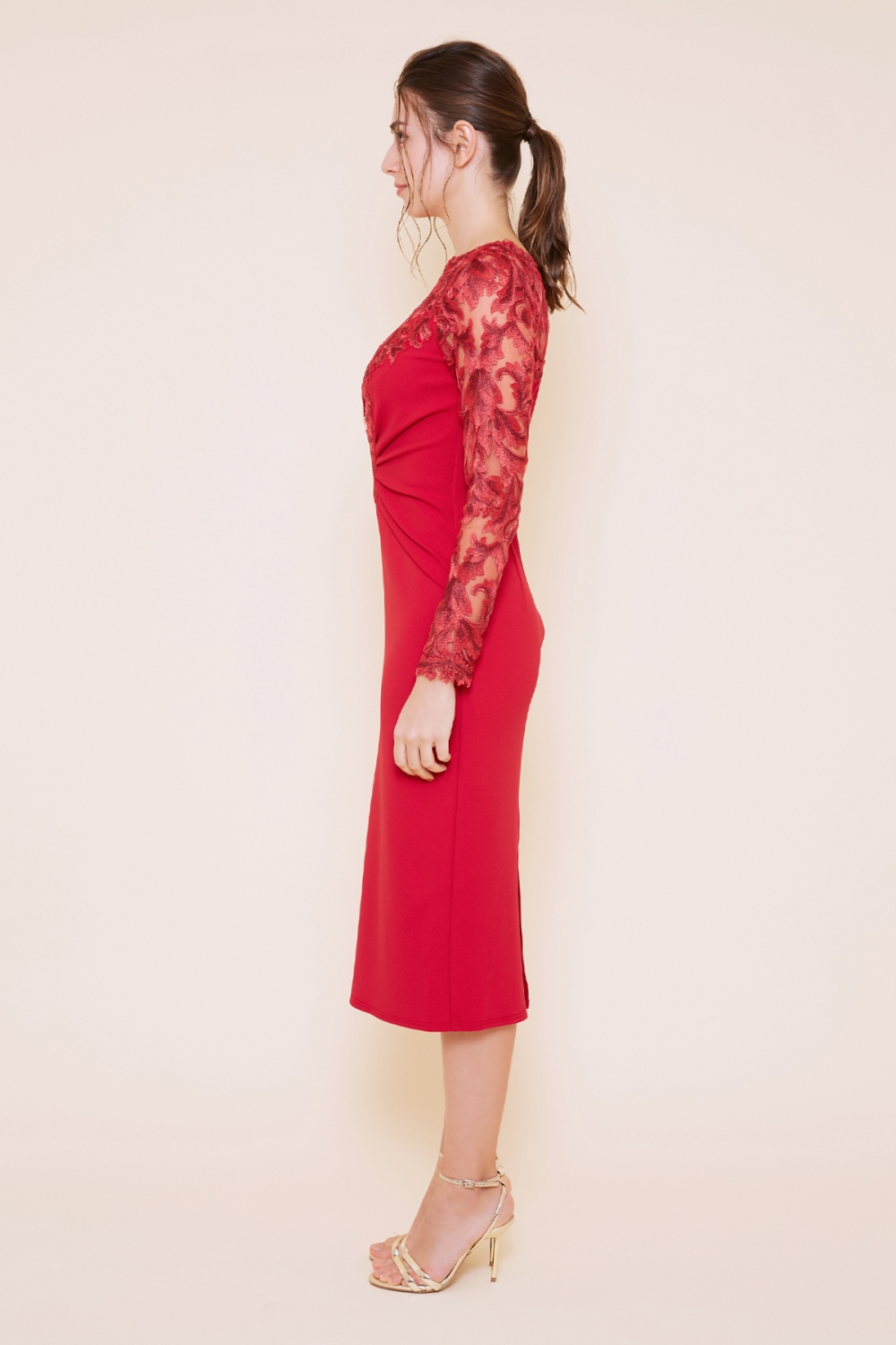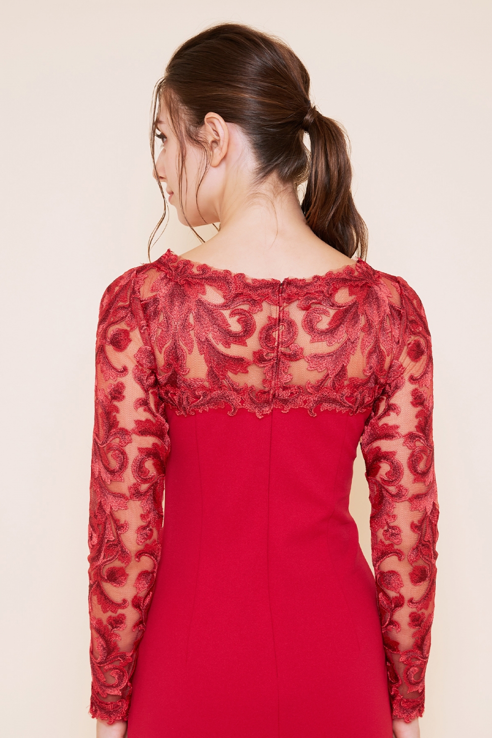 グラデーションの刺繍レースを使用した長袖ドレスは、高級感と華やかさがありながらも、クレープジャージー生地と組み合わせる事で少しラフな雰囲気も加わり、パーティーからお食事会まで幅広く対応可能なデザインです。 ウエストから放射状に入ったタックは、女性のボディラインが最も美しく見える砂時計ラインを作ってくれ、着るだけで美しいボディラインが完成します。 胸元にはレースの下にヌードカラーの裏地が付いているので、下着が見える心配はありません。 モデルサイズ 身長173cm B:81cm W:58cm H:87cm /サイズ0着用 ■新作商品一覧はこちら■ □ミディアムドレス一覧はこちら□ ■色違い商品一覧はこちら■ □同じレースの商品一覧はこちら□ ■レッドの商品一覧はこちら■