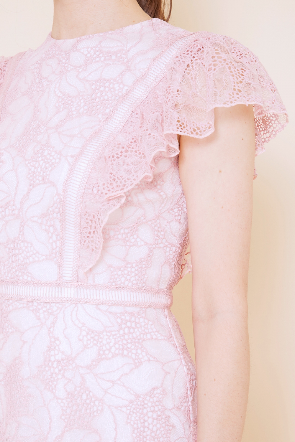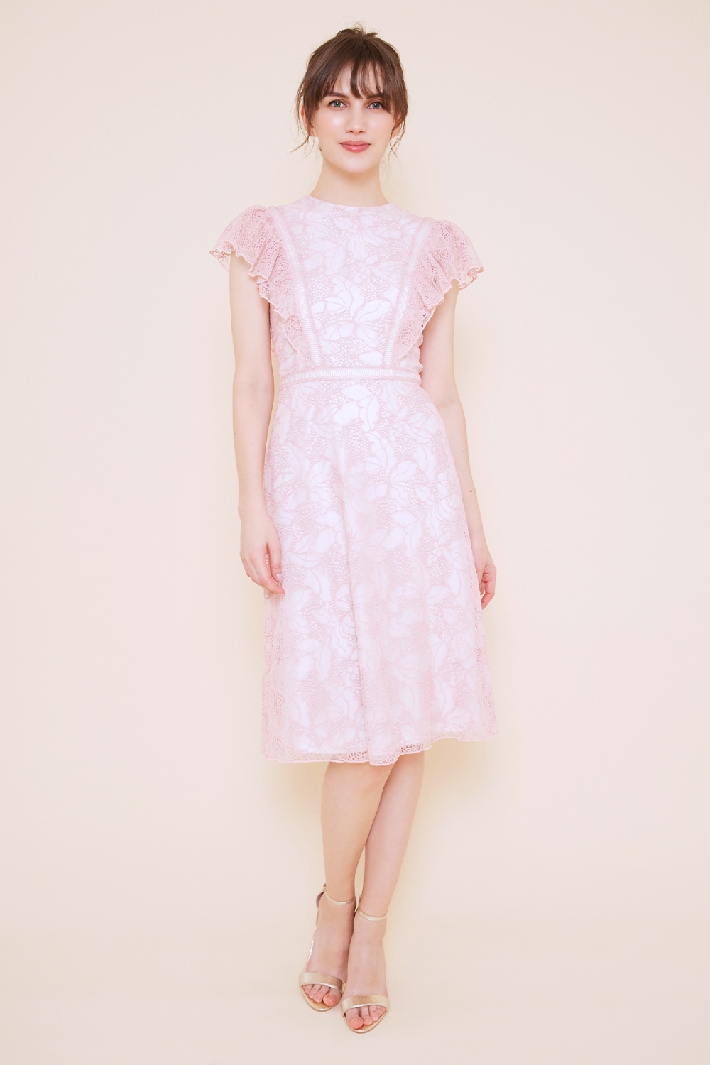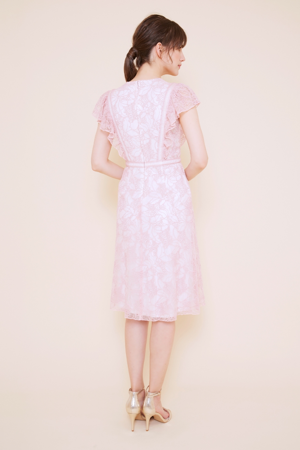 薄手で軽いフラワーレースを使用したドレスは、フワッとしたフリル袖と、はしごレースの切り替えがポイントのキュートなデザインです。 フリル袖は、気になる肩周りは隠しつつ、肩が大きく見えにくい様にボリュームを調整しているので、幅広い体型の方にオススメの一着。 カラーにより印象が異なるので、色違いで欲しくなるドレスです。ピンクはとことんキュートで、可愛いドレスが着たい時にピッタリです。 モデルサイズ 身長171cm B:83cm W:59cm H:87cm /サイズ0着用 ■新作商品一覧はこちら■ □ミディアムドレス一覧はこちら□ ■デイリードレス一覧はこちら■ □色違い商品一覧はこちら□ ■ピンクの商品一覧はこちら■