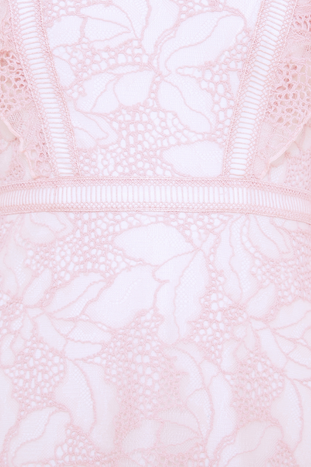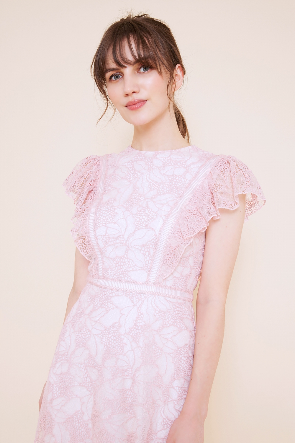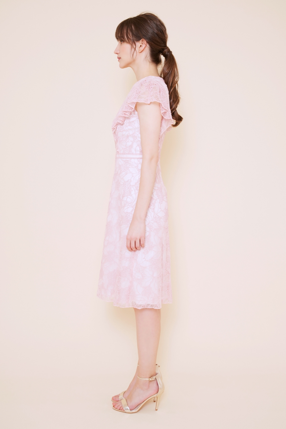 薄手で軽いフラワーレースを使用したドレスは、フワッとしたフリル袖と、はしごレースの切り替えがポイントのキュートなデザインです。