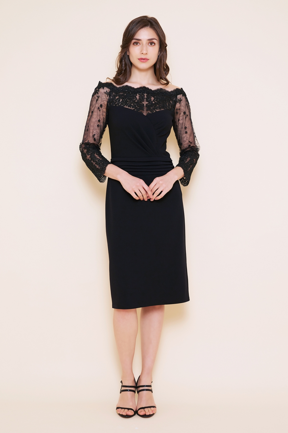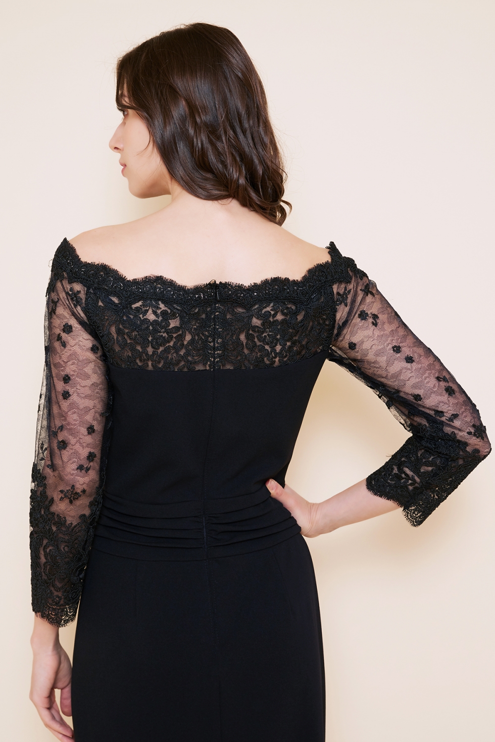 模様の入ったチュールに、コードレースや小花刺繍を重ねたレースがエレガントな長袖のドレス。 チュールレースの濃淡が腕を細く見せ、真っ直ぐなラインのオフショルダーが鎖骨をきれいに出し、華奢な印象を与えます。 タイトになりすぎないスカート、クレープジャージー生地との組み合わせで少しラフな雰囲気も加わり、パーティーからお食事会まで幅広く対応可能なデザインです。 オフショルダー部分にはずり落ち防止のシリコンテープが付いています。デコルテ・袖のチュールレース部分は、裏地は付いていません。 モデルサイズ 身長171cm B:82cm W:57cm H:89cm /サイズ2着用 ■新作商品一覧はこちら■ □ミディアムドレス一覧はこちら□ ■ブラックの商品一覧はこちら■