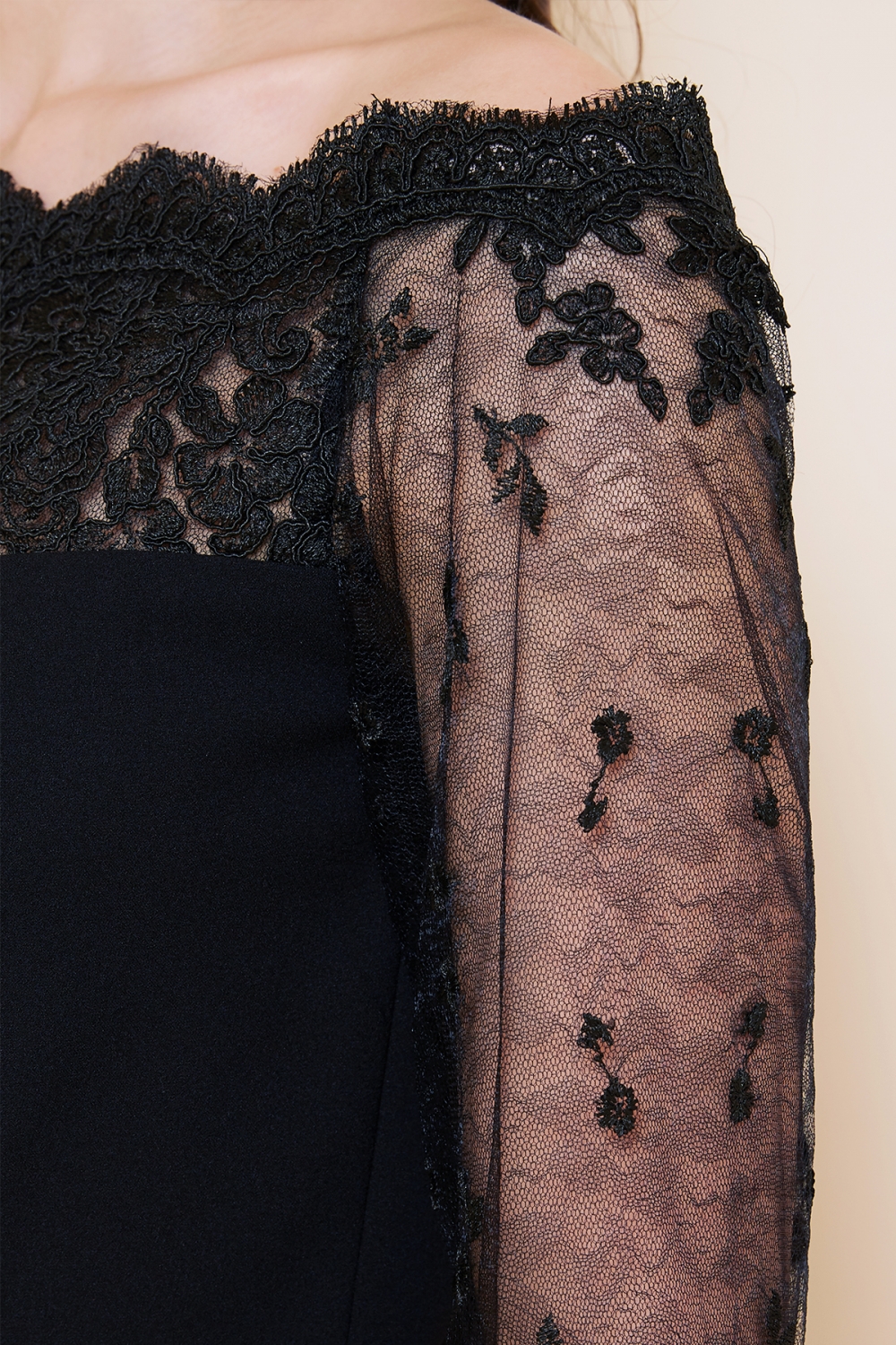 チュールレースの濃淡が腕を細く見せ、真っ直ぐなラインのオフショルダーが鎖骨をきれいに出し、華奢な印象を与えます。