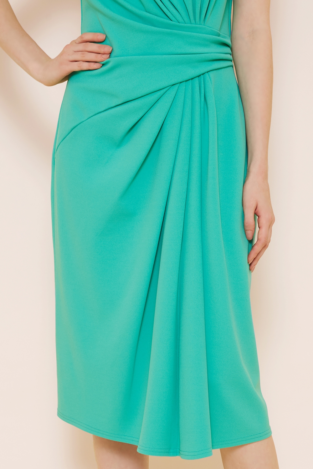 クレープジャージーの生地を使用したドレスは、スウェットワンピースの様に動きやすく、ウエストにエレガントなドレープを入れる事で洗練された雰囲気を与えてくれます。 スカートのバックスタイルはタイトラインに見えますが、ウエストにギャザーを入れスカートのけまわしを広くしているので見た目以上に軽やかに動けます。 柔らかく程よい厚みがある生地なのでボディラインを拾いません。 スタイルアップも体型カバーも叶う優秀な一着です。 モデルサイズ 身長169cm B:80cm W:60cm H:89cm /サイズ2着用 ■新作商品一覧はこちら■ □ミディアムドレス一覧はこちら□ ■デイリードレス一覧はこちら■ □グリーンの商品一覧はこちら□