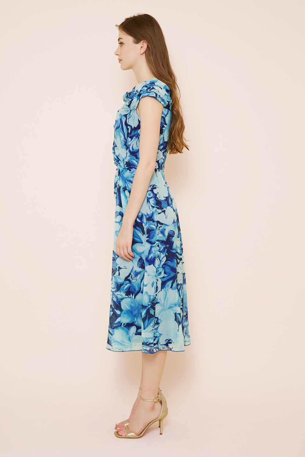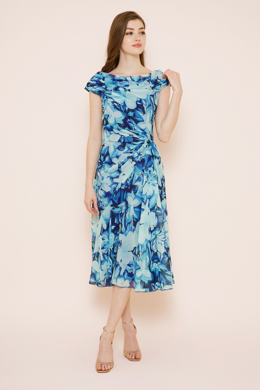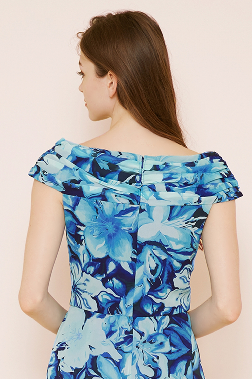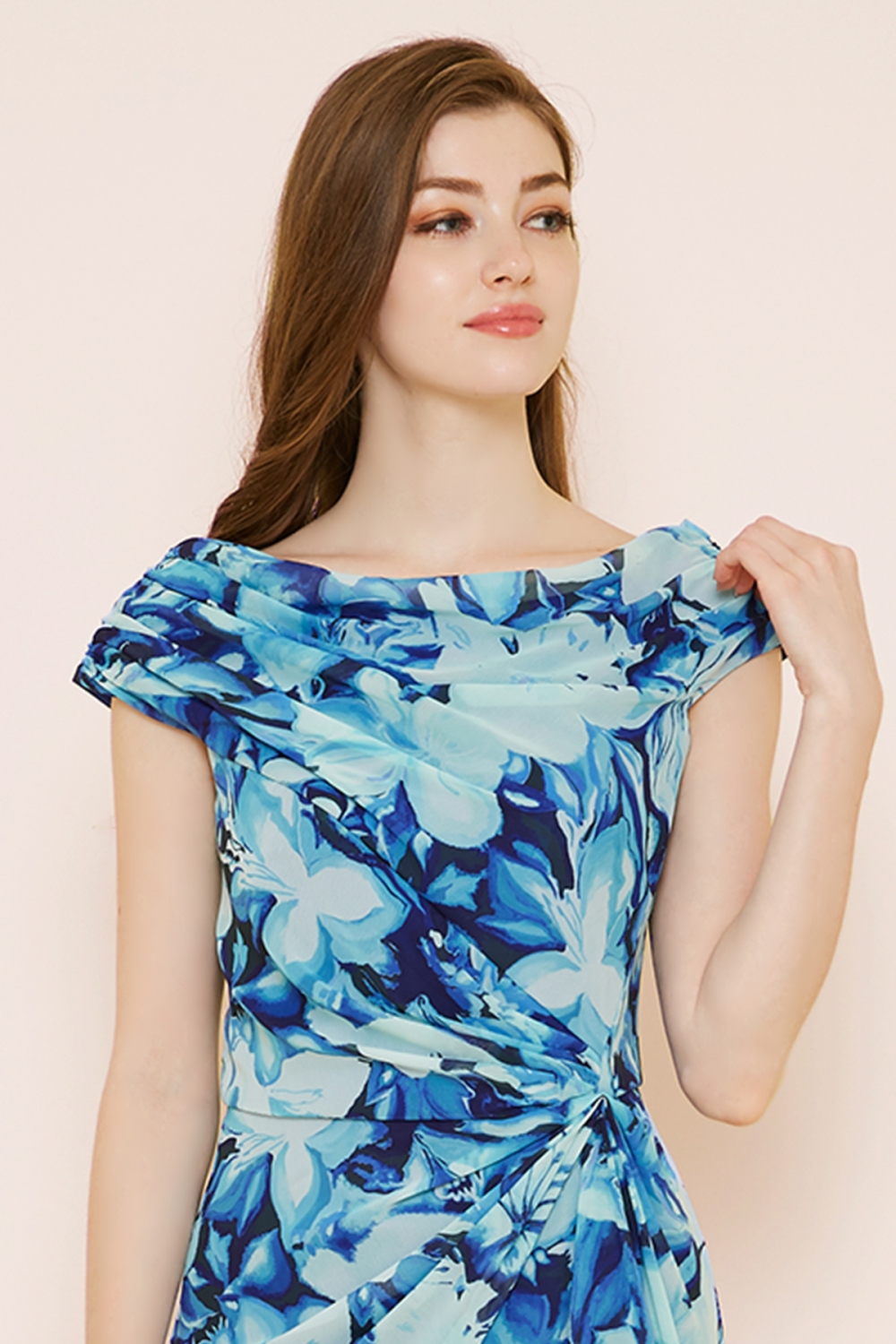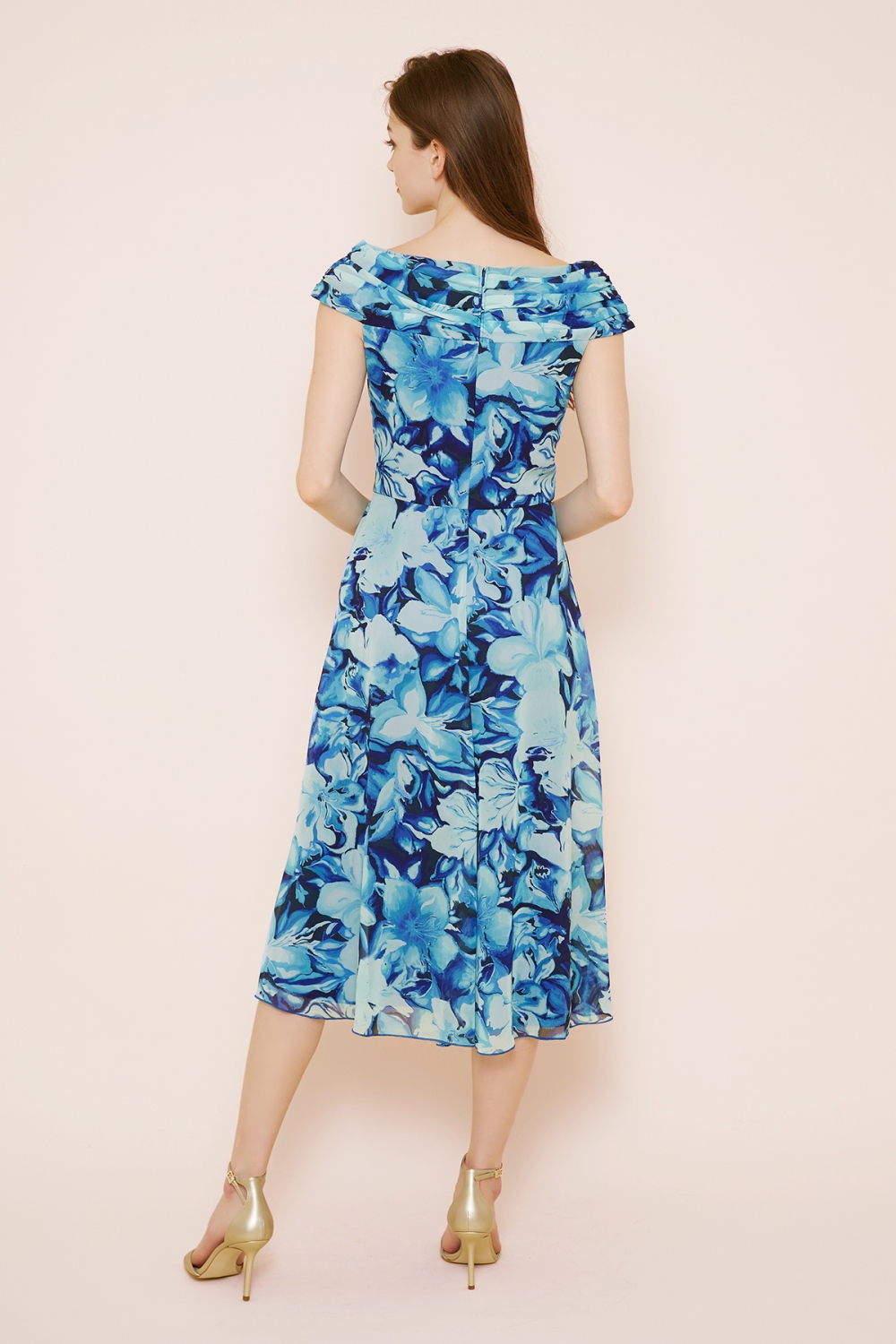 オフショルダーからウエスト、スカートへつながるようなジョーゼットのドレープが美しいドレス。 寄せたドレープが腰位置を高く見せ、ウエストカバーしてくれます。 フラワー柄でも都会的なスタイリッシュさを感じさせるカラーがポイントです。 オフショルダーの肩にはシリコンテープが貼ってあるのでズレ落ちる心配もありません。 モデルサイズ 身長169cm B:80cm W:60cm H:89cm /サイズ0着用 ■新作商品一覧はこちら■ □ミディアムドレス一覧はこちら□ ■デイリードレス一覧はこちら■ □ブルーの商品一覧はこちら□