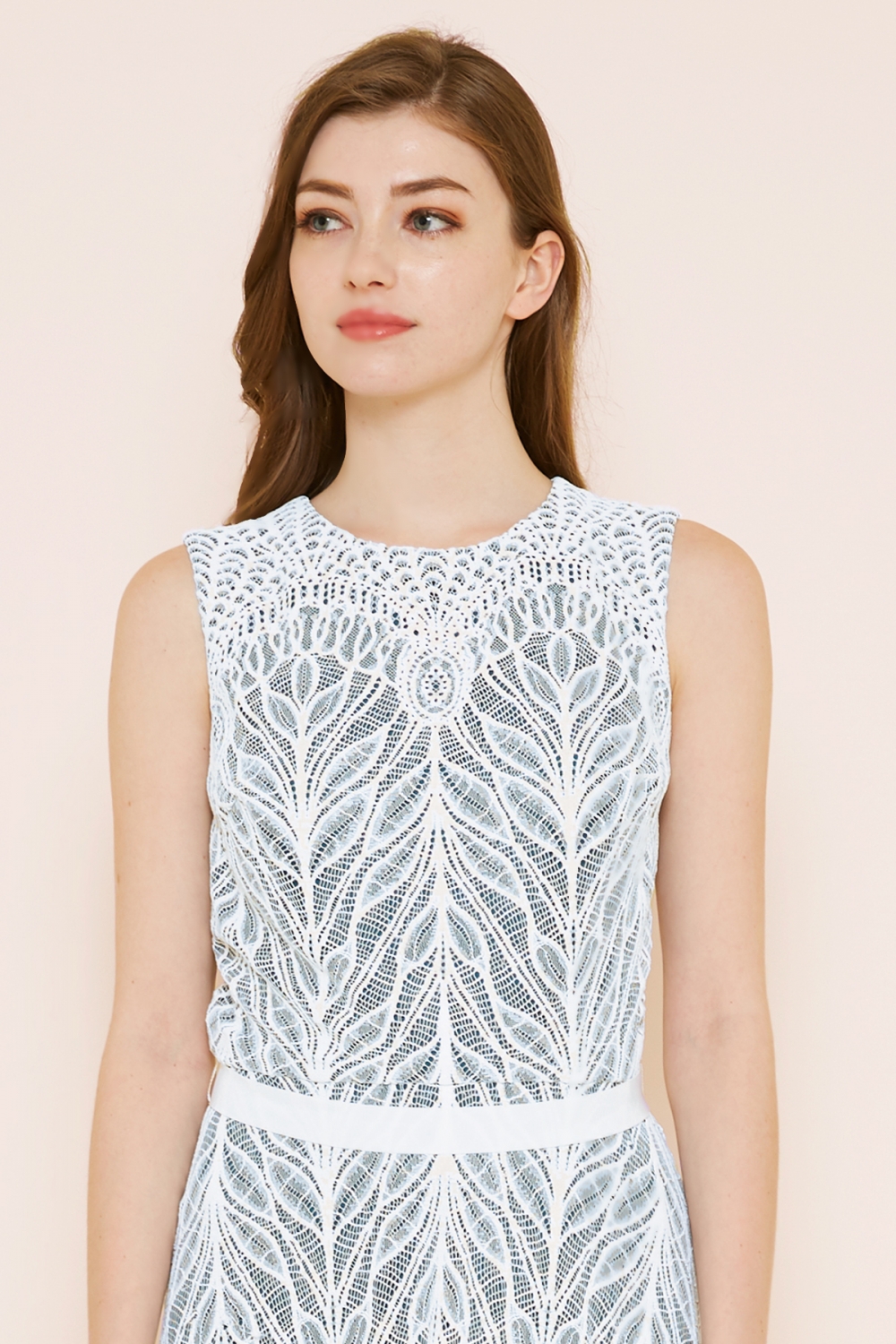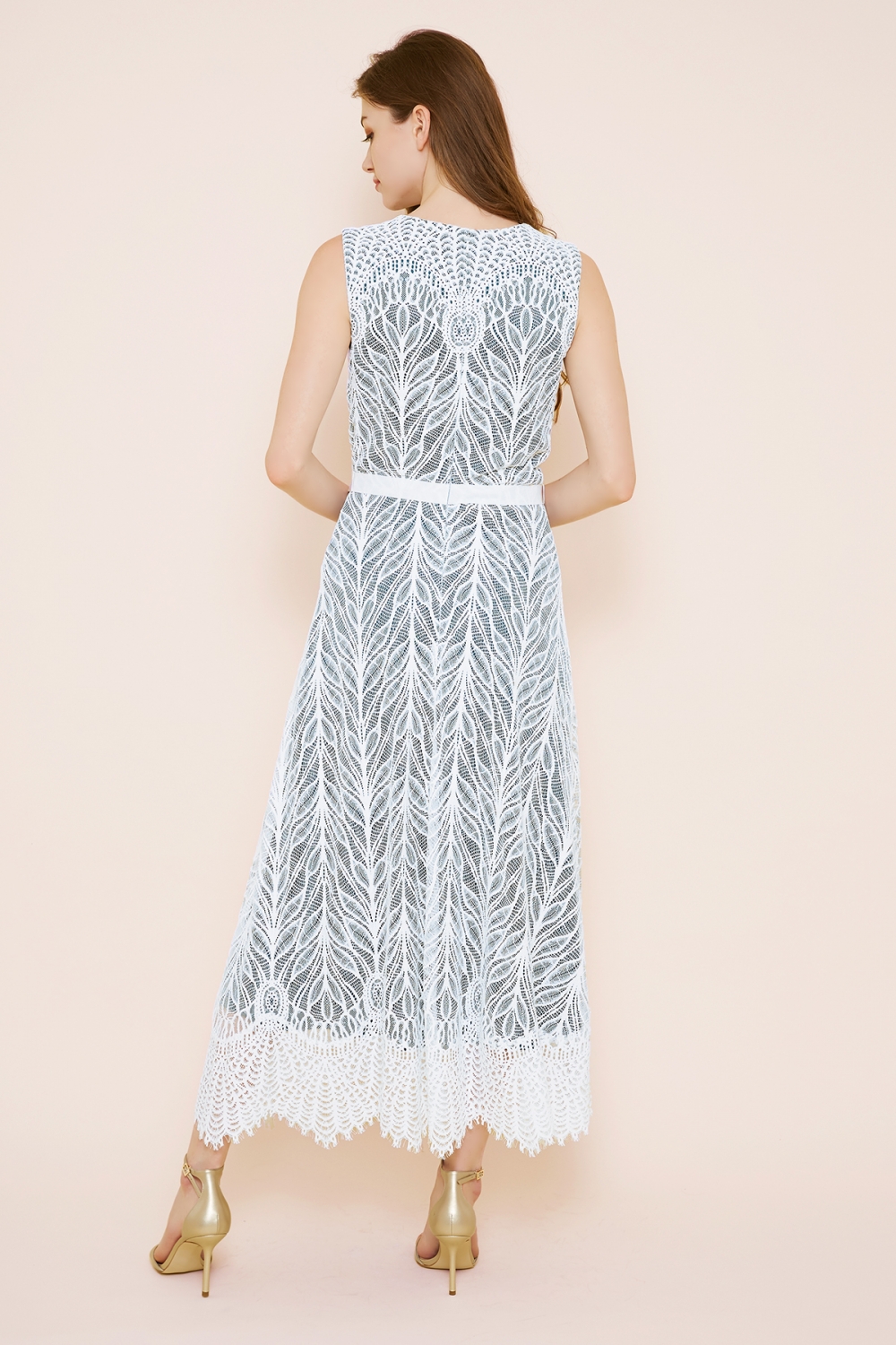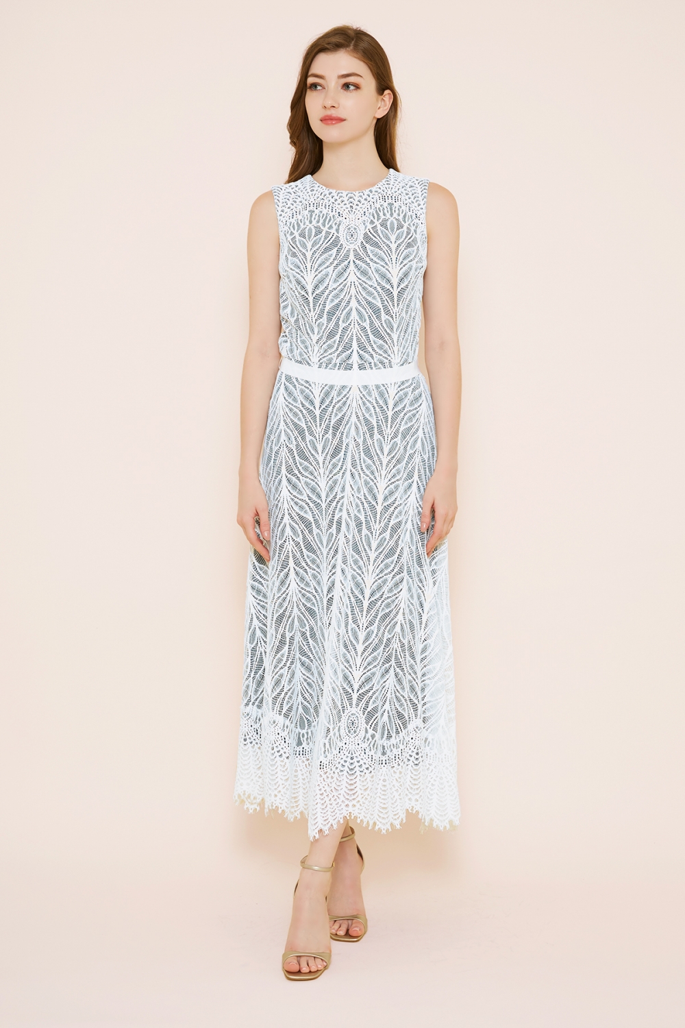スカートが動くたびにリーフが揺れているように見える、 モダンでクラシカルなミモレ丈のドレス。 縦レースが身体の幅を細く見せ、スタイルアップ効果があります。 レースの美しさが際立つシンプルなフィット&フレアのデザインにウエストベルトがアクセントに。 デイリーでもさらりと着れる優秀な一枚です。 モデルサイズ 身長169cm B:80cm W:60cm H:89cm /サイズ2着用 ■新作商品一覧はこちら■ □ミディアムドレス一覧はこちら□ ■デイリードレス一覧はこちら■ □ブルーの商品一覧はこちら□ ■アイボリーの商品一覧はこちら■
