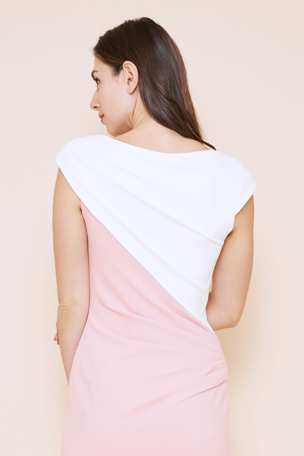アイボリー×ピンクのバイカラーが、柔らかくフェミニンな印象のドレス。