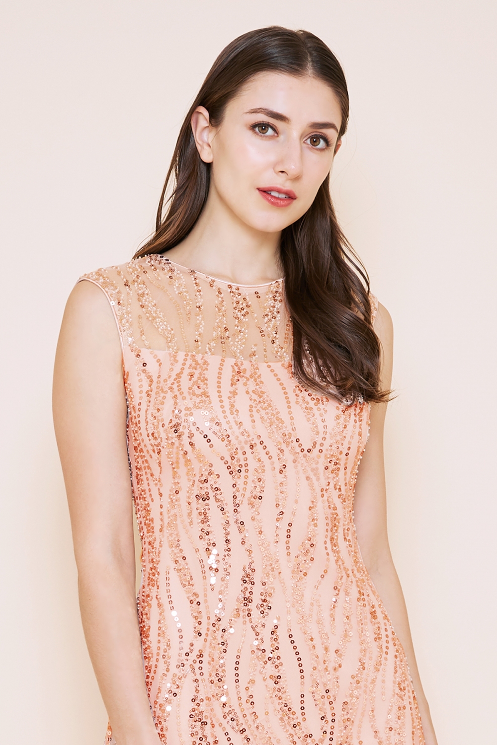 優しいペールピンクカラーのスパンコールがジュエリーのように輝く華やかなドレス。