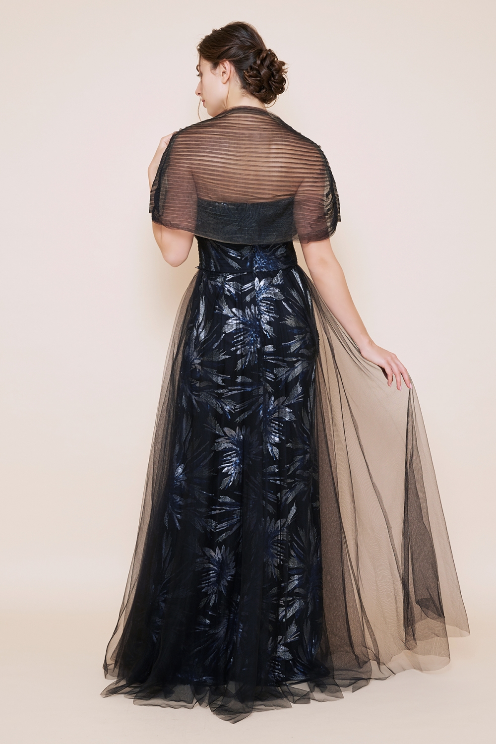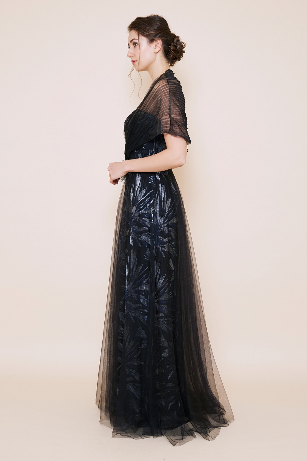 ブラシストロークで描かれたダリアのスパンコール刺繍がインパクトあるデザイン。 チュールのロングケープが裾まで繋がり広がって、柔らかく優雅な雰囲気がプラスされます。 スパンコールがまばゆいばかりにきらめき、ブラックでも着た人も会場も華やかに彩る特別なロングドレスです。 裏地には肌触りの良いジャージ素材を使用しているので、肌あたりも安心してご着用いただけます。 ※チュールのロングケープはウエストで固定されているため取り外しはできません。 モデルサイズ 身長171cm B:82cm W:57cm H:89cm /サイズ2着用 ■新作商品一覧はこちら■ □ロングドレス一覧はこちら□ ■ネイビーの商品一覧はこちら■ ■ブラックの商品一覧はこちら■
