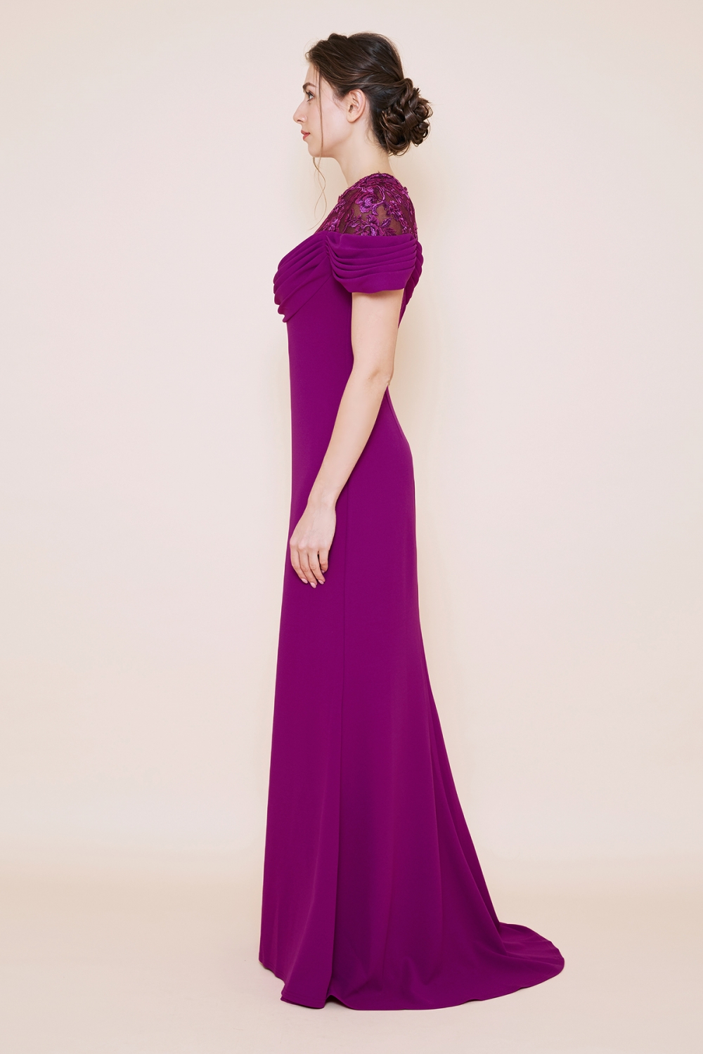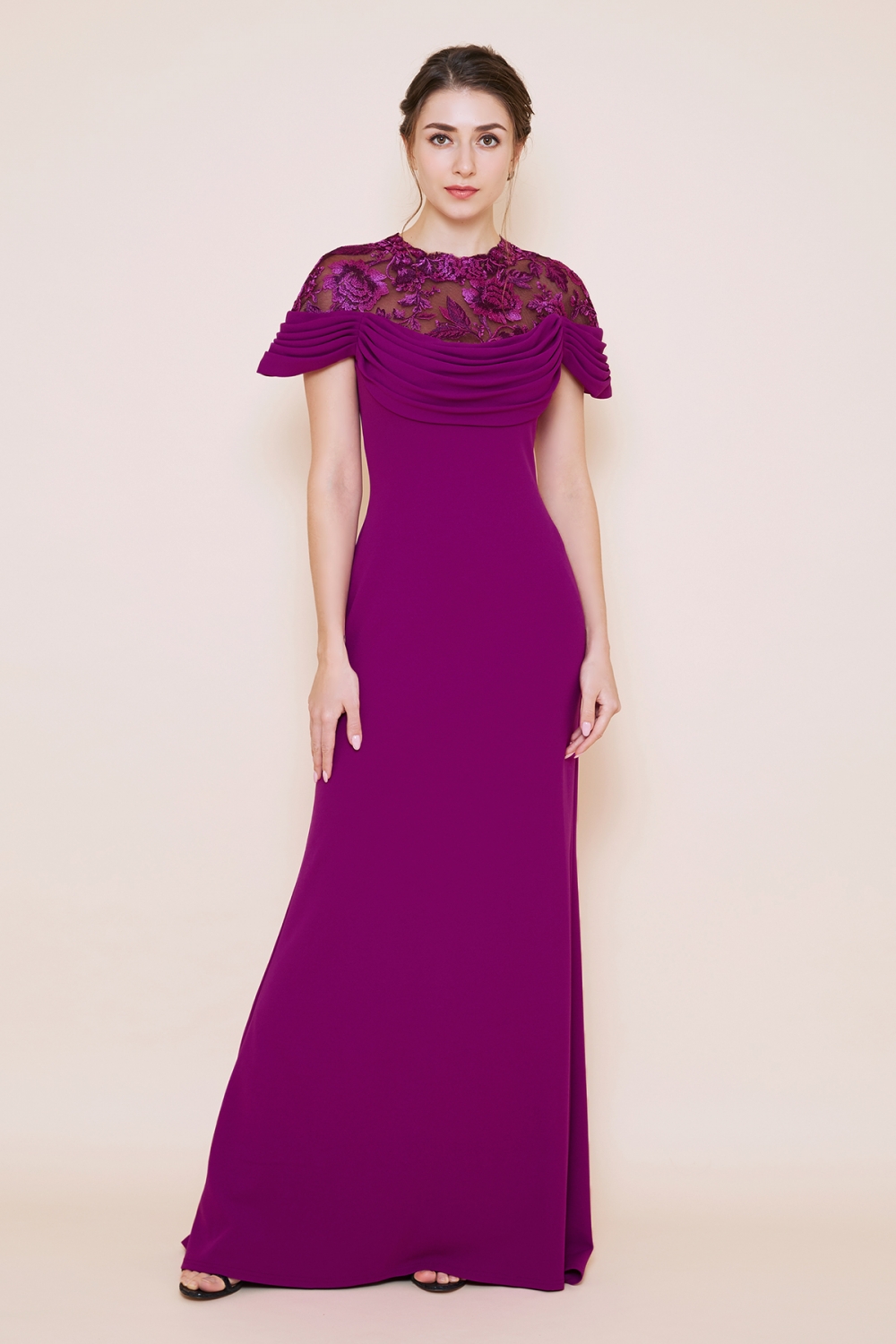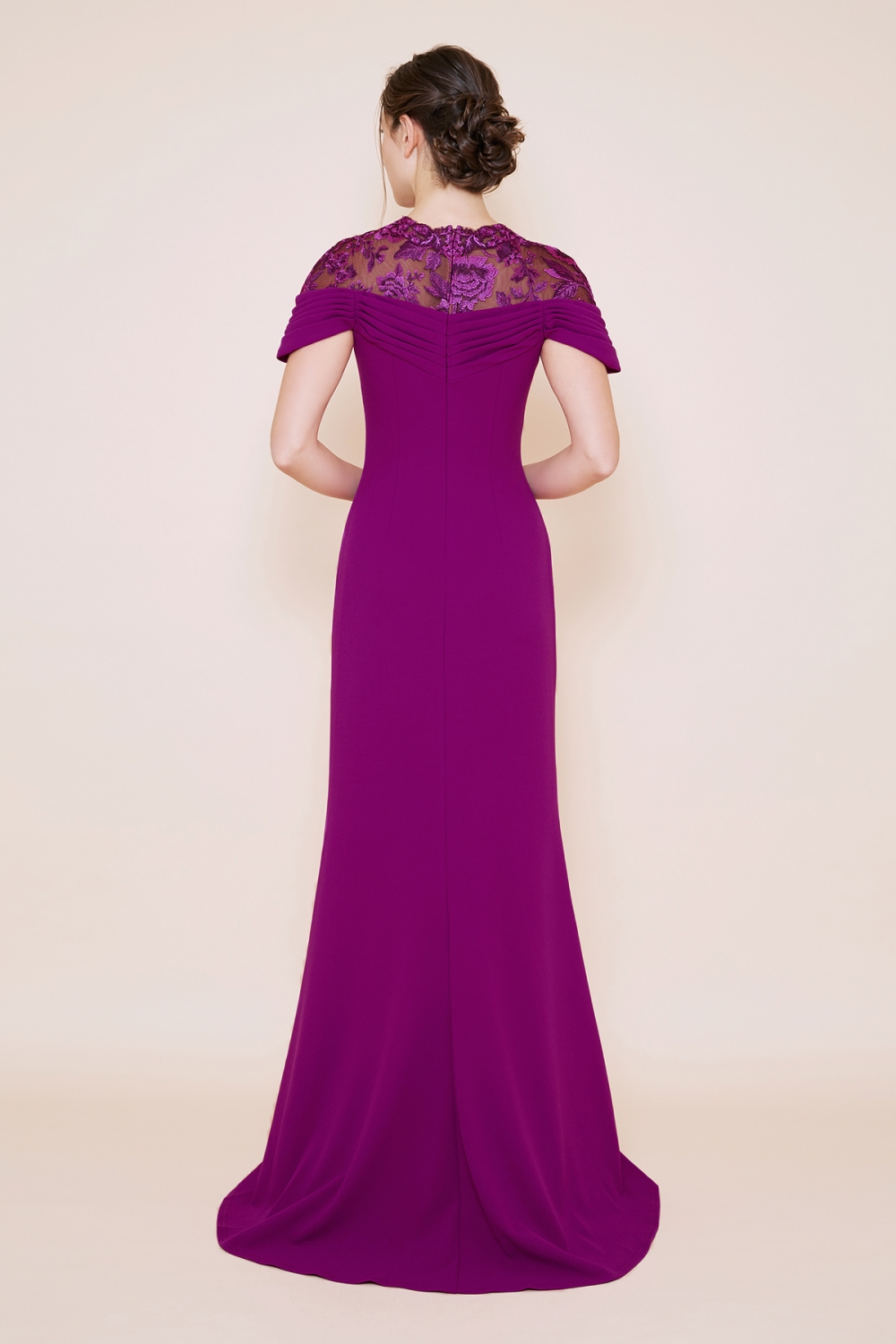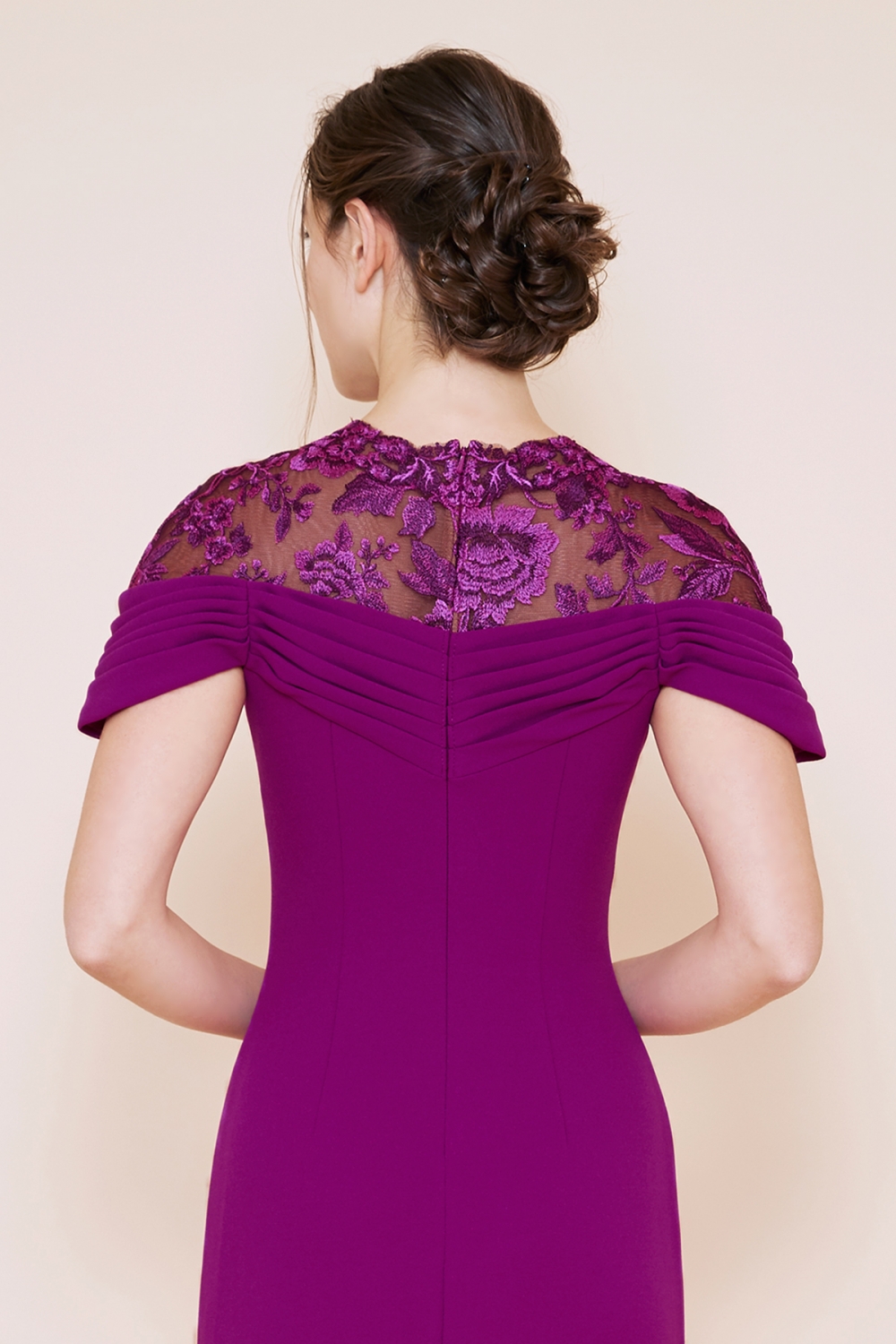 艶やかな刺繍が施されたチュールのネックラインがエレガントなドレス。ゆったりとしたドレープはキャップスリーブまで続き、二の腕をカバーしてくれます。柔らかな表情のトップに相対するキュッと締ったウェストがスタイリッシュです。Aラインのスカートは、ふわりと揺れて歩き姿も美しく見せてくれます。 モデルサイズ 身長171cm B:82cm W:57cm H:89cm /サイズ2着用 ■新作商品一覧はこちら■ □ロングドレス一覧はこちら□ ■パープルの商品一覧はこちら■