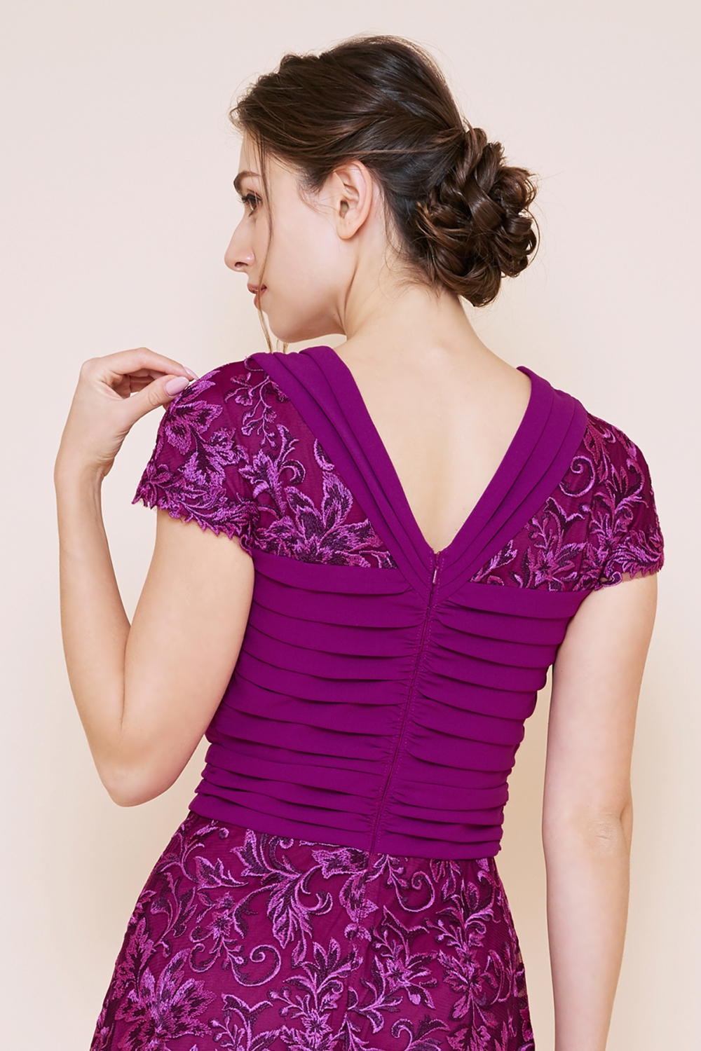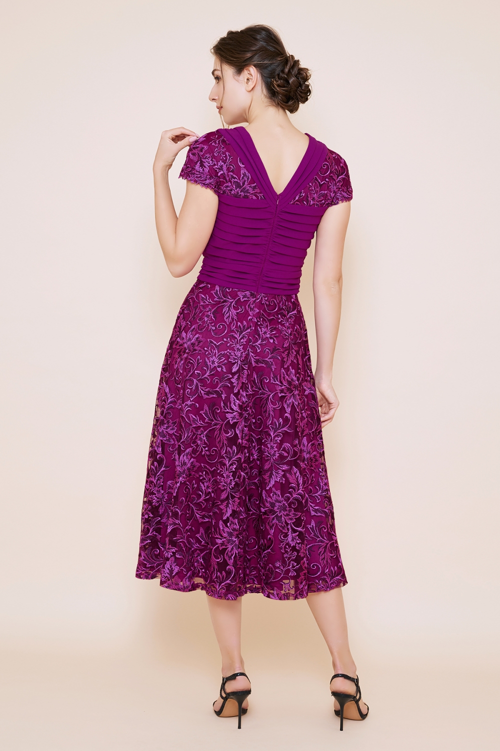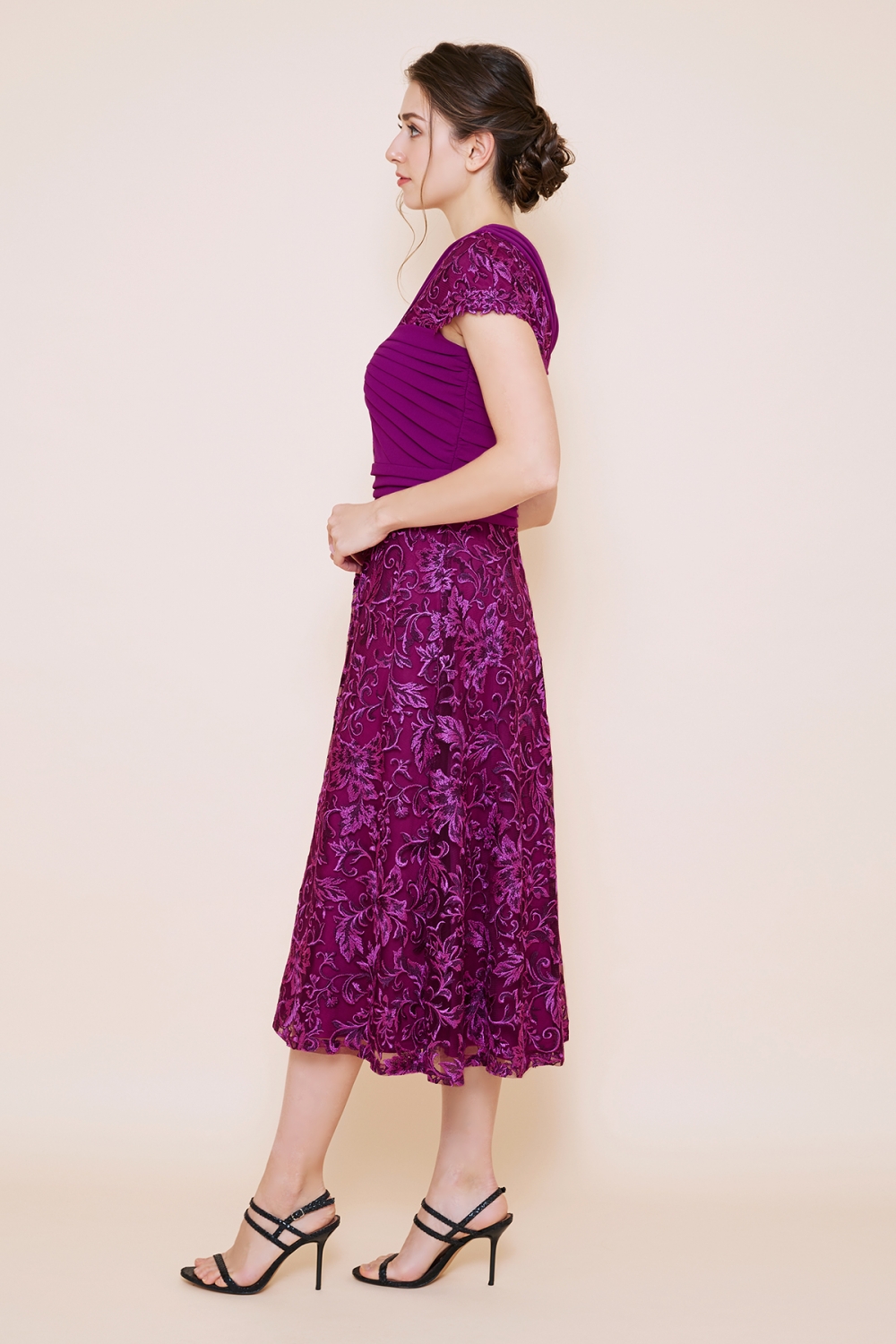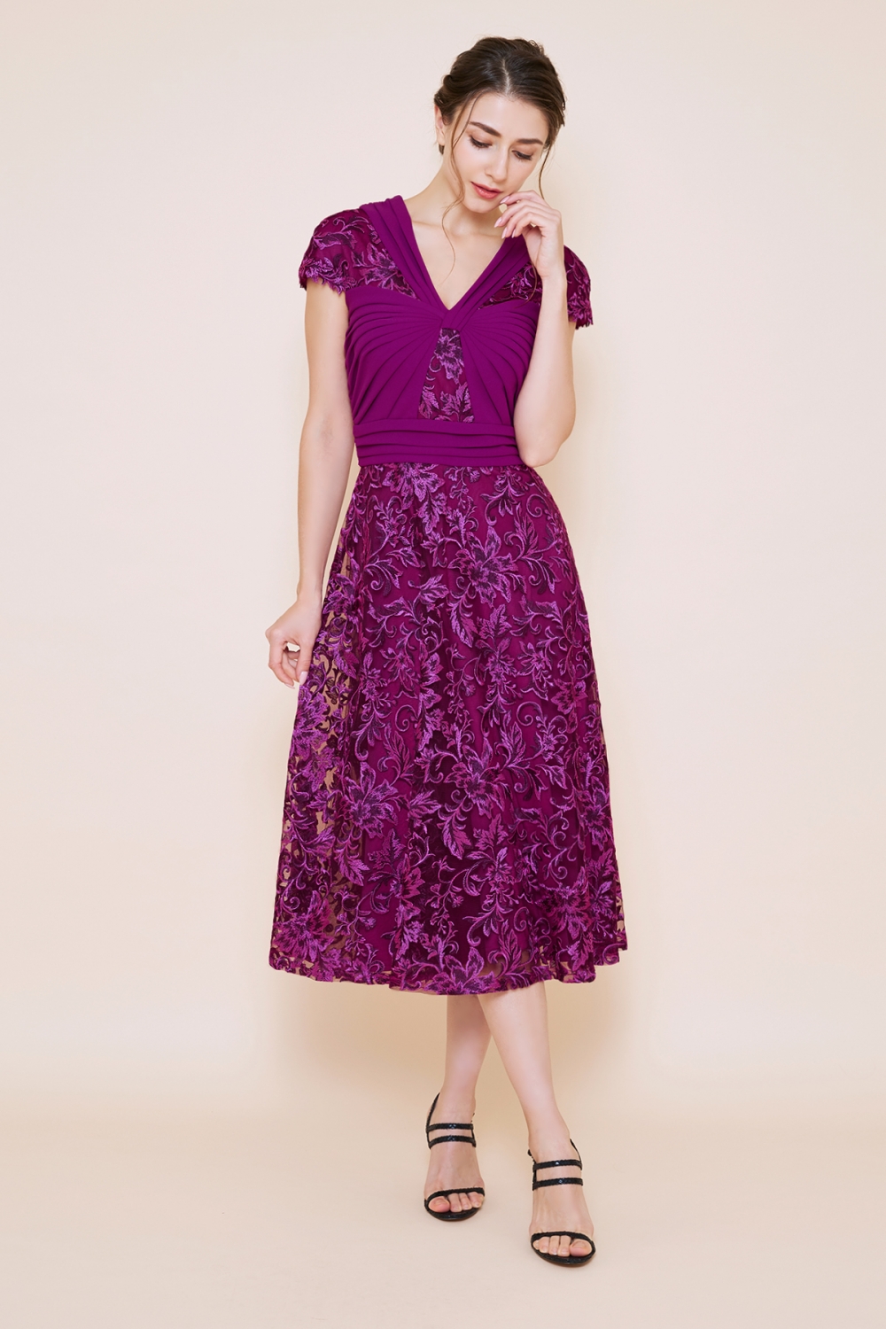 華やかなマジェンタカラーのミモレ丈ドレス。艶やかな刺繍が豪華でラグジュアリーな雰囲気を醸し出します。上にビスチェを纏ったかのようなデザインはフェミニンで総レースをまろやかにしてくれます。足が長く見えるようウェストラインを少しだけ上へ配置しているため、バランスよく着用できます。歩くたびに揺れる柔らかなスカートがエレガントです。