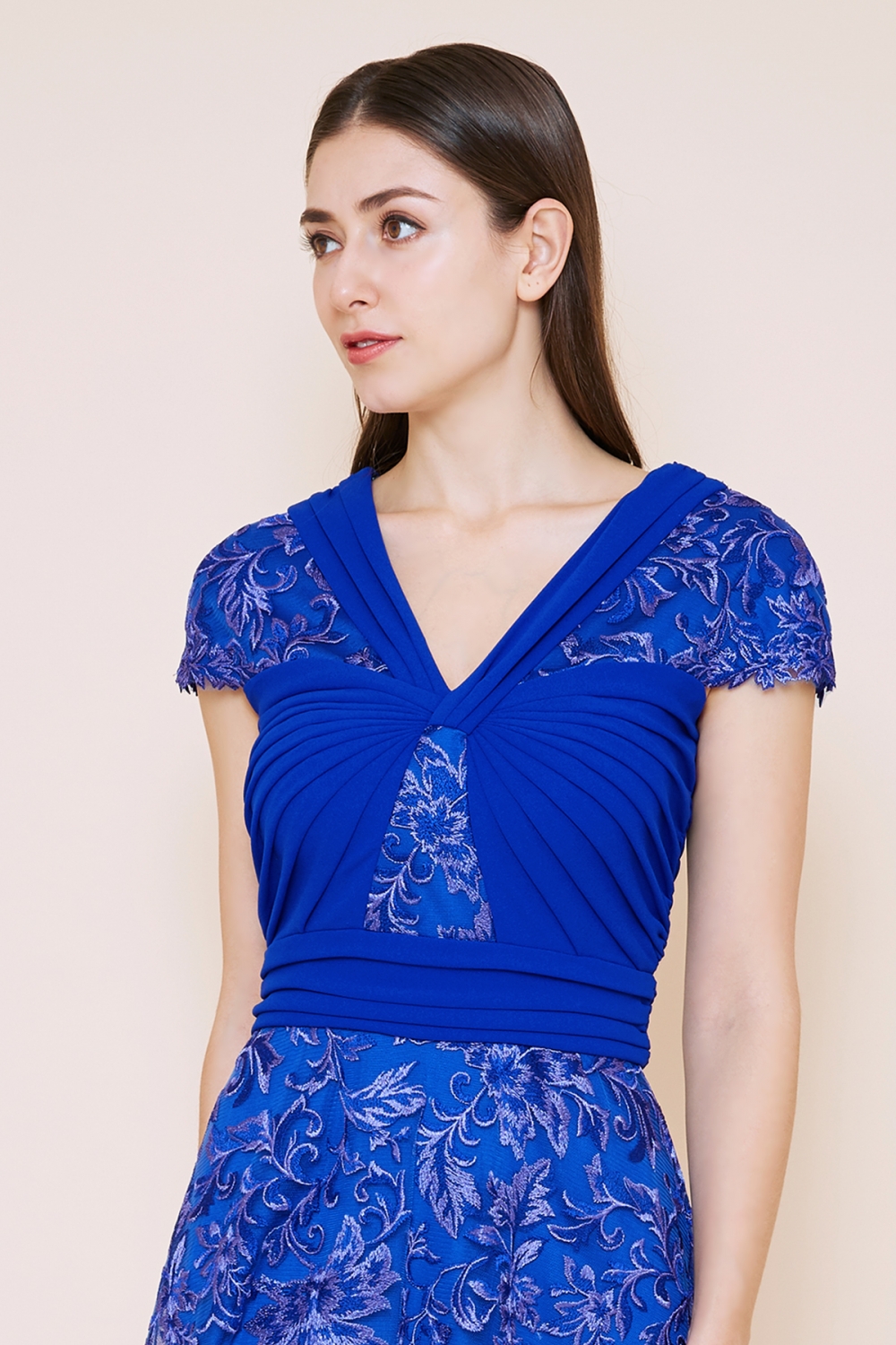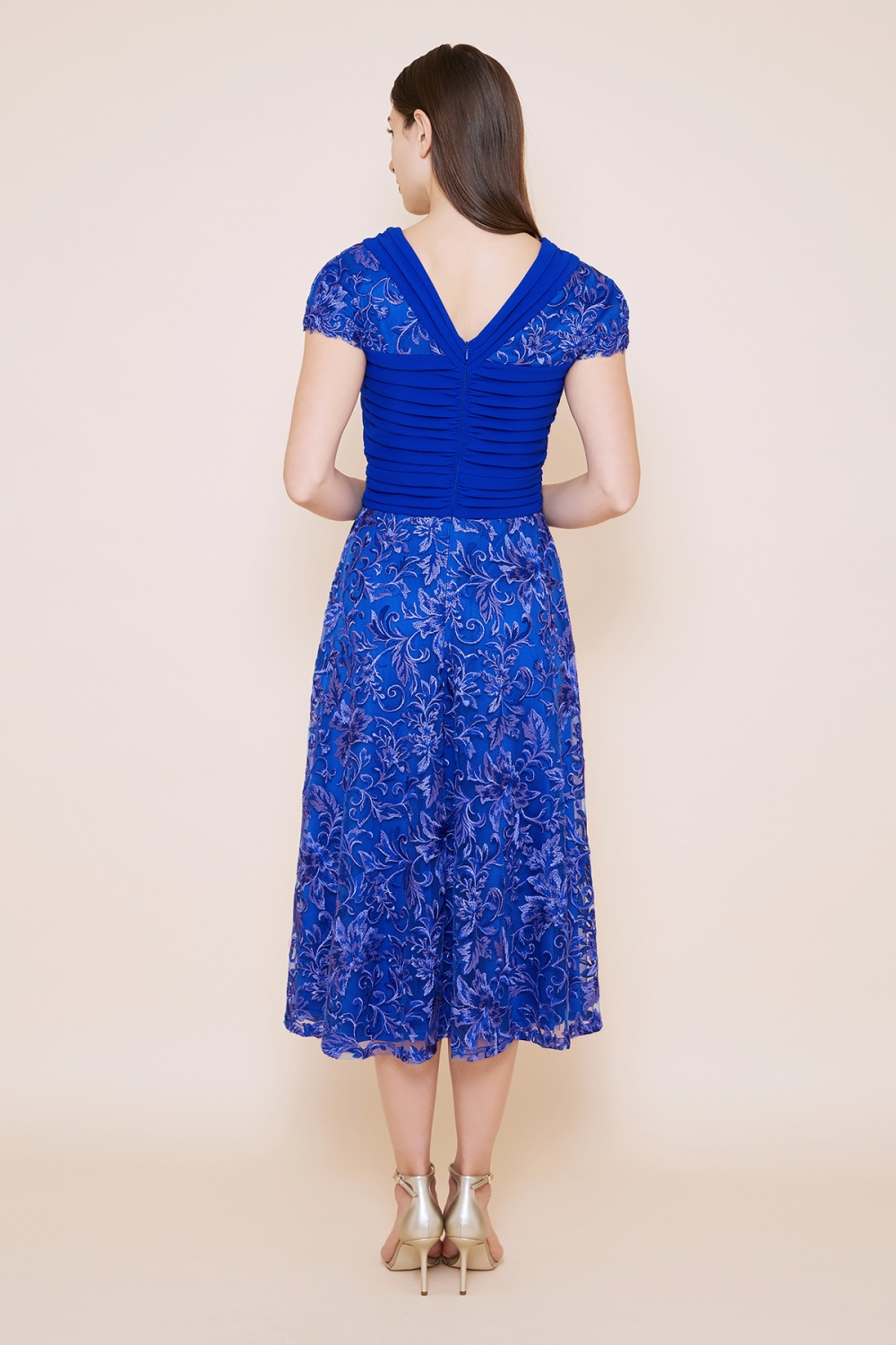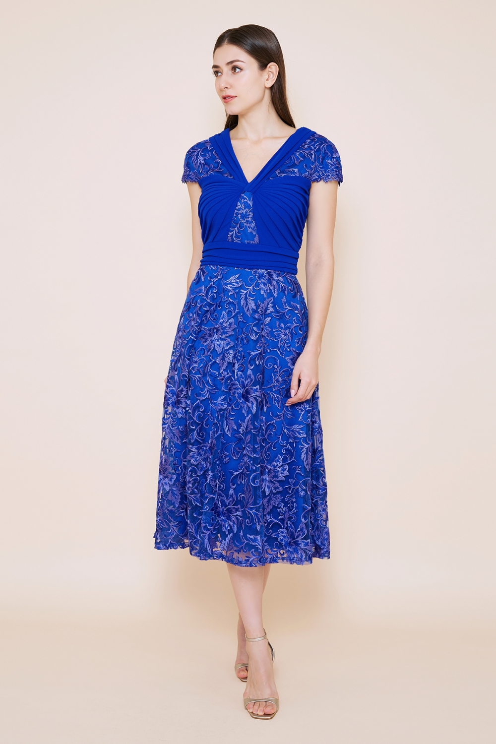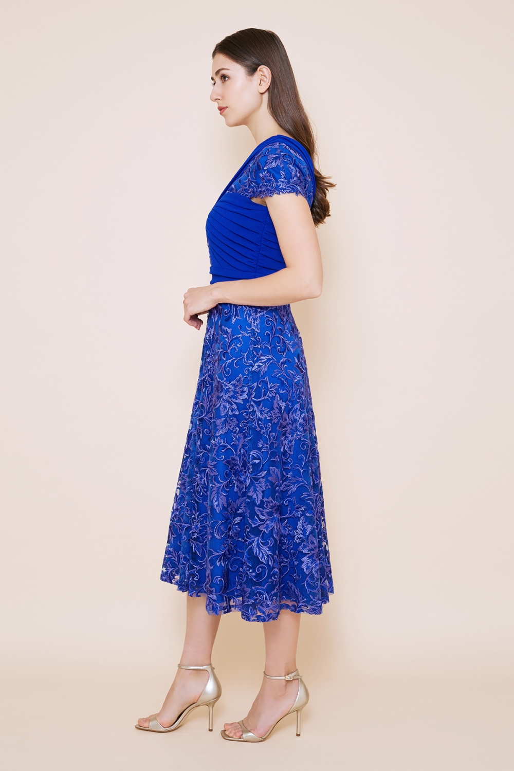 鮮やかなブルーが美しいミモレ丈ドレス。艶やかな刺繍が豪華でラグジュアリーな雰囲気を醸し出します。上にビスチェを纏ったかのようなデザインはフェミニンで総レースをまろやかにしてくれます。足が長く見えるようウェストラインを少しだけ上へ配置しているため、バランスよく着用できます。歩くたびに揺れる柔らかなスカートがエレガントです。