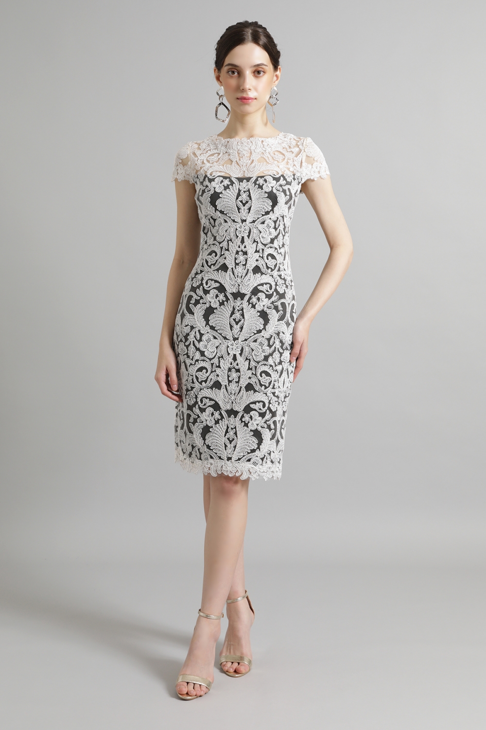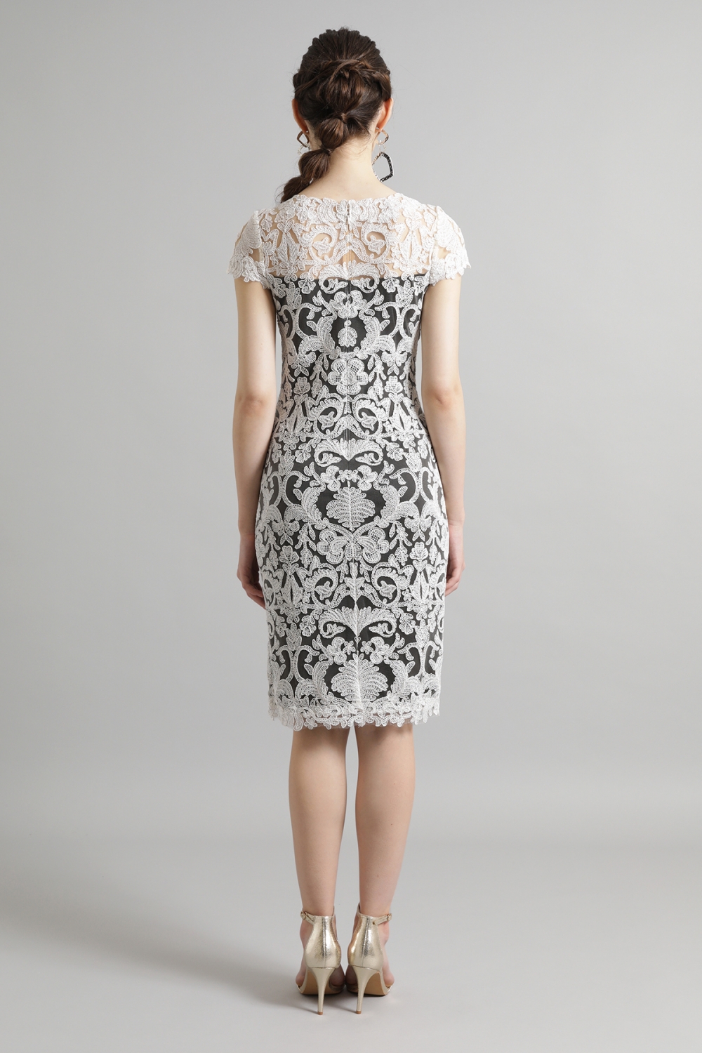 立体感のある繊細なコードレースを使用したTADASHI SHOJI定番のドレスは、上品なデザインが年代問わず魅力を引き出してくれるエレガントな一着です。