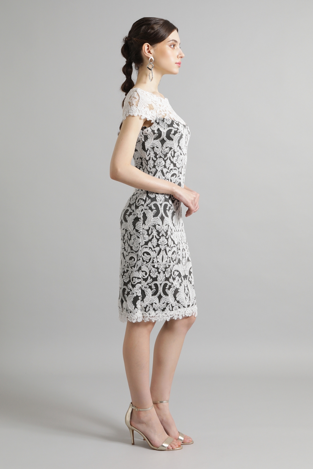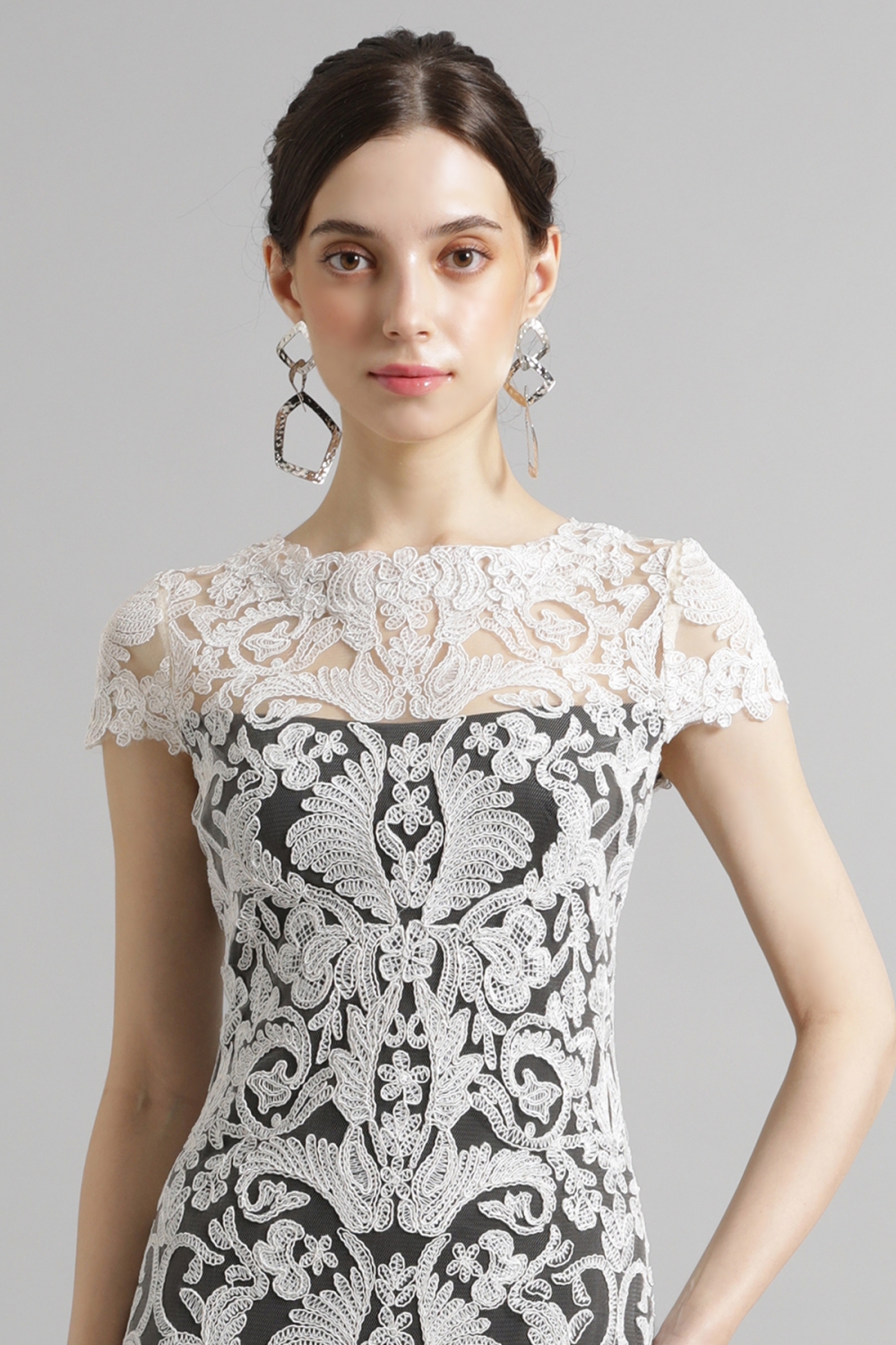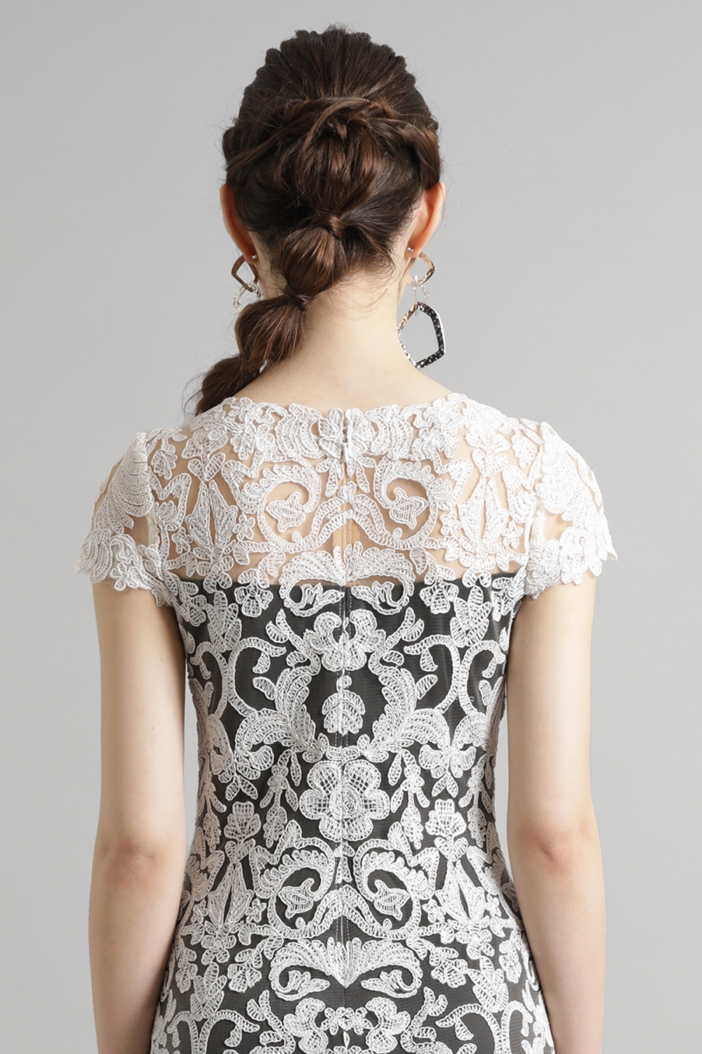 アイボリーのレースを黒のライニングが引き締めます。派手過ぎず、さわやかな印象で、パーティーにも、ディナーやランチでもご着用いただけます。