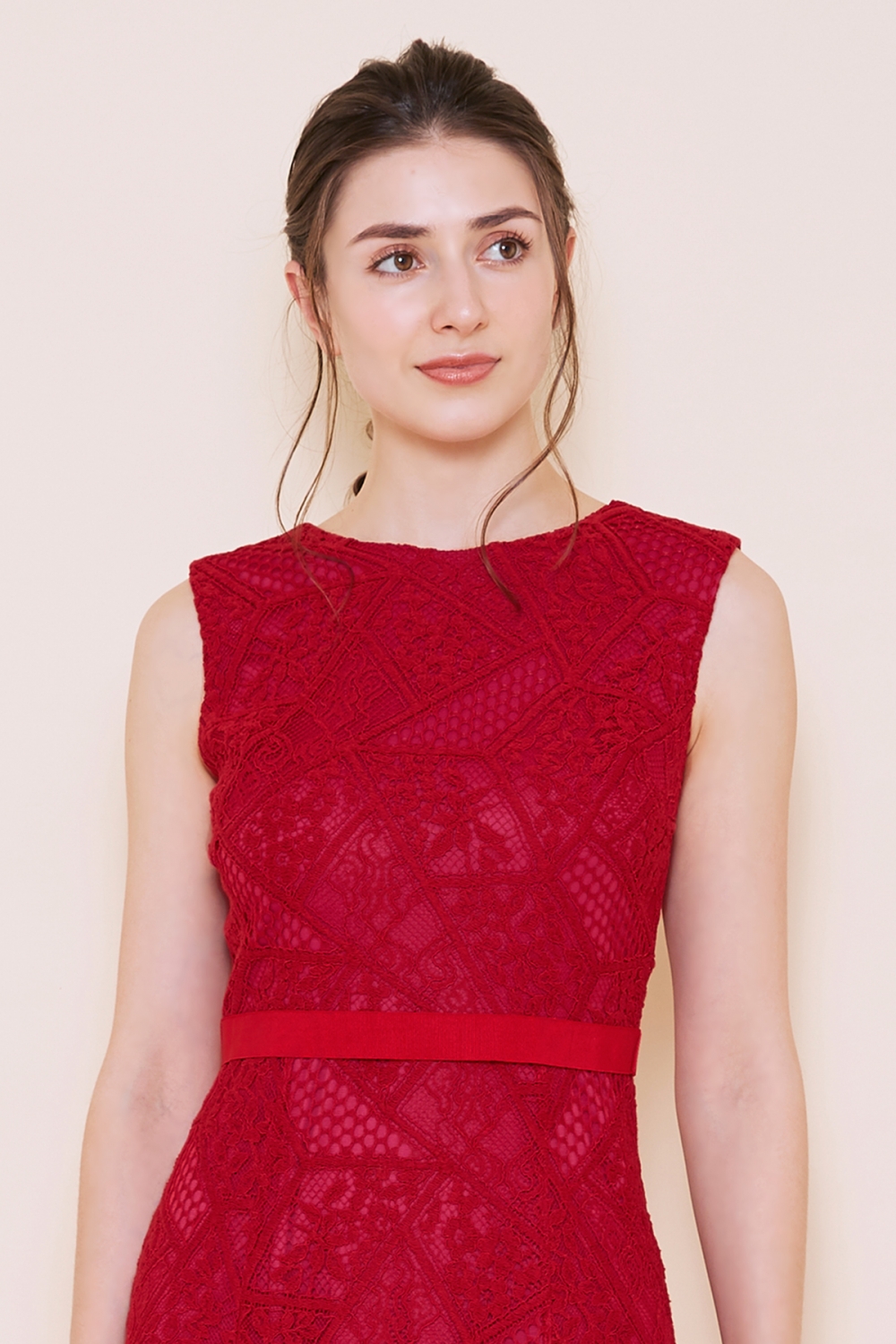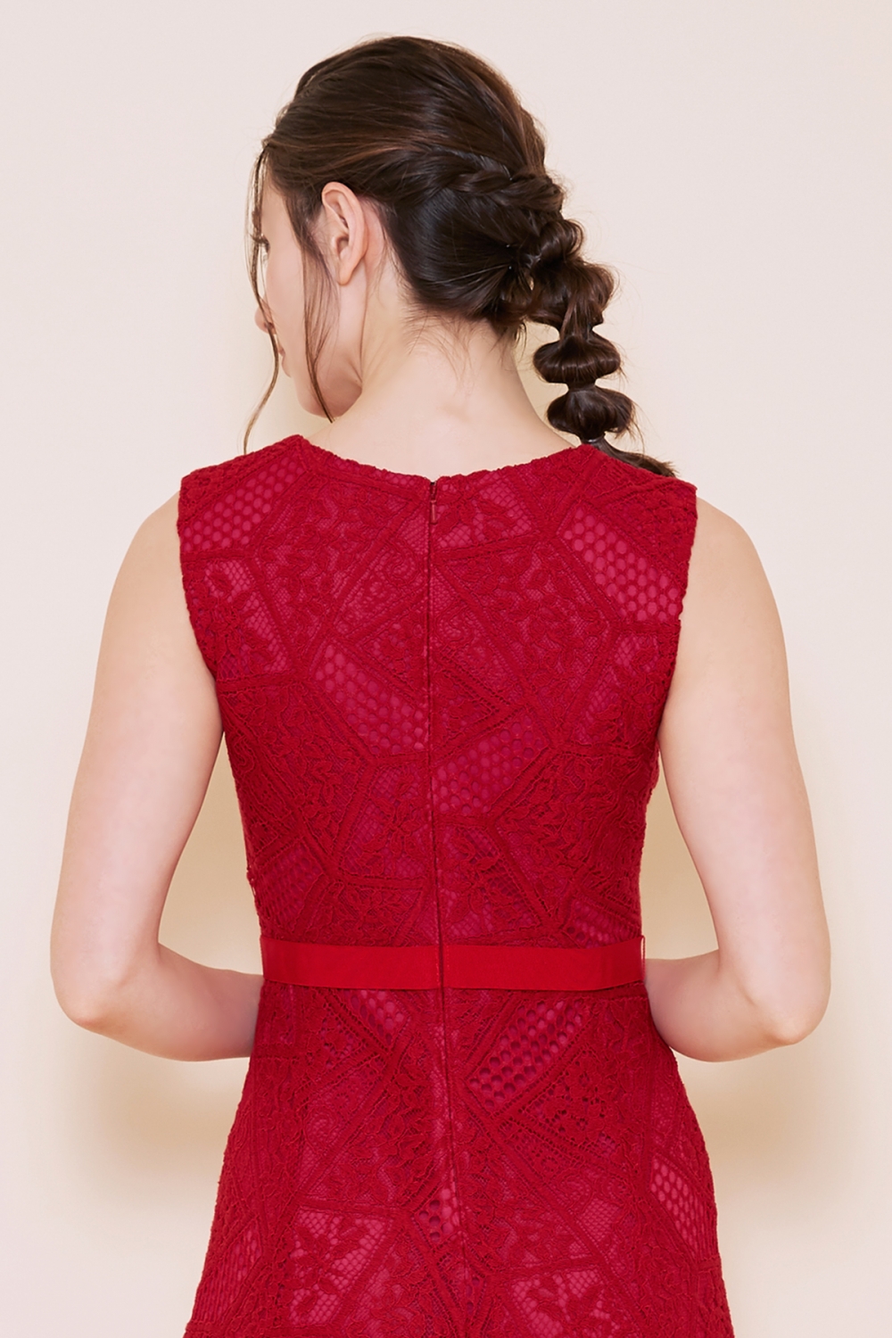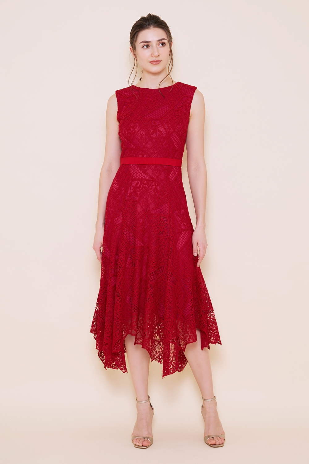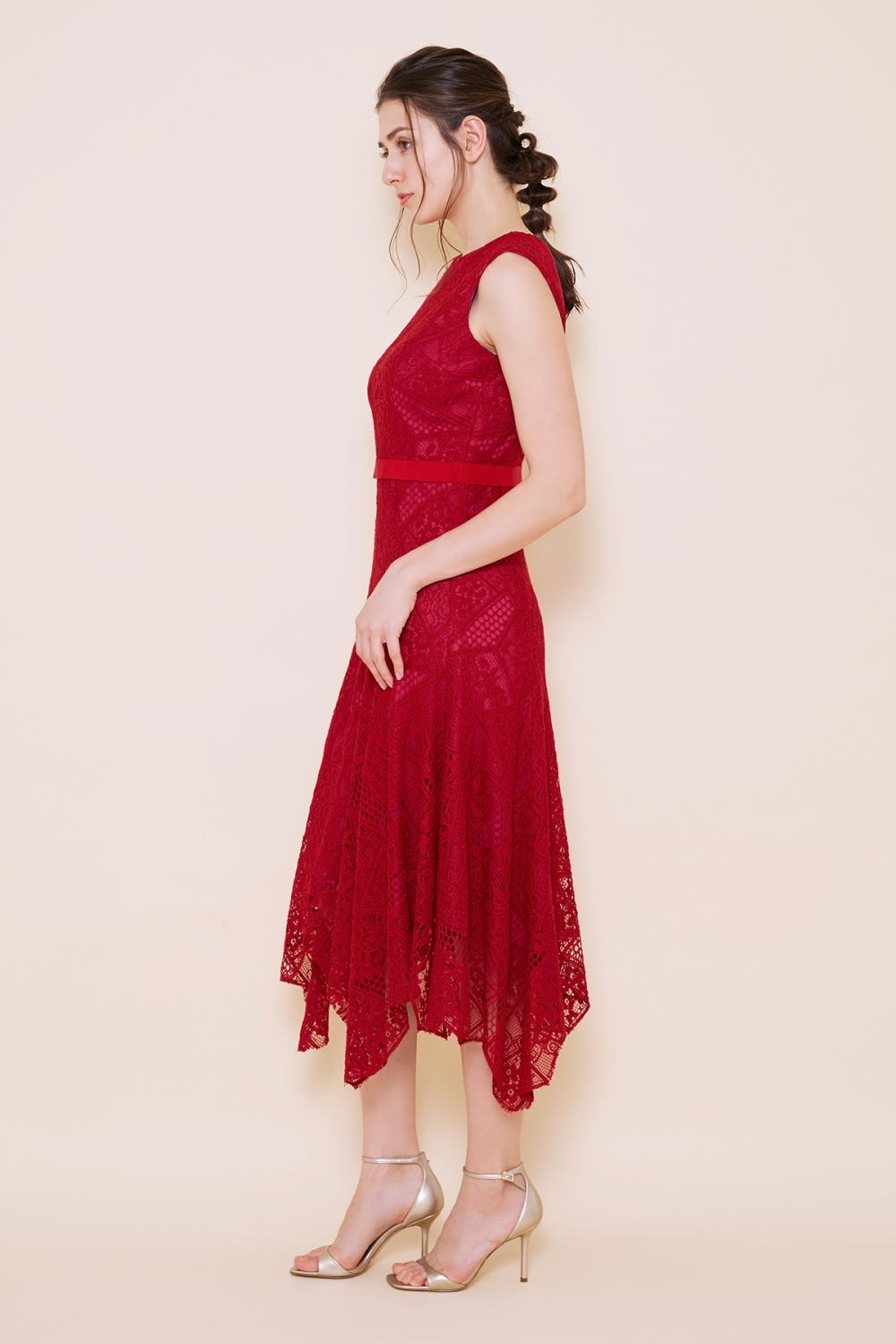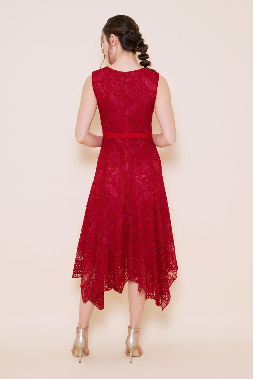 赤のパッチワークレースとフューシャレッドの裏地を組み合わせることで赤の印象をより鮮やかにしたミモレ丈ドレス。複雑なレース模様は高級感があり、なおかつ上品です。スカート部分は、程よいボリュームがあり、ハンカチーフヘムが歩くたびにふわりと揺れ、より一層華やかな雰囲気です。パーティーでは注目を集めること間違いない一着です。
