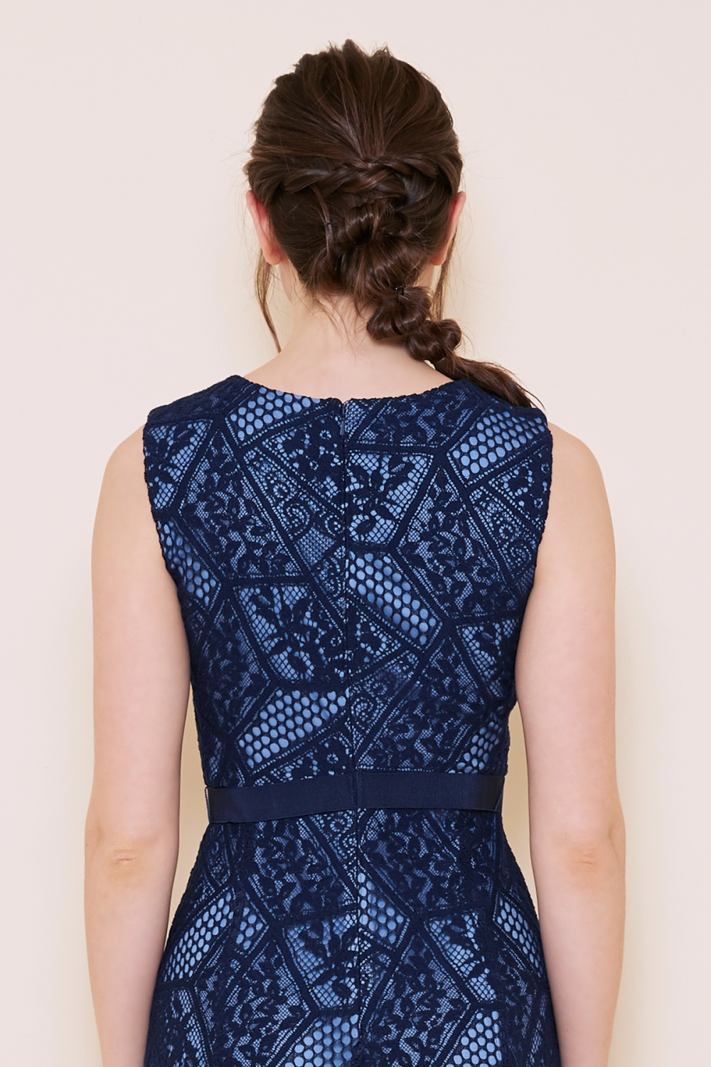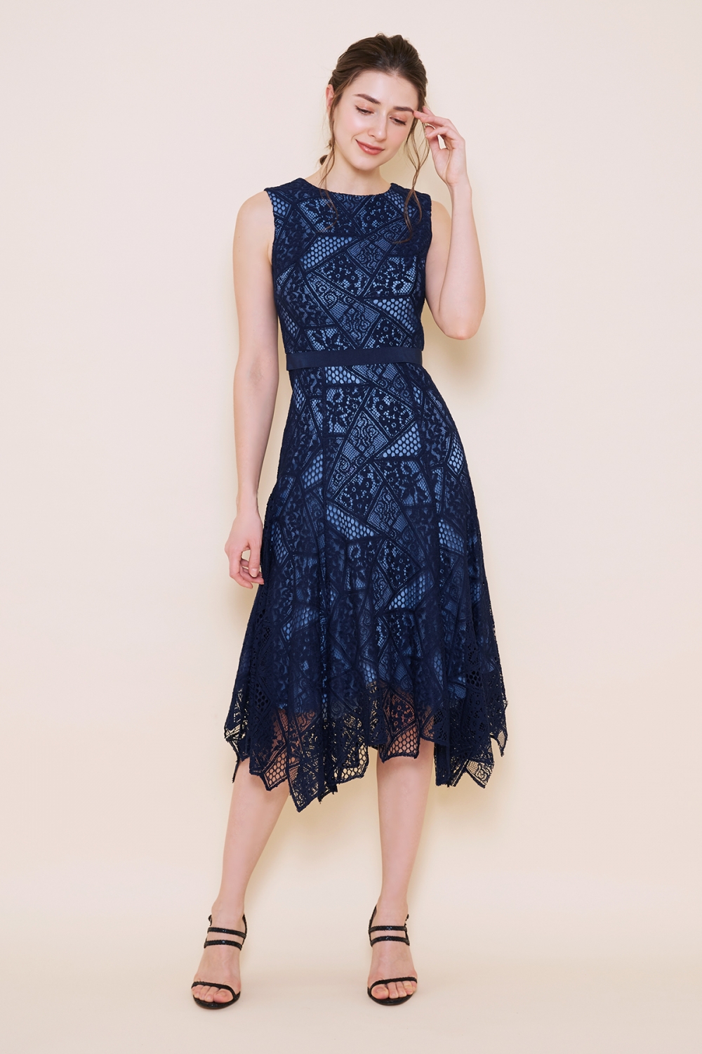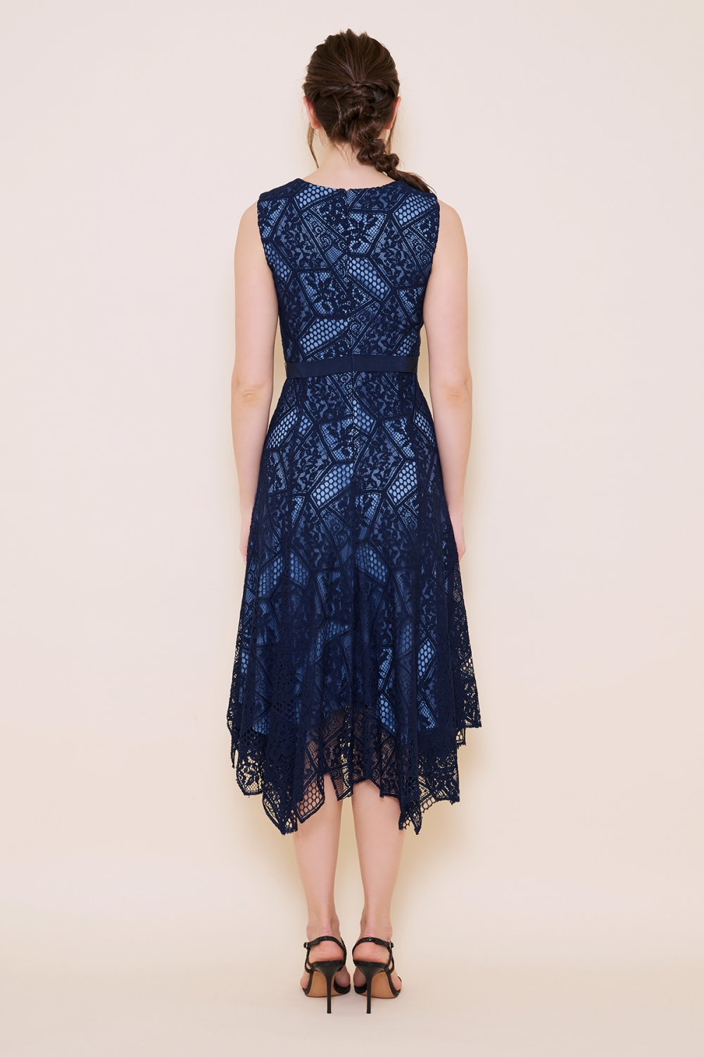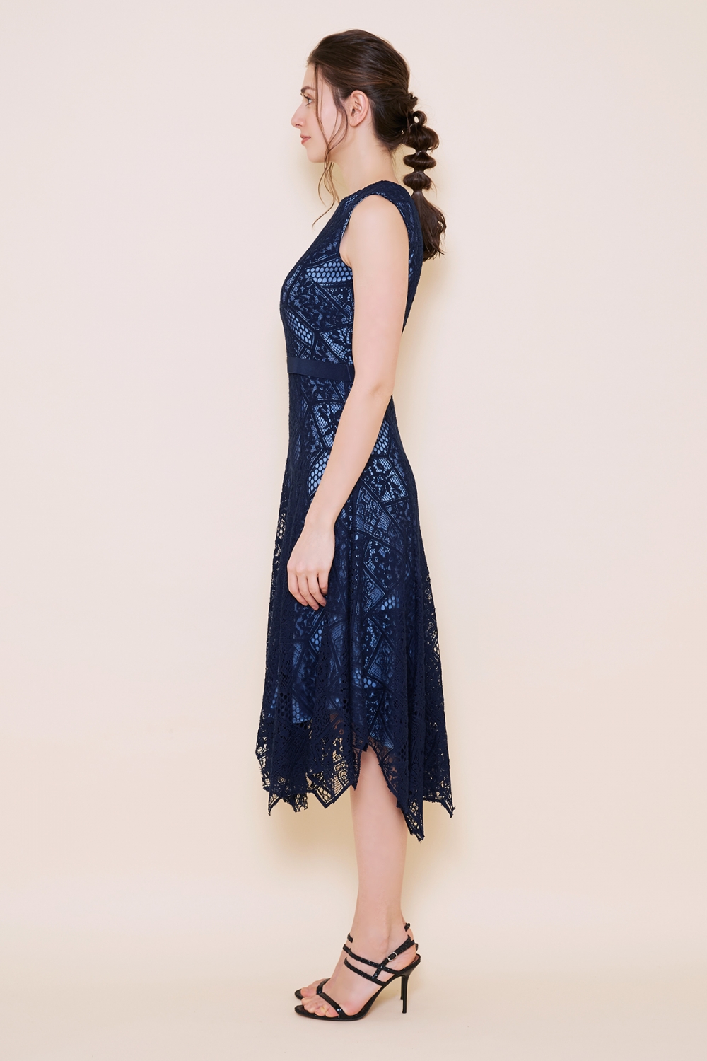 パッチワークレースが個性的で美しく、印象的なミモレ丈のドレス。複雑なレース模様が高級感を感じさせます。スカート部分は、程よいボリュームがあり、ハンカチーフヘムが歩くたびにふわりと揺れ、華やかな雰囲気です。単色のネイビーカラーは、派手になりすぎず、上品で、パーティーや結婚式におすすめの一着です。
