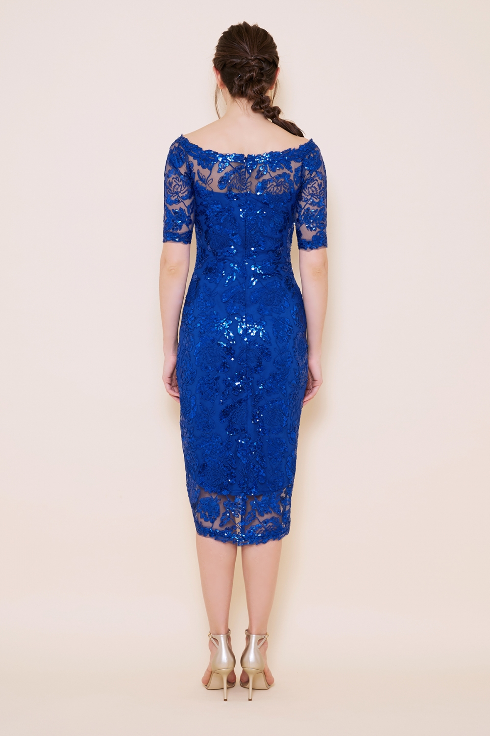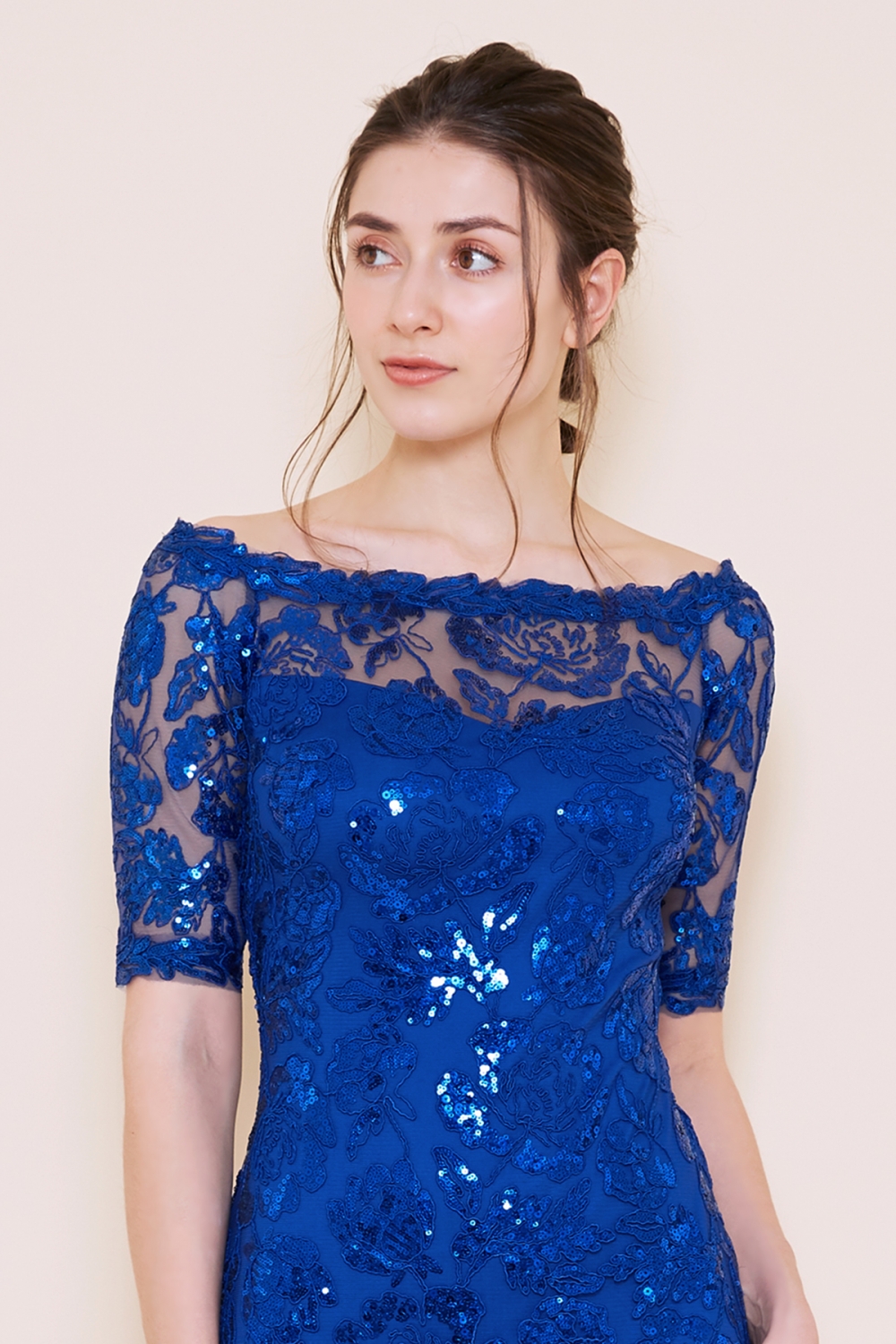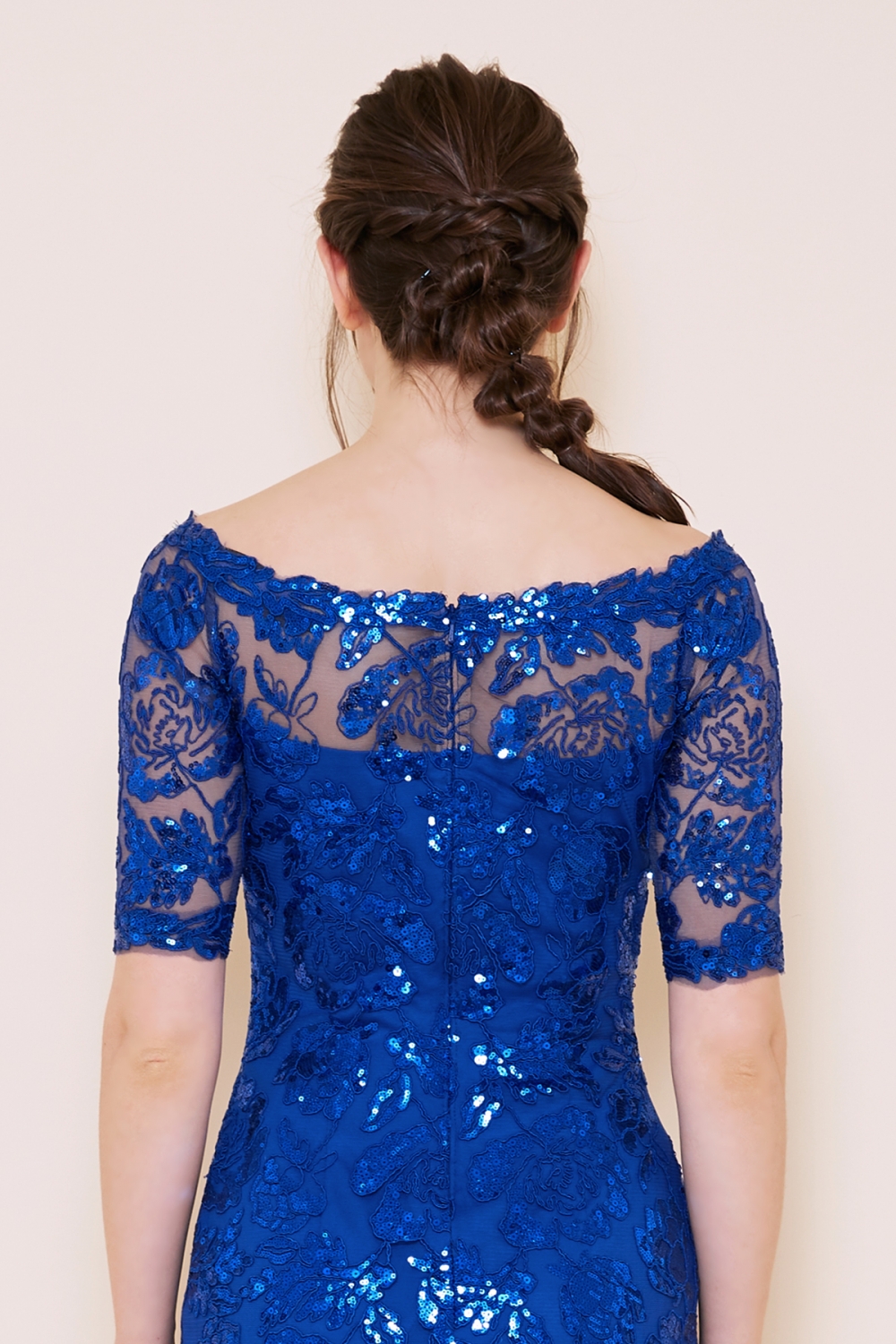 花柄のパイレット刺繍に輝くスパンコールが華やかな雰囲気を醸し出すミモレ丈のドレス。ボートネックで首周りをすっきりと見せ、5分のスリーブで落ち着いた印象を与えます。タイトなラインのミモレ丈が縦のラインを強調し、ほっそりと見えます。胸元、足元の程よい透け感が華やかでパーティーにピッタリです。