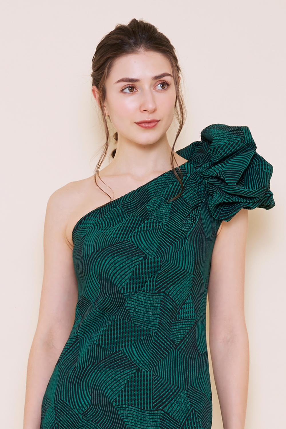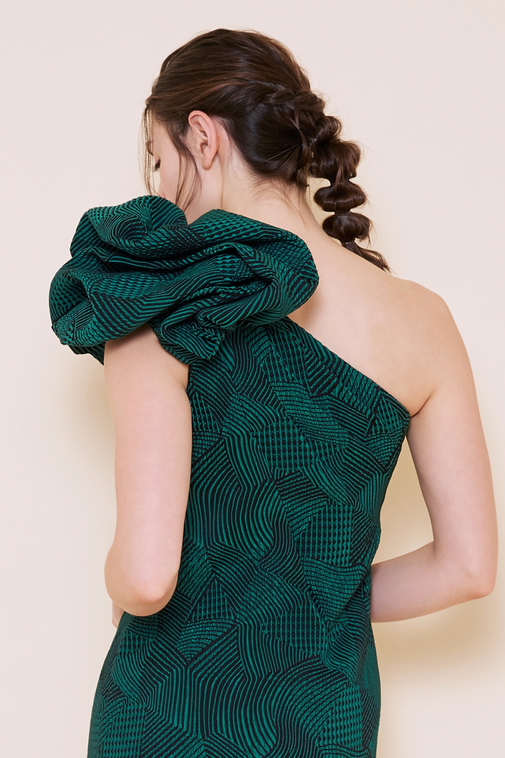 ワンショルダーに大きなモチーフのパフスリーブが目を引く遊び心のあるデザイン。ジオジャカードの生地がスタイリッシュでモダンです。肩に視線を惹きつけることによって、足が長く見えます。大胆なデザインですが、バランスが取りやすく着映えするドレスです。