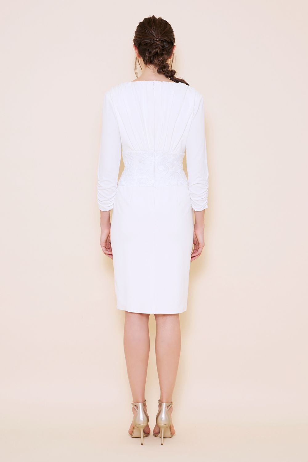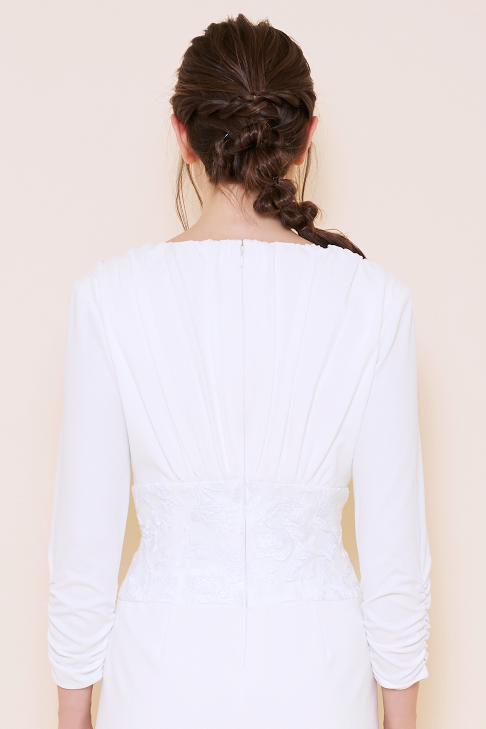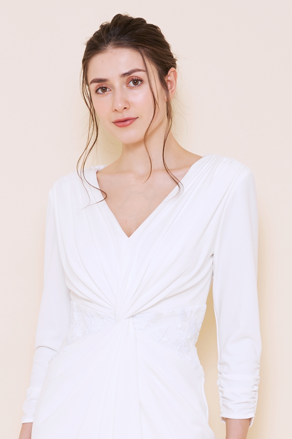 クレープジャージー生地の長袖ミディアムドレス。動きやすく、着心地の良い一着です。シンプルなデザインですが、中心に集めたドレープがウェスト周りをすっきりと見せ、袖のドレープがスタイリッシュです。このまま、オフィスやランチに、観劇へ。また、大ぶりなジュエリーと共にディナーやパーティーでもご着用いただけます。 モデルサイズ 身長171cm B:82cm W:57cm H:89cm /サイズ2着用 ■新作商品一覧はこちら■ □ミディアムドレス一覧はこちら□ ■デイリードレス一覧はこちら■ □アイボリーの商品一覧はこちら□