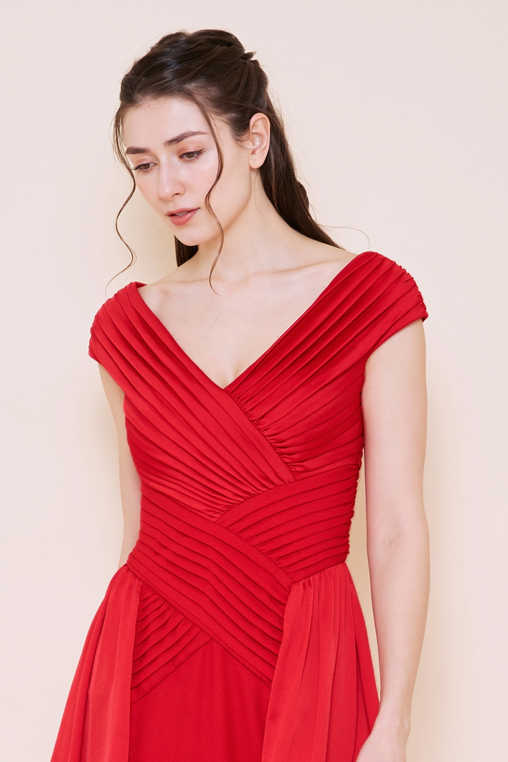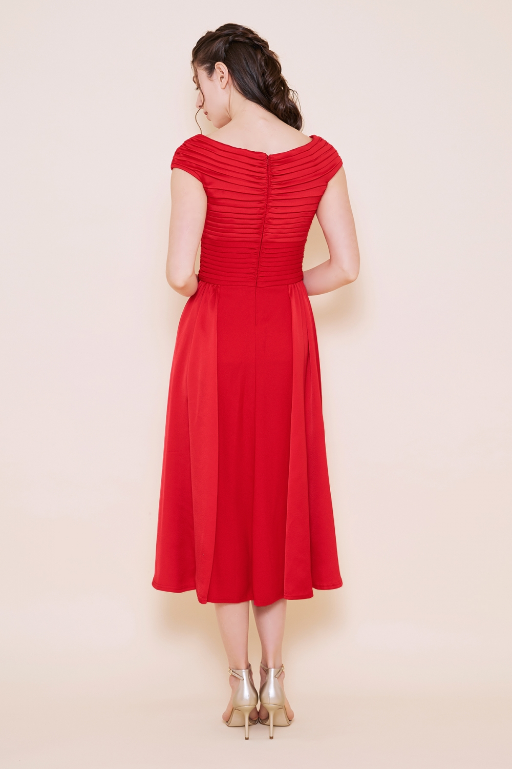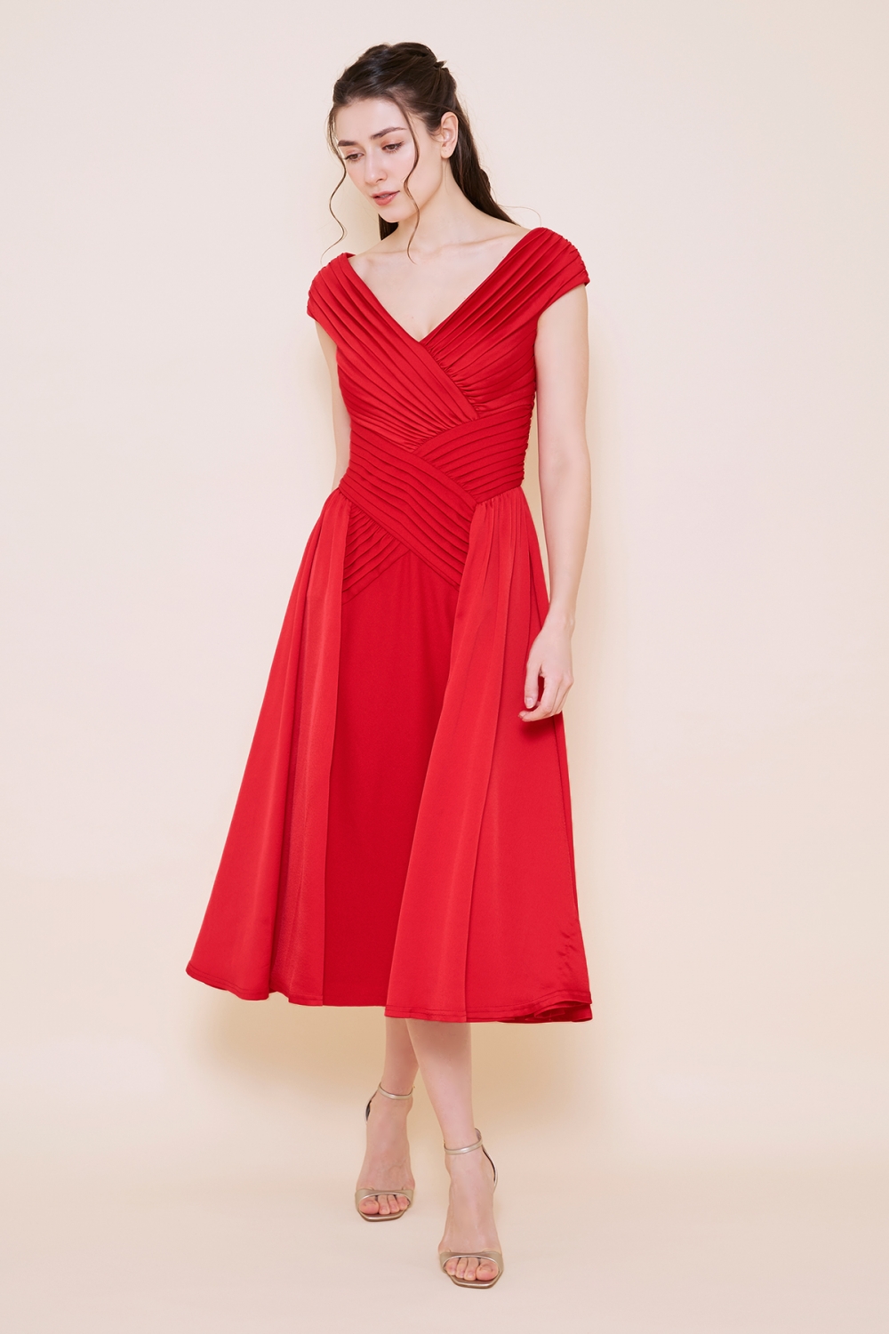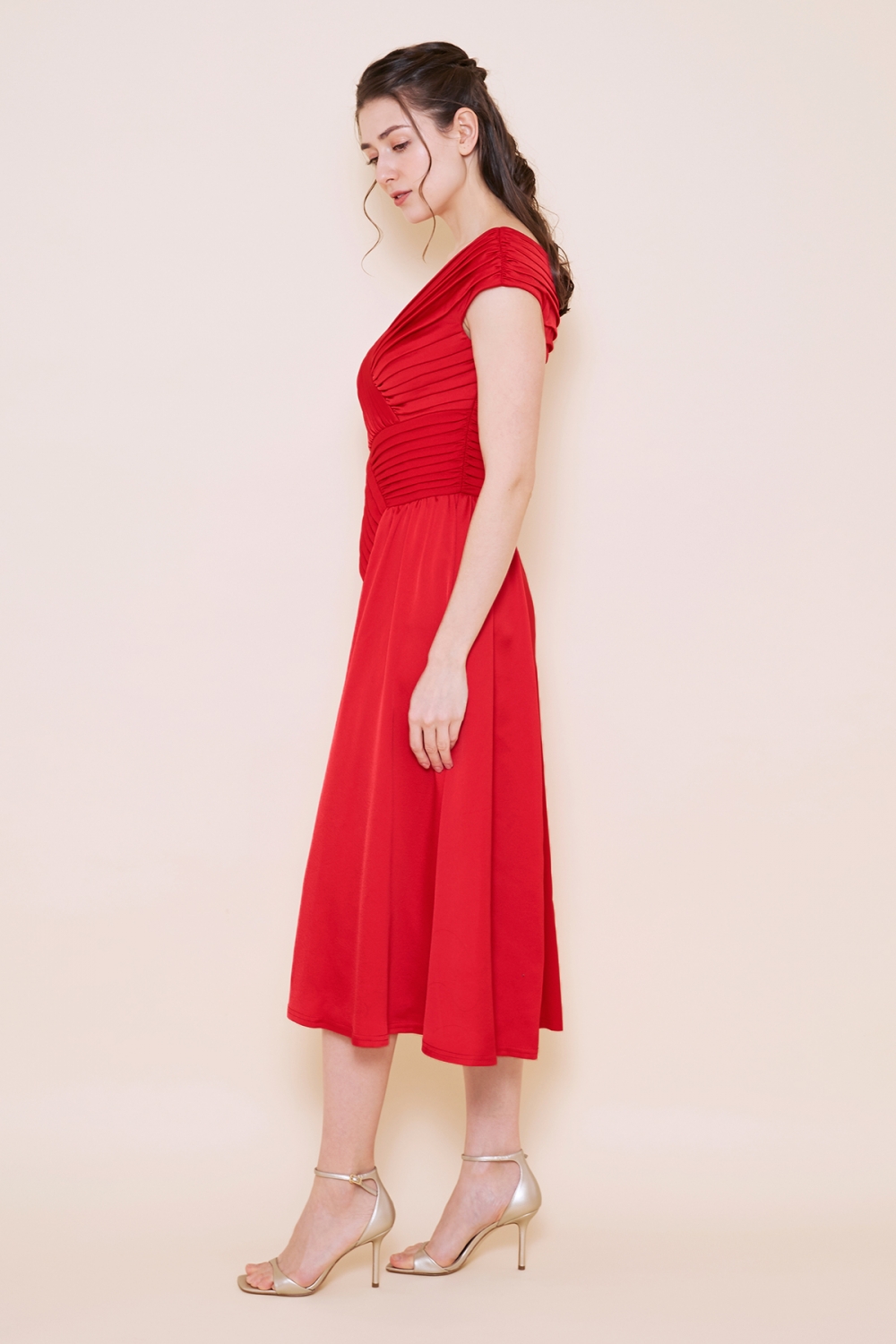 鮮やかな赤が印象的なミモレ丈のドレス。Vに開いた胸元がデコルテを美しく見せてくれます。交互に組み合わせたプリーツがモダンな印象を与えます。ウエストラインがすっきりして、スタイルアップが叶います。歩くたびにふわりと揺れるスカートがフェミニンで、可憐です。ディナーや観劇、パーティーへと色々なオケージョンで活躍する一着です。