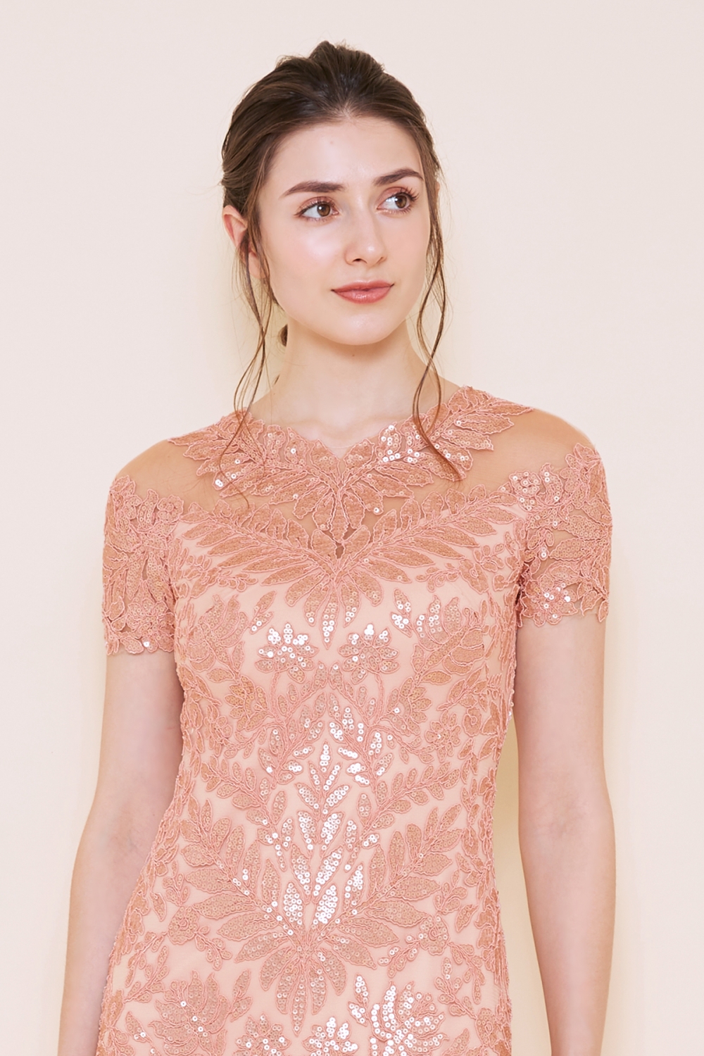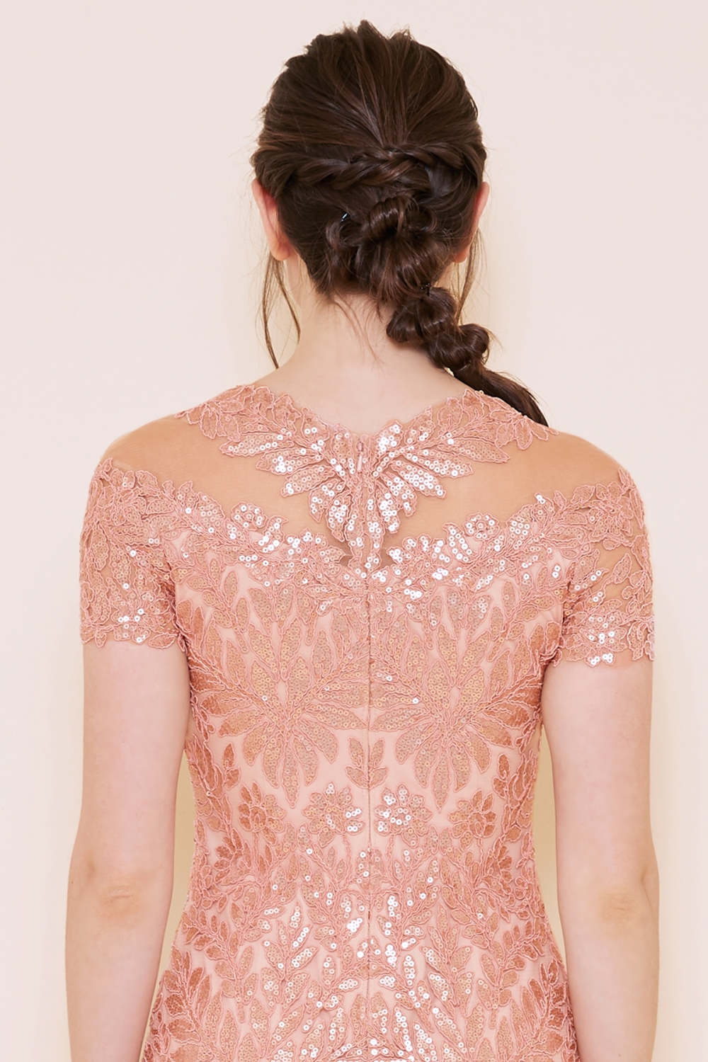 コード刺繍にスパンコールをあしらった、華やかなレースのミディアムドレス。Vネック部分と胸元をインビジブルなチュールでつないだデザインは、若々しさとエレガンスを兼ね備えています。ショートスリーブのデザインで、肩を包み込みながら、華奢な印象を与えます。柔らかなピンクのカラーが、優雅で女性らしい雰囲気を演出します。