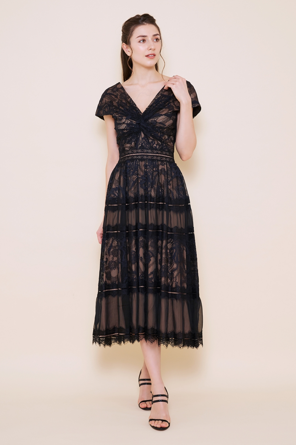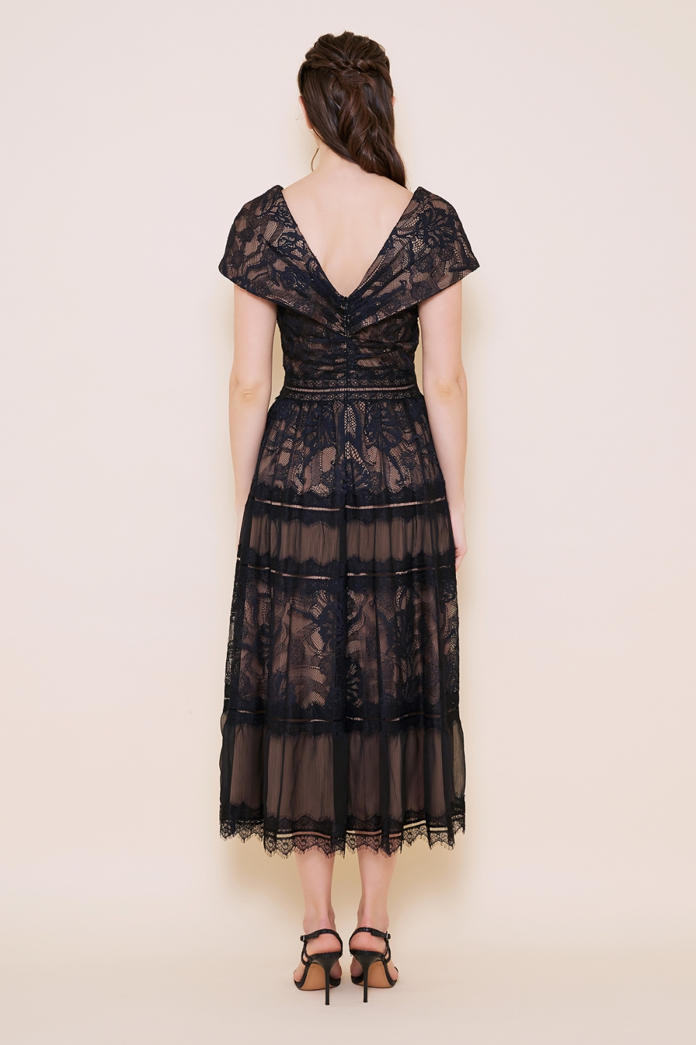 柔らかなレースを使用した優美なミモレ丈ドレス。レースのデザインが繊細で美しく、上品な印象を与えます。Vネックラインとキャップスリーブがフェミニンな魅力をを引き出し、トップの中心に集めたドレープデザインが、ドレスに立体感とエレガンスを添えます。スカート部分は、レースの美しい刺繍がスカート全体を飾り、プリーツ加工チュールがエアリーで軽やかです。ブラックにヌードカラーの裏地を合わせ、落ち着いた雰囲気を醸し出します。