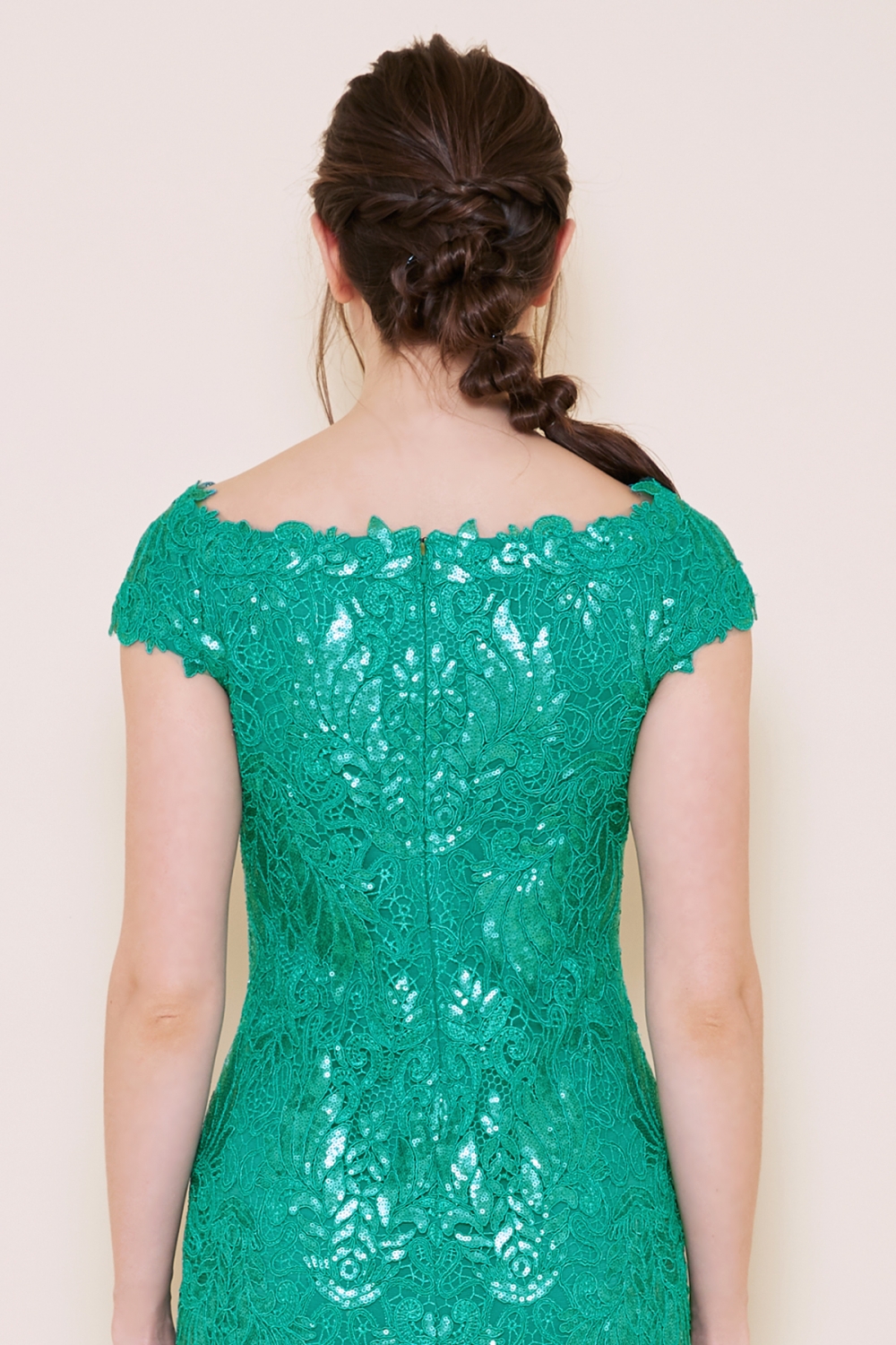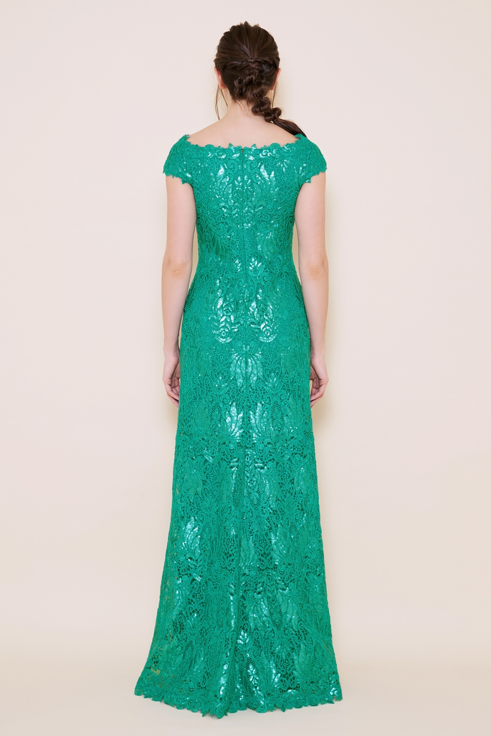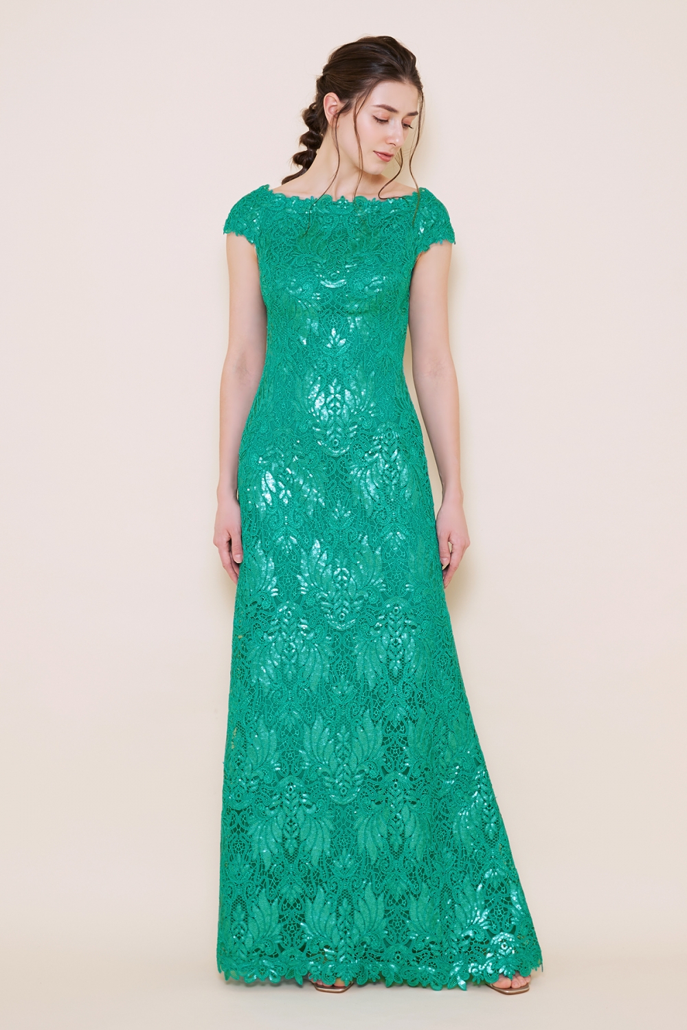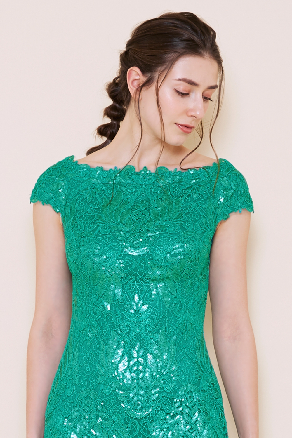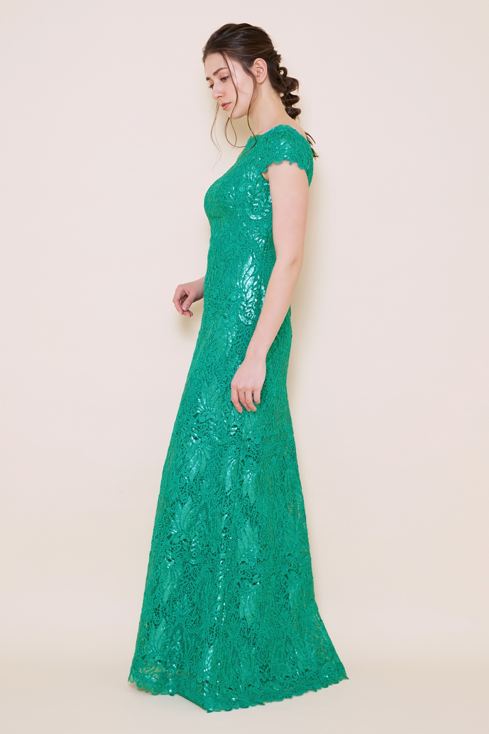 鮮やかなグリーンと美しい刺繍が魅力的なロングドレス。マットなスパンコールが派手過ぎず、上品です。オフショルダーデザインが女性らしい鎖骨や肩を美しく際立たせ、キャップリーブがさりげない華やかさを添えます。また、グリーンは生き生きとした印象を与え、パーティーやステージで美しく輝きます。