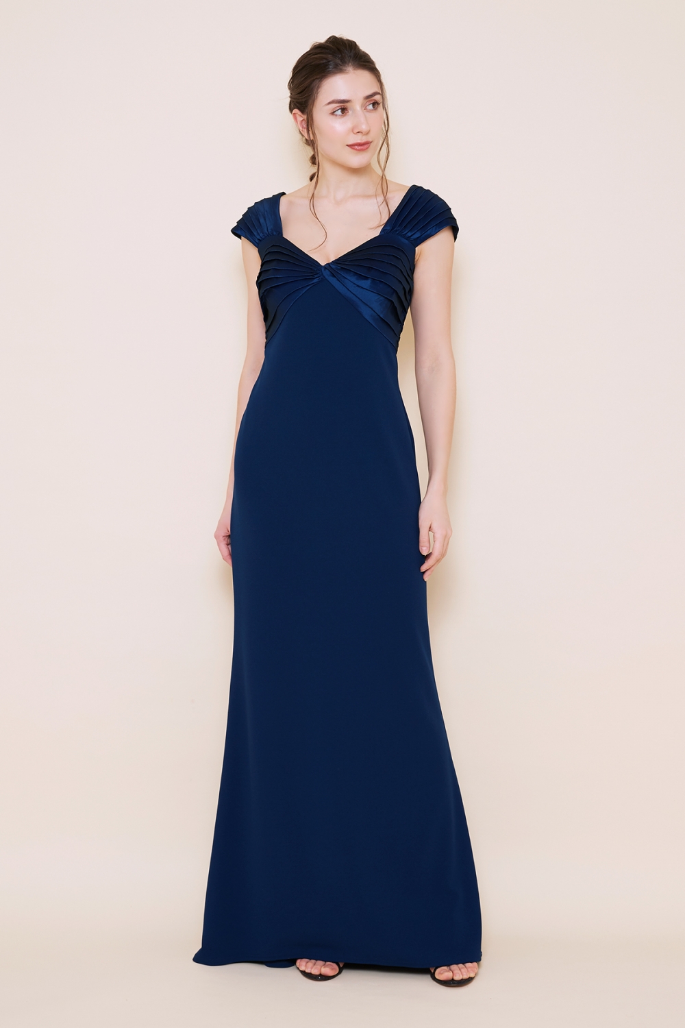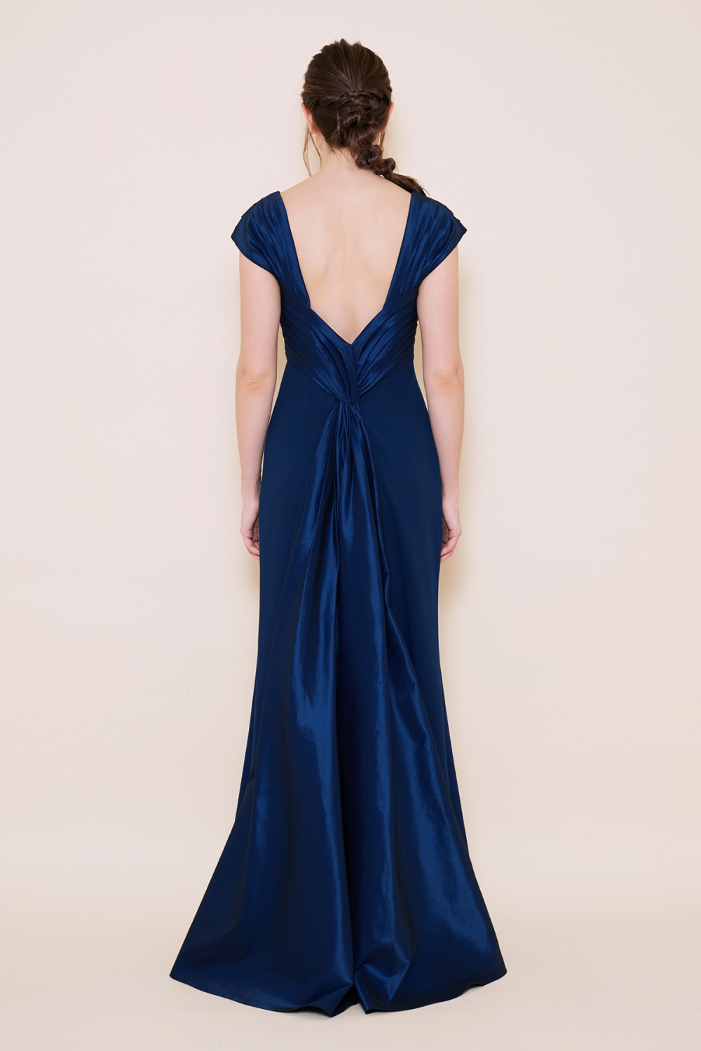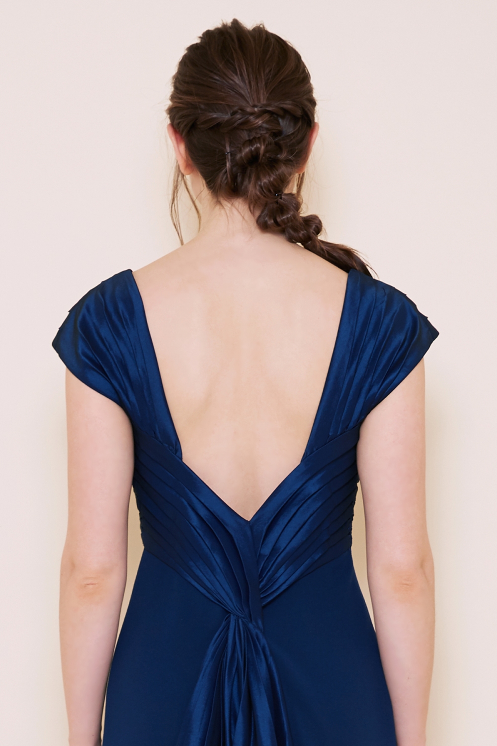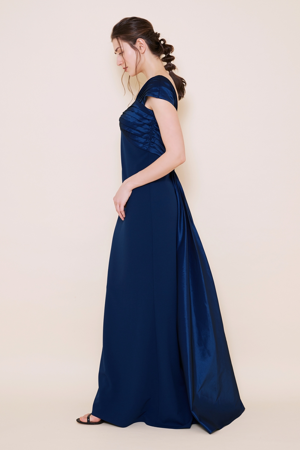 クレープジャージーとタフタを組み合わせたシンプルながらも洗練されたデザインが特徴的なロングドレス。優れた伸縮性を持つクレープジャージーは動きやすく快適な着心地が魅力です。大胆に開いたバックスタイルが女性らしいセクシーさと華やかさを演出し、ドレス全体の印象を引き立てます。胸元を飾る光沢のあるタフタはそのまま流れるようにバックスタイルへと続きトレーンとなり、後姿を美しく見せます。シンプルなデザインゆえにジュエリーとの相性も良く、輝きが際立ちます。