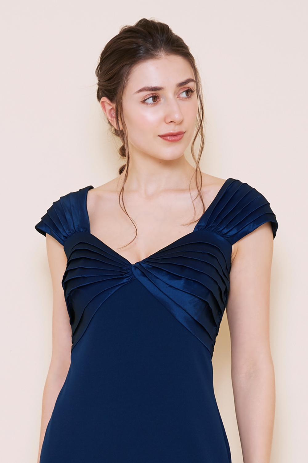 クレープジャージーとタフタを組み合わせたシンプルながらも洗練されたデザインが特徴的なロングドレス。優れた伸縮性を持つクレープジャージーは動きやすく快適な着心地が魅力です。大胆に開いたバックスタイルが女性らしいセクシーさと華やかさを演出し、ドレス全体の印象を引き立てます。胸元を飾る光沢のあるタフタはそのまま流れるようにバックスタイルへと続きトレーンとなり、後姿を美しく見せます。シンプルなデザインゆえにジュエリーとの相性も良く、輝きが際立ちます。 モデルサイズ 身長171cm B:82cm W:57cm H:89cm /サイズ2着用 ■新作商品一覧はこちら■ □ロングドレス一覧はこちら□ ■ネイビーの商品一覧はこちら■