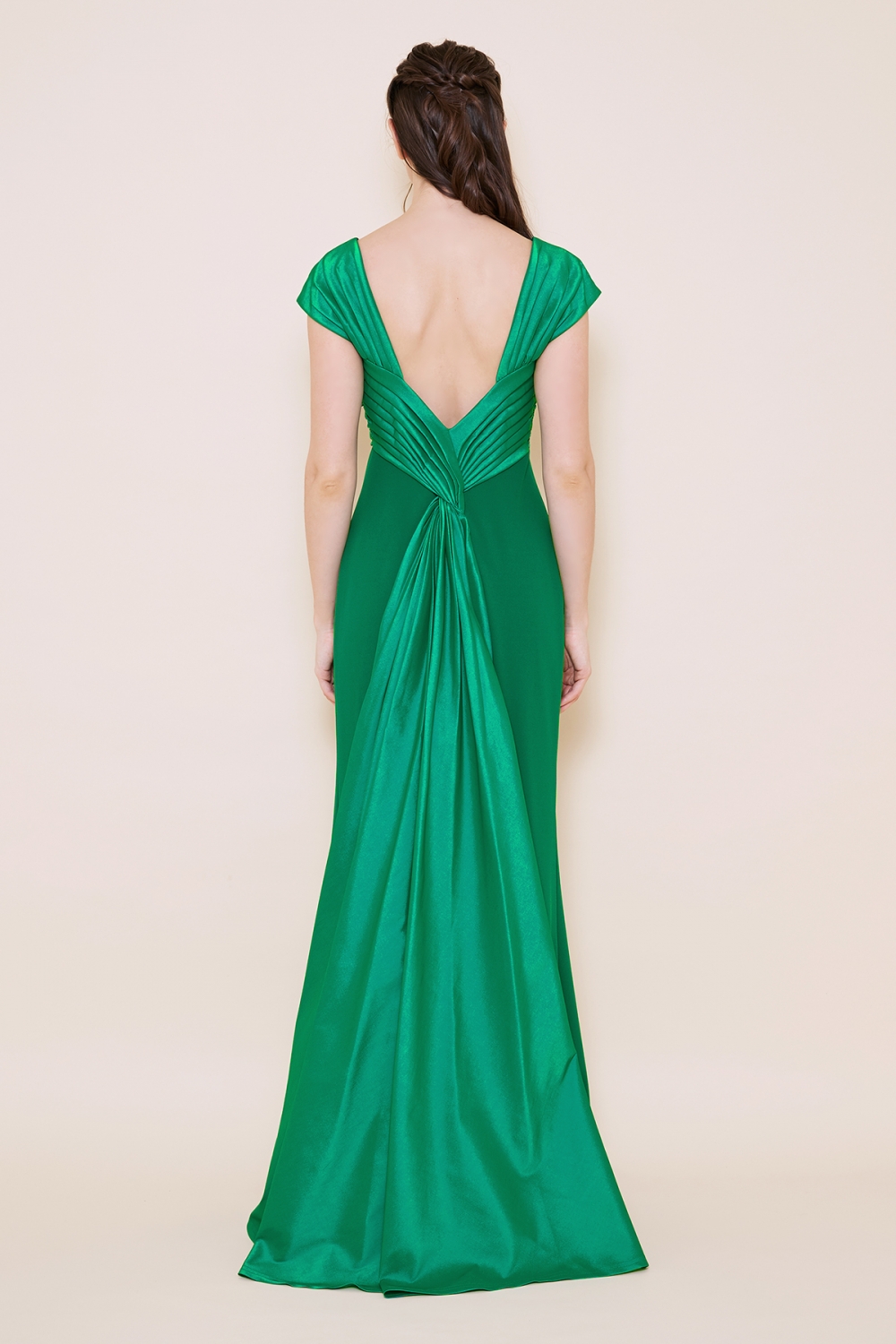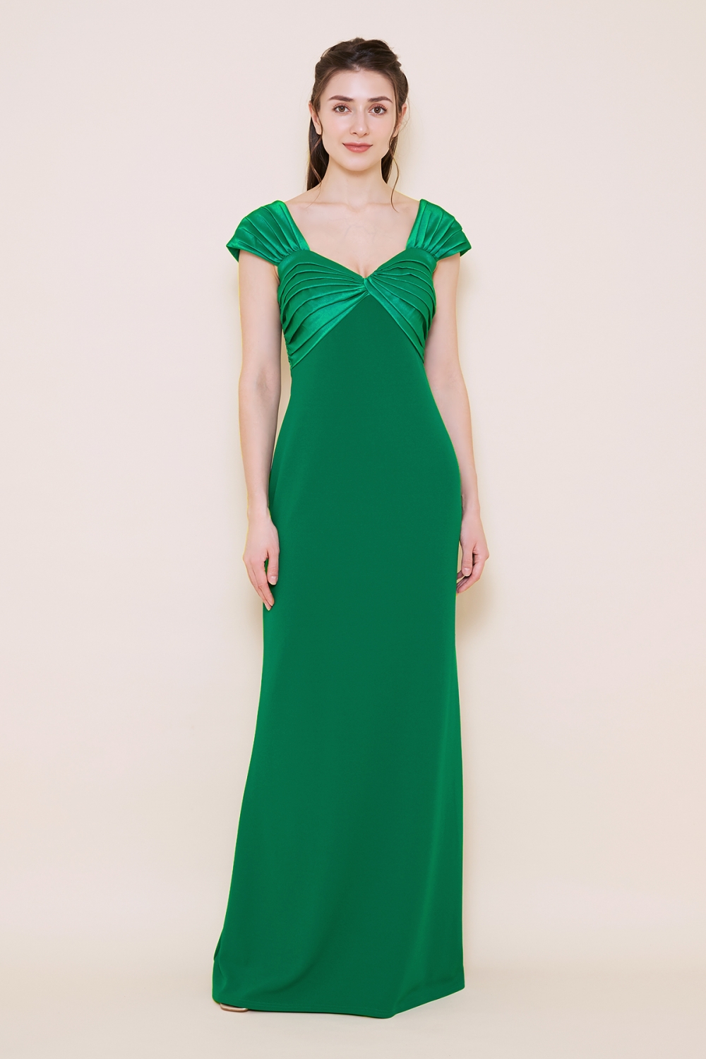 クレープジャージーとタフタを組み合わせたシンプルながらも洗練されたデザインが特徴的なロングドレス。優れた伸縮性を持つクレープジャージーは動きやすく快適な着心地が魅力です。大胆に開いたバックスタイルが女性らしいセクシーさと華やかさを演出し、ドレス全体の印象を引き立てます。胸元を飾る光沢のあるタフタはそのまま流れるようにバックスタイルへと続きトレーンとなり、後姿を美しく見せます。シンプルなデザインゆえにジュエリーとの相性も良く、輝きが際立ちます。 モデルサイズ 身長171cm B:82cm W:57cm H:89cm /サイズ2着用 ■新作商品一覧はこちら■ □ロングドレス一覧はこちら□ ■グリーンの商品一覧はこちら■