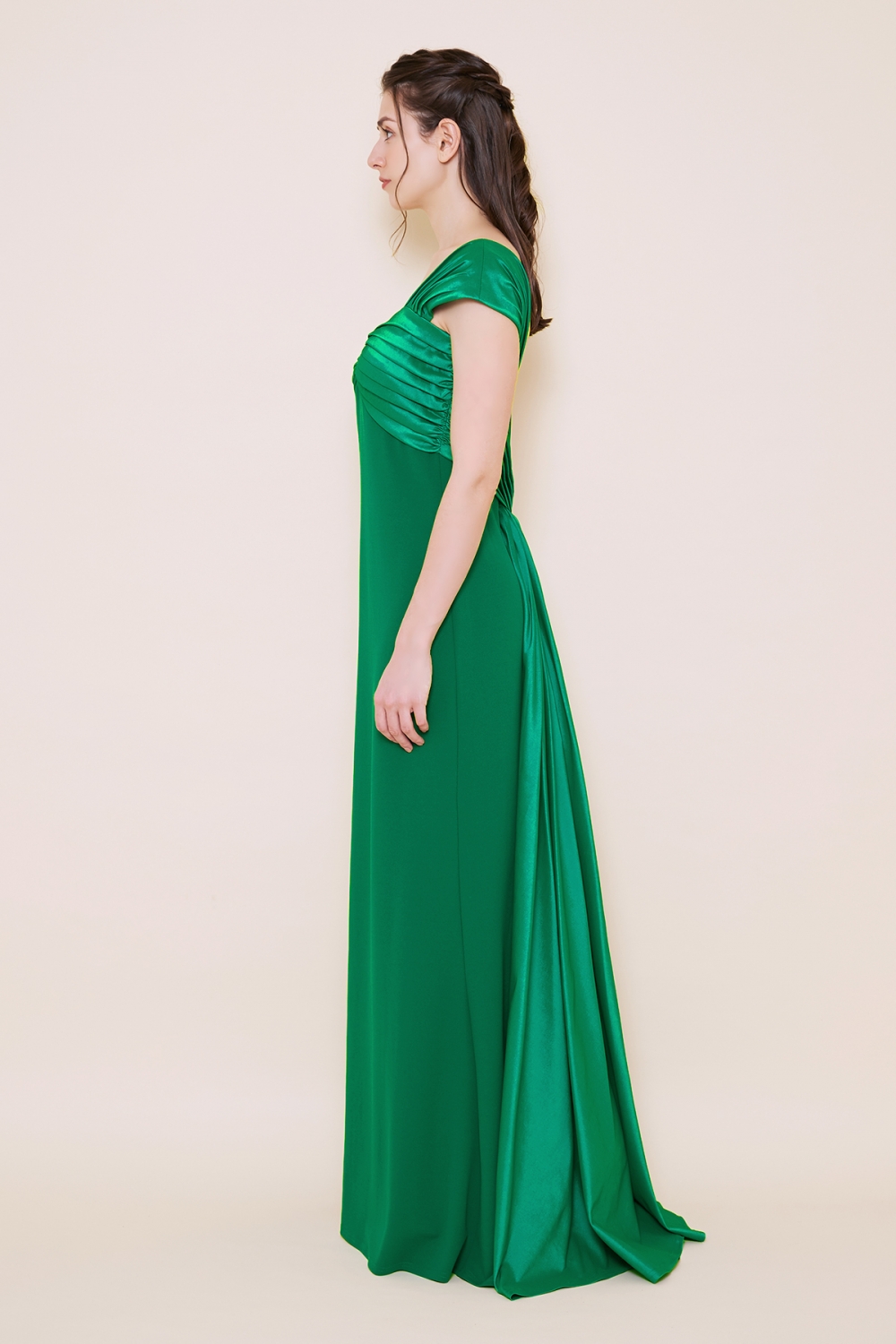 クレープジャージーとタフタを組み合わせたシンプルながらも洗練されたデザインが特徴的なロングドレス。優れた伸縮性を持つクレープジャージーは動きやすく快適な着心地が魅力です。大胆に開いたバックスタイルが女性らしいセクシーさと華やかさを演出し、ドレス全体の印象を引き立てます。胸元を飾る光沢のあるタフタはそのまま流れるようにバックスタイルへと続きトレーンとなり、後姿を美しく見せます。シンプルなデザインゆえにジュエリーとの相性も良く、輝きが際立ちます。