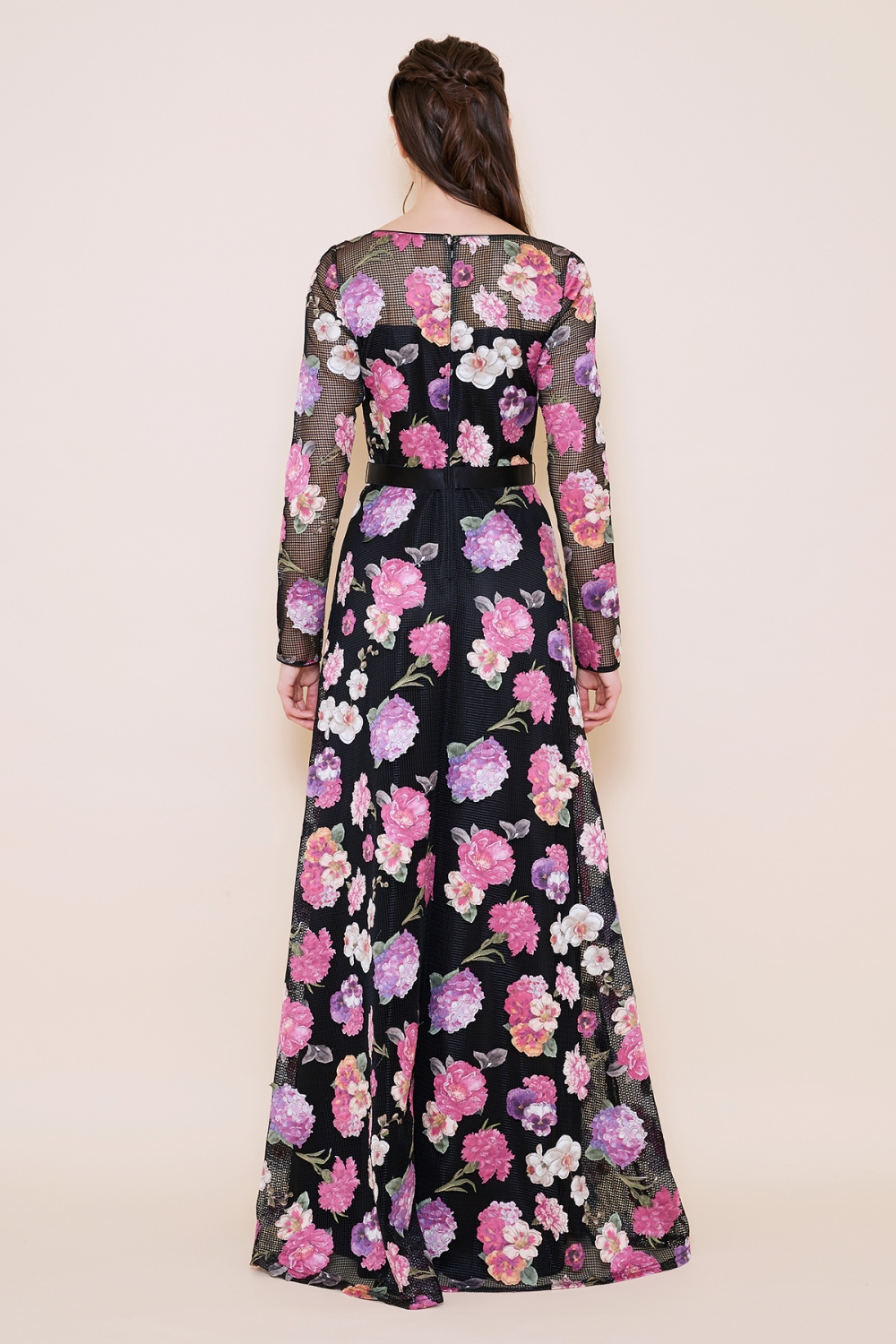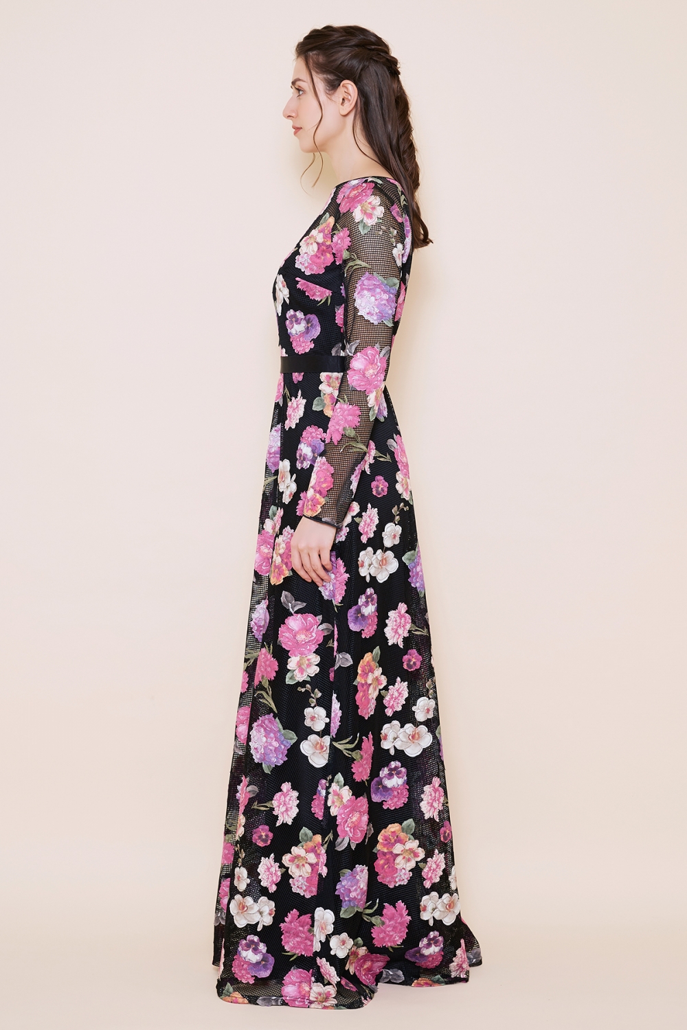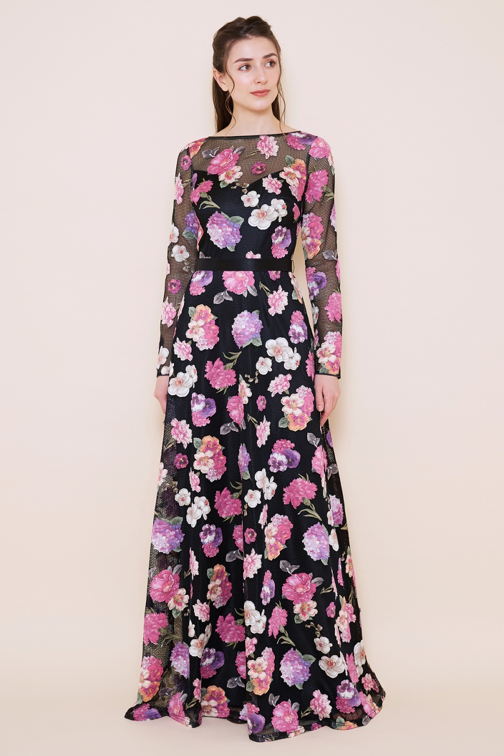 メッシュ生地に一つ一つ丁寧に縫い付けた、まるで絵画のような花柄のアップリケが華やかなロングドレス。ボートネックのデザインで、首元をすっきりと美しく見せ、袖にも施されたアップリケが手元まで美しく演出します。ウエスト部分には、ストレッチリボンのウエストマークを入れることで、長袖のロングドレスでもバランスがとりやすく、スタイルアップが叶います。ボリュームのあるスカートがとてもエレガントです。パーティーやステージで、注目を集めること間違いありません。
