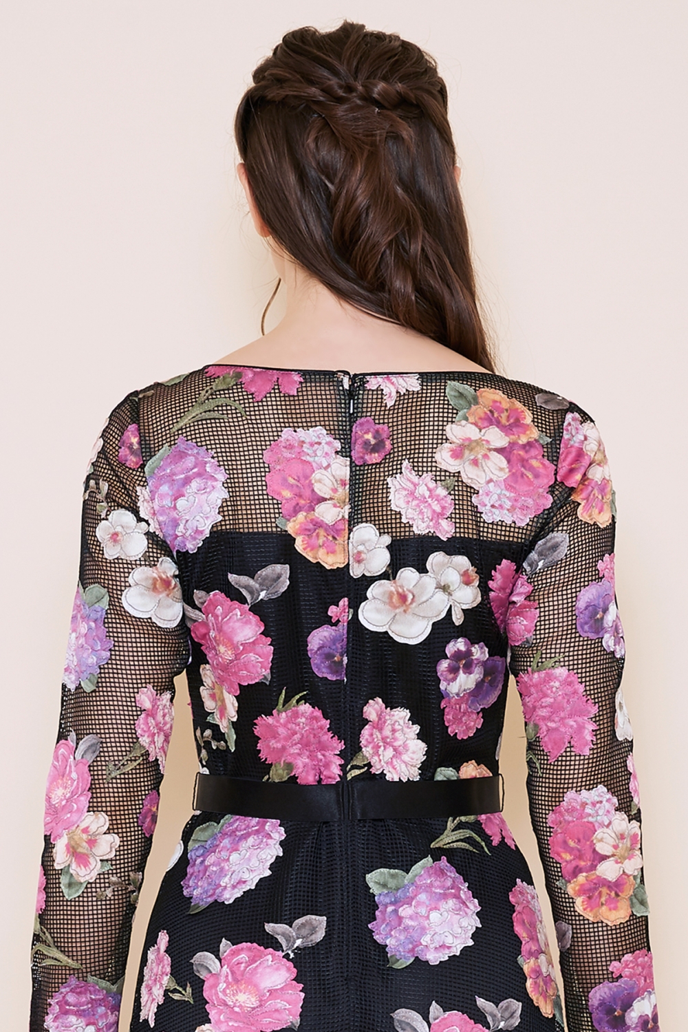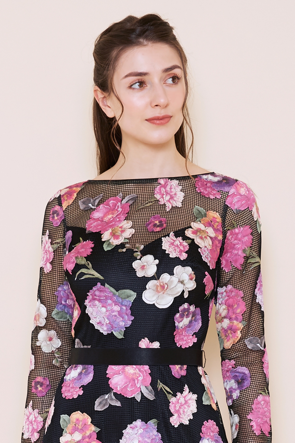 メッシュ生地に一つ一つ丁寧に縫い付けた、まるで絵画のような花柄のアップリケが華やかなロングドレス。ボートネックのデザインで、首元をすっきりと美しく見せ、袖にも施されたアップリケが手元まで美しく演出します。ウエスト部分には、ストレッチリボンのウエストマークを入れることで、長袖のロングドレスでもバランスがとりやすく、スタイルアップが叶います。ボリュームのあるスカートがとてもエレガントです。パーティーやステージで、注目を集めること間違いありません。 モデルサイズ 身長171cm B:82cm W:57cm H:89cm /サイズ2着用 ■新作商品一覧はこちら■ □ロングドレス一覧はこちら□ ■ブラックの商品一覧はこちら■