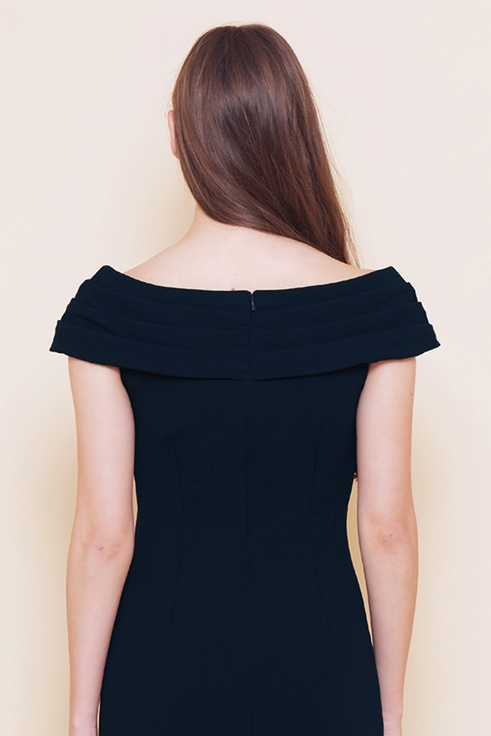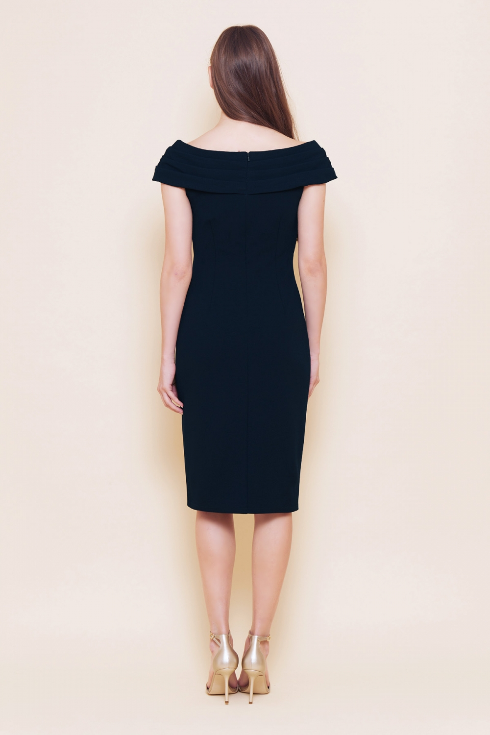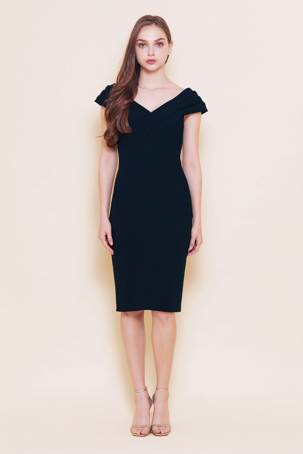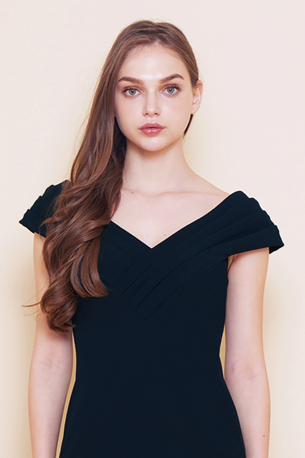 クレープジャージーのミディアムドレス。鎖骨を美しく見せるVネックラインに肩を華奢に見せるキャップスリーブでシンプルながら、エレガントな雰囲気です。ジャケットを羽織ってオフィスに、夜はジャケットを脱いでディナーやパーティーへと、様々なオケージョンで活躍します。